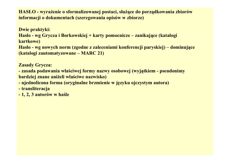 HASŁO - wyrażenie o sformalizowanej postaci, służące do porządkowania zbiorów informacji o dokumentach (szeregowania opisów w zbiorze) Dwie praktyki: Hasło - wg Grycza i Borkowskiej + karty pomocnicze – zanikające (katalogi kartkowe) Hasło - wg nowych norm (zgodne z zaleceniami konferencji paryskiej) – dominujące (katalogi zautomatyzowane – MARC 21) Zasady Grycza: - zasada podawania właściwej formy nazwy osobowej (wyjątkiem - pseudonimy bardziej znane aniżeli właściwe nazwisko) - ujednolicona forma (oryginalne brzmienie w języku ojczystym autora) - transliteracja - 1, 2, 3 autorów w haśle Hasło tytułowe (pierwszy wyraz tytułu z pominięciem rodzajników i liczebników porządkowych) dla: - prac zbiorowych - prac anonimowych Nazwa osobowa w oryginalnym brzmieniu: El’cin Boris Nikolaevič nie: Jelcyn Borys Yeltsin Boris Nikolayevich Eltsin Boris Karta główna - pełny opis dokumentu Karty pomocnicze - odesłanie do karty głównej - odsyłacze (od formy nie przyjętej jako hasło k. głównej) - - autorskie - ogólne i szczegółowe - - tytułowe - ogólne i szczegółowe - karta cząstkowa - karta zbiorowa Odsyłacz ogólny autorski - od formy lub części nazwy osobowej, która nie tworzy hasła, od pseudonimu (anagramu) do właściwej nazwy osobowej Odsyłacz szczegółowy autorski - od drugiego i trzeciego autora, od współpracowników (red. naukowy, tłumacz, autor tekstu dodatkowego, ew. ilustrator), od drugiego i trzeciego korespondenta itp., dla rozwiązanego kryptonimu Odsyłacz ogólny tytułowy - dla haseł ksiąg biblijnych, dla oryginalnych tytułów anonimowych dzieł klasycznych Odsyłacz szczegółowy tytułowy - dla nie rozwiązanego kryptonimu, rozwiązanego kryptogramu, dla dzieł anonimowych o rozwiązanym autorstwie, dla druków o wątpliwym autorstwie, dla antologii Karta cząstkowa - dla współwydanych tekstów, dla poszczególnych tomów zbiorowego wydania dzieł jednego autora, dla wielotomowych prac zbiorowych, których tomy posiadają własne tytuły Karta zbiorowa – wykaz tomów serii Erasmus Desiderius Rotterodamus ___________________________________________________________________________________________ Wybór pism / Erazm z Rotterdamu ; przeł. [z łac.] Maria Cytowska, Edwin Jędrkiewicz, Mieczysław Mejor ; wybór, wstęp i komentarze M. Cytowska Wrocław ; Kraków : Zakład Narodowy im. Ossolińskich, 1992. - CXXXII, 459 s. ; 17 cm (Biblioteka Narodowa. Seria 2, ISSN 0406-0636 ; nr 231) ISBN 83-04-03289-9 Erazm z Rotterdamu ____________________________________________________________ zob. Erasmus Desiderius Rotterodamus Odsyłacz ogólny autorski Pałyga Edward Józef ____________________________________________________________________________________________ Nuncjusze warszawscy w XX w[ieku] / Józef M. Ogiński [pseud.] Warszawa : "Heliodor" : nakł. FAFM, 1991. - 34, [2] s. : 1 fot., 1 portr. ; 20 cm (Biblioteka Fundacji im. Andrzeja Frycza Modrzewskiego ; 1 . Historia et Politica ; 1) ISBN 83-900053-1-X ======================================================================================= Pałyga Edward Józef ____________________________________________________________________________________________ Dyplomatyczni przedstawiciele przy Stolicy Apostolskiej w XX w[ieku] / Józef M. Ogiński [pseud.] Warszawa : "Heliodor" : nakł. FAFM , 199 . - 43, [1] s. : 1 fot., 3 portr. (w tym kolor.) ; 21 cm (Biblioteka Fundacji im. Andrzeja Frycza Modrzewskiego ; 10 . Historia et Politica ; 2) ISBN 83-900920-1-8 Ogiński Józef M. [pseud.] ______________________________________________ zob. Pałyga Edward Józef [nazw.] Ods. ogólny autorski Esenin Sergej Aleksandrovič ____________________________________________________________________________________ Inonia i inne wiersze / Sergiusz Jesienin ; wybrał, przeł. [z ros.] i posłowiem opatrzył Adam Pomorski Warszawa : Młodzieżowa Agencja Wydawnicza, 1984 . - 282, [2] s. ; 17 cm ISBN 83-203-1900-5 ==================================================================================== Esenin Sergej Aleksandrovič _______________________________________________________________________________________ Czarny człowiek i inne wiersze / Sergiusz Jesienin ; [przedm. Józef Andrzej Grochowina] Warszawa : Wydaw. Bohdana Wrocławskiego, 1994 . - 221, [3] s. ; 12 cm (Poeci Świata) ISBN 83-85996-04-4 Jesienin Sergiusz ______________________________________________ zob. Esenin Sergej Aleksandrovič Falniowska- Grabowska Alicja ________________________________________________________________________________ Królewszczyzny i starostowie w dawnej Rzeczypospolitej / Alicja Falniowska-Grabowska Wrocław ; Kraków : Zakład Narodowy im. Ossolińskich, 1984 . - 63, [1] s.; 19 cm (Nauka dla Wszystkich, ISSN 0077-6181 ; nr 375) ISBN 83-04-01850-0 =================================================================================== Grabowska Alicja Falniowska ___________________________________________________________________________________ zob. Falniowska - Grabowska Alicja Odsyłacz ogólny autorski Polanowska Danuta, Tyszer Beata ___________________________________________________________________________________________ Środowisko wokół nas : gry, zabawy i ćwiczenia dla klasy III / Danuta Polanowska, Beata Tyszer Kielce : Wydaw. Pedagogiczne ZNP, 1994. - 49 s., [2] k.tabl. : rys., wykr. ; 30 cm ISBN 83-85230-29-7 ====================================================================================== Tyszer Beata [współaut.] ___________________________________________________________________________________________ zob. Polanowska Danuta, Tyszer Beata Środowisko wokół nas : gry, zabawy i ćwiczenia dla klasy III Kielce, 1994 Ods. szczegółowy autorski Cytowska Maria [tł.] __________________________________________________ zob. Erasmus Desiderius Rotterodamus Wybór pism. Wrocław ; Kraków, 1992 Ods. szczegółowy autorski Ronikierowa Maria _____________________________________________