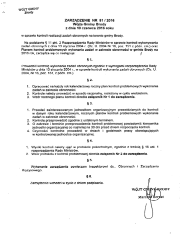 WÓJT GMINY Brody ZARZĄDZENIE NR 81 / 2016 Wójta Gminy Brody z dnia 10 czerwca 2016 roku w sprawie kontroli realizacji zadań obronnych na terenie gminy Brody. Na podstawie 511 pkt. 2 Rozporządzenia Rady Ministrów w sprawie kontroli wykonywania zadań obronnych z dnia 13 stycznia 2004 r. (Dz. U. 2004 Nr 16, poz. 151 z późn. zm.) oraz Planem kontroli problemowych wykonania zadań w zakresie obronności w gminie Brody na 2016 rok, zarządza się co następuje: Prowadzić kontrolę wykonania zadań obronnych zgodnie z wymogami rozporządzenia Rady Ministrów z dnia 13 stycznia 2004 r., w sprawie kontroli wykonania zadań obronnych (Dz. U. 2004, Nr 16, poz. 151, z późn. zm.). Opracować na każdy rok kalendarzowy roczny plan kontroli problemowych wykonania zadań w zakresie obronności. Kontrole należy prowadzić w sposób racjonalny, rozłożony w cyklu wieloletnim. Wzór rocznego planu kontroli określa załącznik Nr 1 do zarządzenia. § 3. Przesłać zainteresowanym jednostkom organizacyjnym przewidzianych do kontroli w danym roku kalendarzowym, rocznych planów kontroli problemowych wykonania zadań w zakresie obronności. Kontrolę przeprowadzić zgodnie z ustalonym terminem. O zakresie i terminie przeprowadzenia kontroli problemowej powiadomić kierownika jednostki organizacyjnej co najmniej na 30 dni przed dniem rozpoczęcia kontroli. Czynności kontrolne prowadzić w dniach i godzinach pracy obowiązujących w kontrolowanej jednostce organizacyjnej. § 4. Wyniki kontroli należy ująć w protokole pokontrolnym, zgodnie z treścią 516 ust. 1 rozporządzenia Rady Ministrów. Wzór protokołu z kontroli problemowej określa załącznik Nr 2 do zarządzenia. Wykonanie zarządzenia powierzam inspektorowi ds.. Obronnych i Zarządzania Kryzysowego. Zarządzenie wchodzi w tycie z dniem podpisania. ZATWIERDZAM: Załącznik Nr 2 do Zarządzenia Nr 81/2016 Wójta Gminy Brody z dnia 10. czerwca 2016 roku. WZÓR PROTOKÓŁ Z kontroli problemowej wykonywania zadań obronnych W: (nazwa i adres kontrolowanego zakładu pracy) 1. Kontrole przeprowadził (li) : Podstawy prawne: Kontrolę rozpoczęto i zakończono w dniu • 2016 roku. Zakres kontroli: 4.1 Wnioski i zalecenia pokontrolne: 5.1 W świetle obowiązujących przepisów prawnych oraz wytycznych i ustaleń w zakresie kontrolowanej działalności stwierdzono 5.2 Kontrolę przeprowadzono w obecności: (imię i nazwisko oraz funkcja pełniona w kontrolowanym zakładzie pracy) Postanowienia końcowe: 7.1 Protokół sporządzono w dwóch jednobrzmiących egzemplarzach, po jednym egzemplarzu dla każdej ze stron. 7.2 Kontrolowana osoba może odmówić podpisania protokołu kontroli, składając w terminie 14 dni od dnia jego otrzymania wyjaśnienie przyczyn tej odmowy. Z protokołem zapoznałem się: Podpis kontrolującego(cych): (imię i nazwisko, podpis) 2) (data i miejscowość) Załącznik Nr 1 do Zarządzenia Nr 81/2016 Wójta Gminy Brody z dnia 10 czerwca 2016 roku. Plan kontroli problemowych wykonywania zadań obronnych w gminie Brody na 2016 rok LP. ZAKRES PODMIOTOWY ZAKRES PRZEDMIOTOWY Wykonywanie zadań wynikających z ustawy z dnia 21 listopada 1967 r." o powszechnym obowiązku obrony Rzeczypospolitej Polskiej" (tekst jednolity Dz. U. z 2015 r. poz. 827) Wykonywanie wynikających zadań z ustawy z dnia 21 listopada 1967 r. obrony "o powszechnym obowiązku i aktów Rzeczypospolitej Polskiej" wykonawczych wydanych na jej podstawie": Publiczne Gimnazjum w Krynkach Zagadnienie 3 TERMIN KONTROLI Czerwiec (z PLANU kontroli problemowych...) Referat Organizacyjny Zagadnienie 1,2,3,5. (z PLANU kontroli problemowych...) 1. Sprawy organizacyjne Termin kontroli: - Publiczne Gimnazjum w '<rynkach — 30.06.2016 r. - Referat Organizacyjny UG Brody— 28.10.2016 r. Październik SKŁAD ZESPOŁU KONTROLNEGO Monika Sadowska Inspektor ds. Obronnych i Zarządzania Kryzysowego Kierownik Monika Barańska Inspektor ds. Obronnych i Zarządzania Kryzysowego