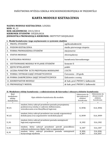 PAŃSTWOWA WYŻSZA SZKOŁA WSCHODNIOEUROPEJSKA W PRZEMYŚLU KARTA MODUŁU KSZTAŁCENIA NAZWA MODUŁU KSZTAŁCENIA: LOGIKA KOD: M_12 ROK AKADEMICKI: 2013/2014 KIERUNEK STUDIÓW: SOCJOLOGIA JEDNOSTKA PROWADZĄCA KIERUNEK: INSTYTUT SOCJOLOGII I. Moduł kształcenia i jego usytuowanie w systemie studiów 1. PROFIL STUDIÓW ogólnoakademicki 2. POZIOM KSZTAŁCENIA studia pierwszego stopnia 3. FORMA PROWADZENIA STUDIÓW stacjonarne 4. STATUS MODUŁU obowiązkowy 5. KATEGORIA MODUŁU kształcenia kierunkowego 6. USYTUOWANIE MODUŁU W PLANIE STUDIÓW Semestr II 7. JĘZYK WYKŁADOWY polski 8. LICZBA PUNKTÓW ECTS PRZYPISANA MODUŁOWI 2 ECTS 9. FORMA I WYMIAR ZAJĘĆ DYDAKTYCZNYCH Ćwiczenia – 20 godz. 10. FORMA ZAKOŃCZENIA ZAJĘĆ DYDAKTYCZNYCH Zaliczenie z oceną 11. KOORDYNATOR MODUŁU dr hab. prof. PWSW S. Gałkowski 12. PROWADZĄCY MODUŁ dr hab. prof. PWSW S. Gałkowski II. Modułowe efekty kształcenia z odniesieniem do kierunku i obszaru efektów kształcenia Kod modułowe efekty kształcenia Opis efektów kształcenia dla modułu Odniesienie do kierunkowych efektów kształcenia Odniesienie do obszarowych efektów kształcenia 2 3 4 K_W06 S1A_W06 W_02 student, który zaliczył przedmiot zna zasady argumentacji dedukcyjnej oraz argumentów niededukcyjnych K_W09 S1A_W09 U_01 student, który zaliczył przedmiot posiada umiejętność logicznej argumentacji K_U02 S1A_U02 K_U07 S1A_U07 K_K06 K_K07 S1A_K06 S1A_K07 1 W_01 U_02 K_01 student, który zaliczył przedmiot posiada przynajmniej podstawową wiedzę w zakresie definiowania , wnioskowania oraz klasyfikacji logicznej student, który zaliczył przedmiot potrafi prawidłowo wskazać podstawowe błędy i luki w argumentacji student, który zaliczył przedmiot posiada umiejętność krytycznego myślenia student, który zaliczył przedmiot potrafi w sposób logiczny i przekonywujący uzasadnić zajmowane przez siebie stanowisko student, który zaliczył przedmiot posiadł umiejętność samodzielnego (choć trochę) myślenia K_02 K_03 K_K06 K_K07 S1A_K06 S1A_K07 K_K06 K_K07 S1A_K06 S1A_K07 III. Treści kształcenia – oddzielnie dla każdej formy zajęć dydaktycznych (W – wykład; C - ćwiczenia; K – konwersatorium; L - laboratorium; PR – projekt, PKZ - praktyka zawodowa; WT – Warsztaty) Kod form zajęć dydaktyczny ch 1 C1 C2 C3 C4 C5 C6 C7 C8 C9 C10 Szczegółowy opis treści realizowanych w ramach zajęć wg form zajęć dydaktycznych Liczba godzin 2 3 Konwersatorium Pojęcie nauki, warunki naukowości, podstawowe rodzaje wnioskowania, Pojęcie logiki, kategorie składniowe wyrażeń, wynikanie logiczne, schemat formalny Nazwy. pojecie nazwy, nazwy konkretne i nazwy abstrakcyjne. Desygnat nazwy. Nazwy indywidualne generalne, zakres nazwy, ostrość zakresu, stosunki między zakresami nazw. Funktory rachunku zdań Definicje: pojęcie, rodzaje, budowa, zasady poprawności. Rodzaje definicji ze względu na zadania i budowę. Przykłady najczęściej spotykanych w definicjach błędów Kwadrat logiczny, konwersja, obwersja i kontrapozycja zdań. Pojęcie podziału logicznego, Warunki poprawności podziału logicznego. Klasyfikacja Wypowiedź argumentacyjna, argument, diagram argumentu, związki między przesłankami a konkluzją , argument dedukcyjny Materialna i formalna poprawność argumentu, interpretacja przesłanek i konkluzji Ocena argumentów niededukcyjnych, Argumenty semantyczne kolokwium zaliczeniowe Razem 2 2 3 2 2 2 2 2 2 1 20 IV. Literatura podstawowa i uzupełniająca obowiązująca do zaliczenia modułu Literatura podstawowa: 1. Ludwik Borkowski, Elementy logiki formalnej PWN Warszawa 1980 2. Teresa Hołówka, Kultura logiczna w przykładach PWN Warszawa 2006 3. Krzysztof Szymanek, Krzysztof A. Wieczorek, Andrzej S. Wójcik, Sztuka argumentacji PWN Warszawa 2004 4. Zygmunt Ziembiński, Logika praktyczna PWN Warszawa 1994 Literatura uzupełniająca: 1. Ajdukiewicz K., Zarys logiki, PZWS, Warszawa 1960 2. Bocheński J. M., Współczesne metody myślenia, Wydawnictwo „W drodze”, Poznań 1992 3. Łubnicki N., Nauka poprawnego myślenia, PWN Warszawa 1987 . 4. Kotarbiński T., Elementy logiki formalnej i metodologii nauk, PWN Warszawa 1986 5. Kwiatkowski T., Logika ogólna, Wydawnictwo Uniwersytetu Marii Curie-Skłodowskiej, Lublin 1998. 6. Stanosz B., Ćwiczenia z logiki, PWN, 1999 Warszawa1999