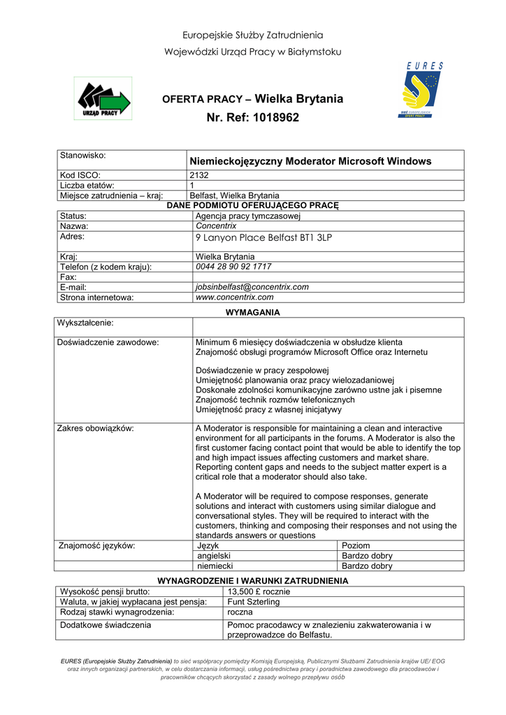 Europejskie SłuŜby Zatrudnienia Wojewódzki Urząd Pracy w Białymstoku OFERTA PRACY – Wielka Brytania Nr. Ref: 1018962 Stanowisko: Kod ISCO: Liczba etatów: Miejsce zatrudnienia – kraj: Status: Nazwa: Adres: Kraj: Telefon (z kodem kraju): Fax: E-mail: Strona internetowa: Niemieckojęzyczny Moderator Microsoft Windows 2132 1 Belfast, Wielka Brytania DANE PODMIOTU OFERUJĄCEGO PRACĘ Agencja pracy tymczasowej Concentrix 9 Lanyon Place Belfast BT1 3LP Wielka Brytania 0044 28 90 92 1717 [email protected] www.concentrix.com WYMAGANIA Wykształcenie: Doświadczenie zawodowe: Minimum 6 miesięcy doświadczenia w obsłudze klienta Znajomość obsługi programów Microsoft Office oraz Internetu Doświadczenie w pracy zespołowej Umiejętność planowania oraz pracy wielozadaniowej Doskonałe zdolności komunikacyjne zarówno ustne jak i pisemne Znajomość technik rozmów telefonicznych Umiejętność pracy z własnej inicjatywy Zakres obowiązków: Znajomość języków: A Moderator is responsible for maintaining a clean and interactive environment for all participants in the forums. A Moderator is also the first customer facing contact point that would be able to identify the top and high impact issues affecting customers and market share. Reporting content gaps and needs to the subject matter expert is a critical role that a moderator should also take. A Moderator will be required to compose responses, generate solutions and interact with customers using similar dialogue and conversational styles. They will be required to interact with the customers, thinking and composing their responses and not using the standards answers or questions Język Poziom angielski Bardzo dobry niemiecki Bardzo dobry WYNAGRODZENIE I WARUNKI ZATRUDNIENIA Wysokość pensji brutto: 13,500 £ rocznie Waluta, w jakiej wypłacana jest pensja: Funt Szterling Rodzaj stawki wynagrodzenia: roczna Dodatkowe świadczenia Pomoc pracodawcy w znalezieniu zakwaterowania i w przeprowadzce do Belfastu. EURES (Europejskie SłuŜby Zatrudnienia) to sieć współpracy pomiędzy Komisją Europejską, Publicznymi SłuŜbami Zatrudnienia krajów UE/ EOG oraz innych organizacji partnerskich, w celu dostarczania informacji, usług pośrednictwa pracy i poradnictwa zawodowego dla pracodawców i pracowników chcących skorzystać z zasady wolnego przepływu osób Nazwa firmy, z którą zostanie podpisana umowa: Rodzaj umowy: Wymiar czasu pracy Concentrix Na stałe Pełen etat 40 godzin tygodniowo SPOSÓB SKŁADANIA WNIOSKU Wymagane dokumenty (list motywacyjny, CV itp.): Język, w którym muszą być sporządzone przedkładane dokumenty: Do kogo naleŜy wysłać dokumenty: (do pracodawcy/ doradcy EURES) Gdzie naleŜy wysłać dokumenty: Dane teleadresowe doradcy EURES lub przedstawiciela pracodawcy: (nazwisko, adres, telefon, fax, e-mail itp.) CV angielski Do pracodawcy [email protected] Z dopiskiem: German Speaking Microsoft Windows Live Moderator Lisa Lindsay [email protected] 0044 2890 252 134 DODATKOWE INFORMACJE Dokumenty, spełniające warunki formalne, zostaną przekazane pracodawcy, który skontaktuje się z wybranymi kandydatami. WAśNOŚĆ Termin przedkładania podań o pracę / zakończenia waŜności oferty: Do odwołania Agencja pracy tymczasowej Concentrix, oświadczyła, Ŝe prowadzi działalność zgodnie z przepisami obowiązującymi w swoim kraju. Uprzejmie informujemy, Ŝe skontaktujemy się wyłącznie z wybranymi kandydatami. UWAGA: 1. Umowa z zagranicznym pracodawcą zostanie zawarta zgodnie z prawem kraju zatrudnienia. Oznacza to, Ŝe wszystkie roszczenia odnośnie do warunków, które obejmuje umowa, moŜna kierować wyłącznie do odpowiedniego sądu w kraju zatrudnienia. Publiczne słuŜby zatrudnienia (EURES) nie mogą pośredniczyć ani reprezentować pracownika w sądzie kraju zatrudnienia w przypadku sporu z pracodawcą. 2. Publiczne słuŜby zatrudnienia (EURES) dokładają wszelkich starań, aby zapewnić rzetelność i wiarygodność ofert pracy zgłoszonych w lokalnym urzędzie pracy. NaleŜy wyjaśnić, Ŝe oferta pracy została zgłoszona przez stronę trzecią i EURES nie odpowiada za ewentualne rozbieŜności między warunkami pracy określonymi w ofercie pracy i warunkami oferowanymi przez potencjalnego pracodawcę. 3. Publiczne słuŜby zatrudnienia (EURES) informują, Ŝe będą zbierać, przetwarzać i przekazywać potencjalnym pracodawcom zgodnie z przepisami dotyczącymi ochrony danych osobowych wszystkie dane osobowe dostarczone przez osoby poszukujące pracy. EURES (Europejskie SłuŜby Zatrudnienia) to sieć współpracy pomiędzy Komisją Europejską, Publicznymi SłuŜbami Zatrudnienia krajów UE/ EOG oraz innych organizacji partnerskich, w celu dostarczania informacji, usług pośrednictwa pracy i poradnictwa zawodowego dla pracodawców i pracowników chcących skorzystać z zasady wolnego przepływu osób