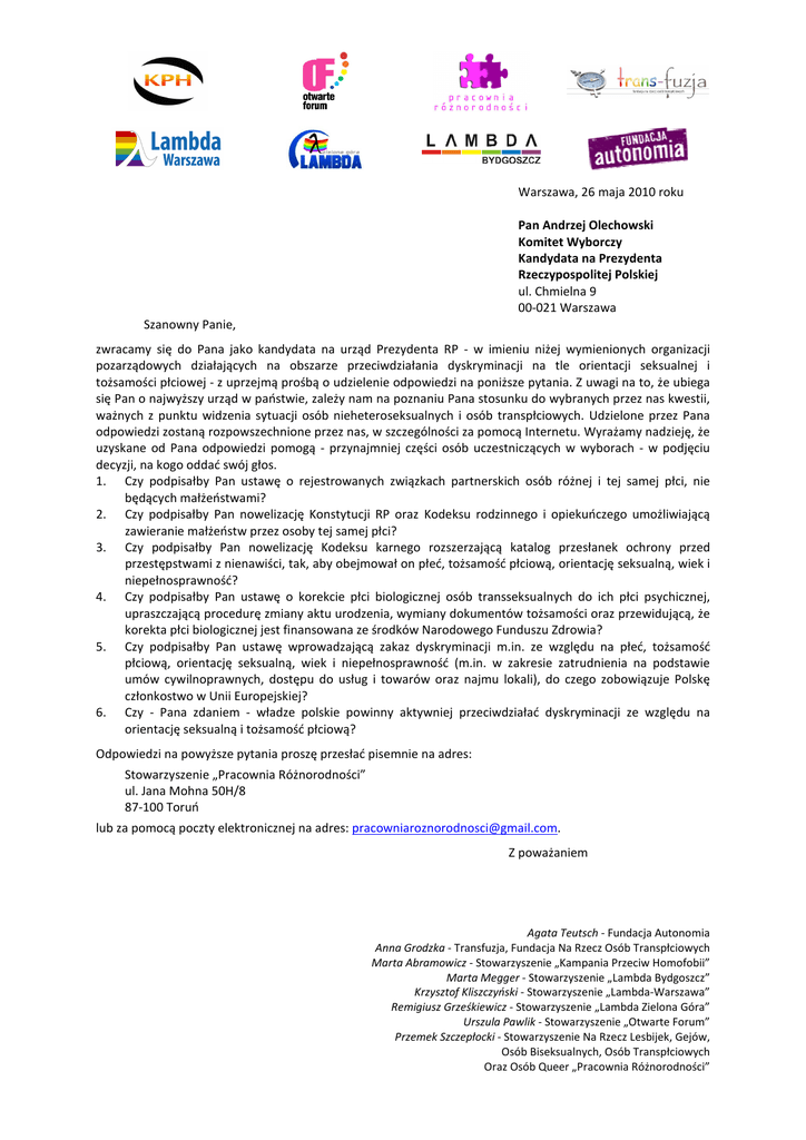 Warszawa, 26 maja 2010 roku Pan Andrzej Olechowski Komitet Wyborczy Kandydata na Prezydenta Rzeczypospolitej Polskiej ul. Chmielna 9 00-021 Warszawa Szanowny Panie, zwracamy się do Pana jako kandydata na urząd Prezydenta RP - w imieniu niżej wymienionych organizacji pozarządowych działających na obszarze przeciwdziałania dyskryminacji na tle orientacji seksualnej i tożsamości płciowej - z uprzejmą prośbą o udzielenie odpowiedzi na poniższe pytania. Z uwagi na to, że ubiega się Pan o najwyższy urząd w państwie, zależy nam na poznaniu Pana stosunku do wybranych przez nas kwestii, ważnych z punktu widzenia sytuacji osób nieheteroseksualnych i osób transpłciowych. Udzielone przez Pana odpowiedzi zostaną rozpowszechnione przez nas, w szczególności za pomocą Internetu. Wyrażamy nadzieję, że uzyskane od Pana odpowiedzi pomogą - przynajmniej części osób uczestniczących w wyborach - w podjęciu decyzji, na kogo oddać swój głos. 1. Czy podpisałby Pan ustawę o rejestrowanych związkach partnerskich osób różnej i tej samej płci, nie będących małżeństwami? 2. Czy podpisałby Pan nowelizację Konstytucji RP oraz Kodeksu rodzinnego i opiekuńczego umożliwiającą zawieranie małżeństw przez osoby tej samej płci? 3. Czy podpisałby Pan nowelizację Kodeksu karnego rozszerzającą katalog przesłanek ochrony przed przestępstwami z nienawiści, tak, aby obejmował on płeć, tożsamość płciową, orientację seksualną, wiek i niepełnosprawność? 4. Czy podpisałby Pan ustawę o korekcie płci biologicznej osób transseksualnych do ich płci psychicznej, upraszczającą procedurę zmiany aktu urodzenia, wymiany dokumentów tożsamości oraz przewidującą, że korekta płci biologicznej jest finansowana ze środków Narodowego Funduszu Zdrowia? 5. Czy podpisałby Pan ustawę wprowadzającą zakaz dyskryminacji m.in. ze względu na płeć, tożsamość płciową, orientację seksualną, wiek i niepełnosprawność (m.in. w zakresie zatrudnienia na podstawie umów cywilnoprawnych, dostępu do usług i towarów oraz najmu lokali), do czego zobowiązuje Polskę członkostwo w Unii Europejskiej? 6. Czy - Pana zdaniem - władze polskie powinny aktywniej przeciwdziałać dyskryminacji ze względu na orientację seksualną i tożsamość płciową? Odpowiedzi na powyższe pytania proszę przesłać pisemnie na adres: Stowarzyszenie „Pracownia Różnorodności” ul. Jana Mohna 50H/8 87-100 Toruń lub za pomocą poczty elektronicznej na adres: [email protected]. Z poważaniem Agata Teutsch - Fundacja Autonomia Anna Grodzka - Transfuzja, Fundacja Na Rzecz Osób Transpłciowych Marta Abramowicz - Stowarzyszenie „Kampania Przeciw Homofobii” Marta Megger - Stowarzyszenie „Lambda Bydgoszcz” Krzysztof Kliszczyński - Stowarzyszenie „Lambda-Warszawa” Remigiusz Grześkiewicz - Stowarzyszenie „Lambda Zielona Góra” Urszula Pawlik - Stowarzyszenie „Otwarte Forum” Przemek Szczepłocki - Stowarzyszenie Na Rzecz Lesbijek, Gejów, Osób Biseksualnych, Osób Transpłciowych Oraz Osób Queer „Pracownia Różnorodności”