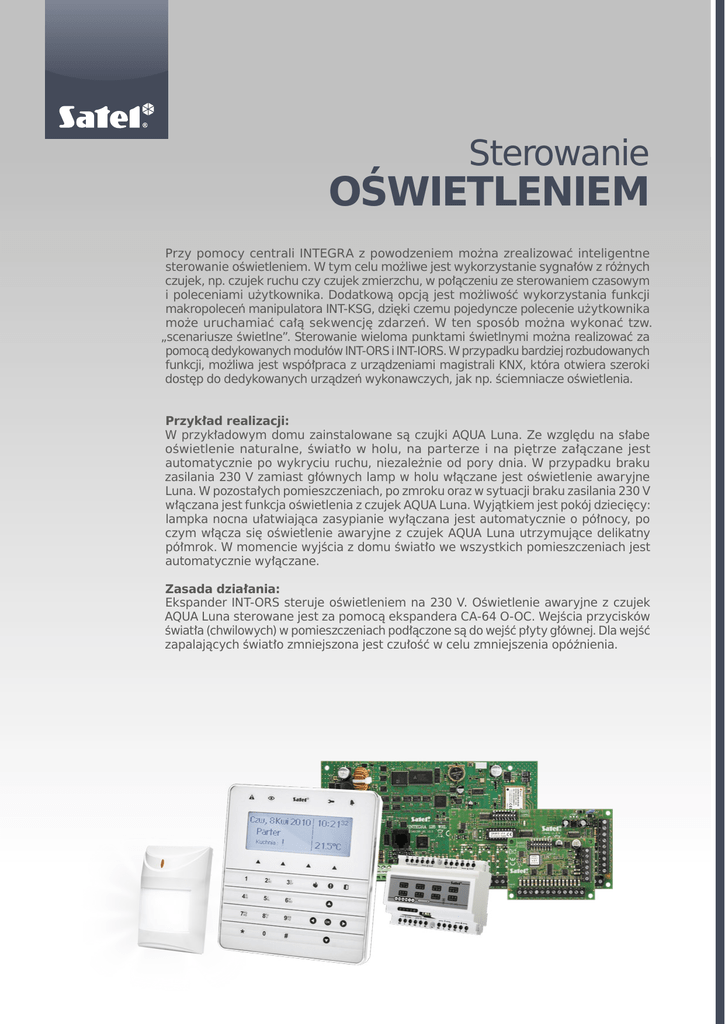 Sterowanie OŚWIETLENIEM Przy pomocy centrali INTEGRA z powodzeniem można zrealizować inteligentne sterowanie oświetleniem. W tym celu możliwe jest wykorzystanie sygnałów z różnych czujek, np. czujek ruchu czy czujek zmierzchu, w połączeniu ze sterowaniem czasowym i poleceniami użytkownika. Dodatkową opcją jest możliwość wykorzystania funkcji makropoleceń manipulatora INT-KSG, dzięki czemu pojedyncze polecenie użytkownika może uruchamiać całą sekwencję zdarzeń. W ten sposób można wykonać tzw. „scenariusze świetlne”. Sterowanie wieloma punktami świetlnymi można realizować za pomocą dedykowanych modułów INT-ORS i INT-IORS. W przypadku bardziej rozbudowanych funkcji, możliwa jest współpraca z urządzeniami magistrali KNX, która otwiera szeroki dostęp do dedykowanych urządzeń wykonawczych, jak np. ściemniacze oświetlenia. Przykład realizacji: W przykładowym domu zainstalowane są czujki AQUA Luna. Ze względu na słabe oświetlenie naturalne, światło w holu, na parterze i na piętrze załączane jest automatycznie po wykryciu ruchu, niezależnie od pory dnia. W przypadku braku zasilania 230 V zamiast głównych lamp w holu włączane jest oświetlenie awaryjne Luna. W pozostałych pomieszczeniach, po zmroku oraz w sytuacji braku zasilania 230 V włączana jest funkcja oświetlenia z czujek AQUA Luna. Wyjątkiem jest pokój dziecięcy: lampka nocna ułatwiająca zasypianie wyłączana jest automatycznie o północy, po czym włącza się oświetlenie awaryjne z czujek AQUA Luna utrzymujące delikatny półmrok. W momencie wyjścia z domu światło we wszystkich pomieszczeniach jest automatycznie wyłączane. Zasada działania: Ekspander INT-ORS steruje oświetleniem na 230 V. Oświetlenie awaryjne z czujek AQUA Luna sterowane jest za pomocą ekspandera CA-64 O-OC. Wejścia przycisków światła (chwilowych) w pomieszczeniach podłączone są do wejść płyty głównej. Dla wejść zapalających światło zmniejszona jest czułość w celu zmniejszenia opóźnienia. Sterowanie OŚWIETLENIEM konfiguracja wejść ••• ••• konfiguracja wyjść ••• www.satel.pl (IND_0312) ul. Franciszka Schuberta 79, 80-172 Gdańsk tel.: (58) 320 94 00; fax: (58) 320 94 01 e-mail: [email protected]