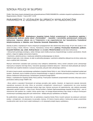 SZKOŁA POLICJI W SŁUPSKU Źródło: http://www.slupsk.szkolapolicji.gov.pl/sps/aktualnosci/70405,PARAMEDYK-z-udzialem-slupskich-wykladowcow.html Wygenerowano: Wtorek, 7 marca 2017, 12:29 PARAMEDYK Z UDZIAŁEM SŁUPSKICH WYKŁADOWCÓW Wykładowcy słupskiej Szkoły Policji uczestniczyli w charakterze sędziów i wykładowców podczas piątej edycji „Paramedyka” - zawodów i warsztatów poświęconych medycynie taktycznej. Impreza odbyła się w Trójmieście a jej organizatorem był Samodzielny Pododdział Antyterrorystyczny w Gdańsku oraz Pomorska Komenda Wojewódzka Policji. Zawody to jedna z największych imprez związanych propagowaniem idei ratownictwa taktycznego. W tym roku wzięły w nich udział 23 ekipy z Polski, Niemiec i Ukrainy. Wykładowcy Szkoły Policji: podinsp. Przemysław Osadowski, podkom. Krzysztof Zieliński, asp. sztab. Andrzej Kaczor oraz st.sierż. Michał Kurdziel oceniali dwie konkurencje: - Zatrzymanie groźnego przestępcy, wobec którego użyto środka przymusu bezpośredniego w postaci paralizatora. Doszło jednak u niego do nagłego zatrzymania krążenia. - Uwolnienie, udzielnie pomocy i ewakuacja zakładnika przebywającego na okręcie. Zadanie drugie było o tyle ciekawe, że atak na jednostkę pływającą i uwolnienie zakładnika odbywał się od strony wody przy użyciu szybkiej łodzi motorowej. Ważnym elementem zawodów była symulacja akcji odbijania zakładników, którzy zostali uwięzieni przez uzbrojonego mężczyznę w budynku hali Ergo Areny. Ćwiczenie zgrywające działanie taktyczne i ratownicze służb pokazało jak ważnym elementem jest wspólne działanie w sytuacji kryzysowej, jaką jest atak uzbrojonego szaleńca. W trakcie trwania panelu warsztatowego wykładowca słupskiej Szkoły Policji st. sierż. Michał Kurdziel przedstawił wykład pod tytułem „Skutkowe użycie środków przymusu bezpośredniego w aspekcie udzielania pierwszej pomocy" oraz ćwiczenia z zakresu rozbierania funkcjonariusza z kombinezonu pirotechnicznego EOD-9. Kolejny z wykładowców słupskiej Szkoły Policji podinsp. Przemysław Osadowski przeprowadził warsztaty dotyczące użycia paralizatora elektrycznego TASER X-26. - Biorę udział w zawodach Paramedyk od samego początku jako sędzia. Uważam, że tegoroczne zawody stanowiły największe wyzwanie dla ekip. Wraz ze wzrostem umiejętności ratowniczych i pojawianiem się coraz bardziej zaawansowanego sprzętu medycznego kolejna tego typu impreza wymusza od organizatorów, aby zadania posiadały odpowiedni sposób trudności - mówi st.sierż. Michał Kurdziel z Zakładu Ogólnozawodowego słupskiej Szkoły Policji. - Jest mi niezmiernie miło spotkać sie z ludźmi, którzy oprócz tego, że strzegą bezpieczeństwa kraju służąc w różnych formacjach mundurowych posiadają pasję jakim jest ratownictwo - dodaje policyjny wykładowca ze Słupska. Na podkreślenie zasługuje również fakt, że wykładowcy słupskiej Szkoły Policji musieli wykazać się większym zakresem wiedzy i umiejętności, niż planowano na początku imprezy. W trakcie trwania jednej z konkurencji grupa uczestników musiała pilnie udać się do innych zadań służbowych, a ich obowiązki przejęli słupscy wykładowcy. (30.10.2012) Ocena: 0/5 (0) Tweetnij