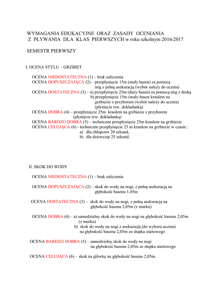 WYMAGANIA EDUKACYJNE ORAZ ZASADY OCENIANIA Z PŁYWANIA DLA KLAS PIERWSZYCH w roku szkolnym 2016/2017 SEMESTR PIERWSZY I. OCENA STYLU – GRZBIET OCENA NIEDOSTATECZNA (1) – brak zaliczenia OCENA DOPUSZCZAJĄCA (2) – przepłynięcie 15m (mały basen) za pomocą nóg z pełną asekuracją (wybór należy do ucznia) OCENA DOSTATECZNA (3) – a) przepłynięcie 25m (duży basen) za pomocą nóg z deską b) przepłynięcie 15m (mały basen kraulem na grzbiecie z przyborem (wybór należy do ucznia) (płynięcie tzw. dokładanką) OCENA DOBRA (4) – przepłynięcie 25m kraulem na grzbiecie z przyborem (płynięcie tzw. dokładanką) OCENA BARDZO DOBRA (5) – techniczne przepłynięcie 25m kraulem na grzbiecie OCENA CELUJĄCA (6) - techniczne przepłynięcie 25 m kraulem na grzbiecie w czasie : a) dla chłopców 20 sekund, b) dla dziewcząt 25 sekund. II. SKOK DO WODY OCENA NIEDOSTATECZNA (1) – brak zaliczenia OCENA DOPUSZCZAJĄCA (2) – skok do wody na nogi, z pełną asekuracją na głębokość basenu 1,45m OCENA DOSTATECZNA (3) – skok do wody na nogi, z pełną asekuracją na głębokość basenu 2,05m (z murku) OCENA DOBRA (4) – a) samodzielny skok do wody na nogi na głębokość basenu 2,05m (z murku) b) skok do wody na nogi z asekuracją (do wyboru ucznia) na głębokość basenu 2,05m ze słupka startowego OCENA BARDZO DOBRA (5) – samodzielny skok do wody na nogi na głębokość basenu 2,05m ze słupka startowego OCENA CELUJĄCA (6) - skok na główkę na głębokość basenu 2,05m. III. STRZAŁKA OCENA NIEDOSTATECZNA (1) – brak zaliczenia OCENA DOPUSZCZAJĄCA (2) – przepłynięcie 15m (mały basen) strzałką z przyborem (wybór należy do ucznia), z możliwością zatrzymania OCENA DOSTATECZNA (3) – samodzielne przepłynięcie 15m strzałką z jednym postojem OCENA DOBRA (4) – a) samodzielne przepłynięcie 15m strzałką bez zatrzymania się b) przepłynięcie 25m (duży basen) strzałką z przyborem (wybór należy do ucznia), z możliwością zatrzymania OCENA BARDZO DOBRA (5) – samodzielne przepłynięcie 25m strzałką z jednym postojem OCENA CELUJĄCA (6) - samodzielne przepłynięcie 25m strzałką bez zatrzymania się ZASADY OCENIANIA Z PŁYWANIA DLA KLAS PIERWSZYCH SEMESTR DRUGI I PRZEPŁYNIĘCIE 25 M (duży basen) NA CZAS STYLEM GRZBIETOWYM 1. Poziom zaawansowany : OCENA NIEDOSTATECZNA (1) – brak zaliczenia OCENA DOPUSZCZAJĄCA (2) – powyżej 55 s OCENA DOSTATECZNA (3) – przedział czasowy między 55 s a 40s OCENA DOBRA (4) – przedział czasowy między 40 s a 30 s OCENA BARDZO DOBRA (5) – przedział czasowy między 30 s a 25 s OCENA CELUJĄCA (6) - poniżej 25 s 2. Poziom podstawowy : OCENA NIEDOSTATECZNA (1) – brak zaliczenia OCENA DOPUSZCZAJĄCA (2) – powyżej 1min 10 s OCENA DOSTATECZNA (3) – przedział czasowy między 1min 10 s a 55s OCENA DOBRA (4) – przedział czasowy między 55 s a 40 s OCENA BARDZO DOBRA (5) – przedział czasowy między 40 s a 30 s OCENA CELUJĄCA (6) - poniżej 30 s II OCENA STYLU – KRAUL NA PIERSIACH OCENA NIEDOSTATECZNA (1) – brak zaliczenia OCENA DOPUSZCZAJĄCA (2) – przepłynięcie 15m (mały basen) za pomocą nóg z pełną asekuracją (wybór należy do ucznia) OCENA DOSTATECZNA (3) – a) przepłynięcie 25m (duży basen) za pomocą nóg z deską b) przepłynięcie 15m (mały basen kraulem na piersiach z przyborem (wybór należy do ucznia) (płynięcie tzw. dokładanką) OCENA DOBRA (4) – przepłynięcie 25m kraulem na piersiach z przyborem (płynięcie tzw. dokładanką) OCENA BARDZO DOBRA (5) – techniczne przepłynięcie 25m kraulem na piersiach OCENA CELUJĄCA (6) - techniczne przepłynięcie 25 m kraulem na piersiach w czasie : c) dla chłopców 20 sekund, d) dla dziewcząt 25 sekund. III. NURKOWANIE 1. Poziom podstawowy: OCENA NIEDOSTATECZNA (1) – brak zaliczenia OCENA DOPUSZCZAJĄCA (2) – wyłowienie krążka w jakikolwiek sposób na małym basenie OCENA DOSTATECZNA (3) – samodzielne wyłowienie krążka rękami (nogi nie stoją) na głębokości 1m (mały basen) OCENA DOBRA (4) – samodzielne wyłowienie krążka rękami (nogi nie stoją) na głębokości 1,20 m (mały basen) OCENA BARDZO DOBRA (5) – samodzielne wyłowienie krążka rękami (nogi nie stoją) na głębokości 1,45 m (duży basen) 2. Poziom zaawansowany: OCENA NIEDOSTATECZNA (1) - brak zaliczenia OCENA DOPUSZCZAJĄCA (2) – samodzielne wyłowienie krążka na głębokości 1,45m (duży basen) OCENA DOSTATECZNA (3) – samodzielne wyłowienie dwóch krążków (na różnej głębokości dużego basenu. Po każdym wyłowieniu można zrobić wdech. OCENA DOBRA (4) – samodzielne wyłowienie trzech krążków na różnej głębokości dużego basenu. OCENA BARDZO DOBRA (5) – samodzielne wyłowienie czterech krążków na różnej głębokości dużego basenu. OCENA CELUJĄCA (6) - samodzielne wyłowienie pięciu krążków na różnej głębokości dużego basenu. Piąty krążek znajduje się na głębokości 2,05 m.