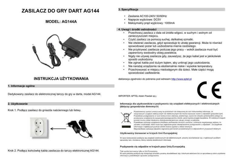 ZASILACZ DO GRY DART AG144 MODEL: AG144A 3. Specyfikacja • • • Zasilanie AC100-240V 50/60Hz Napięcie wyjściowe: DC5V Maksymalny prąd wyjściowy: 1000mA 4. Uwagi i środki ostrożności • Przechowuj zasilacz z dala od źródła wilgoci, w suchym i wolnym od zanieczyszczeń miejscu. • Czyść zasilacz za pomocą suchej, delikatnej szmatki. • Nie otwierać zasilacza, gdyż spowoduje to utratę gwarancji. Może to również spowodować pożar lub uszkodzenia mienia osobistego. • Nie przykrywać zasilacza podczas jego pracy – wokół zasilacza musi być zapewniony swobodny obieg powietrza. • Nigdy nie używaj zasilacza gdy, zauważysz, że jego kabel jest w jakikolwiek sposób uszkodzony. • Nie zginać kabla pod dużym kątem, aby uniknąć jego uszkodzenia. • Nie narażaj urządzenia na ekstremalnie niskie i wysokie temperatury. • Przechowywać w miejscu niedostępnym dla dzieci. Małe części mogą spowodować zadławienie. INSTRUKCJA UŻYTKOWANIA deklaracja zgodności do pobrania pod adresem http://www.aptel.pl 1. Informacje ogólne Dedykowany zasilacz do elektronicznej tarczy do gry w darta, model AG144. 2. Użytkowanie Krok 1. Podłącz zasilacz do gniazda naściennego lub listwy. Krok 2. Podłącz końcówkę kabla zasilacza do tarczy elektronicznej AG144. IMPORTER: APTEL Adam Pawlak sp.j.