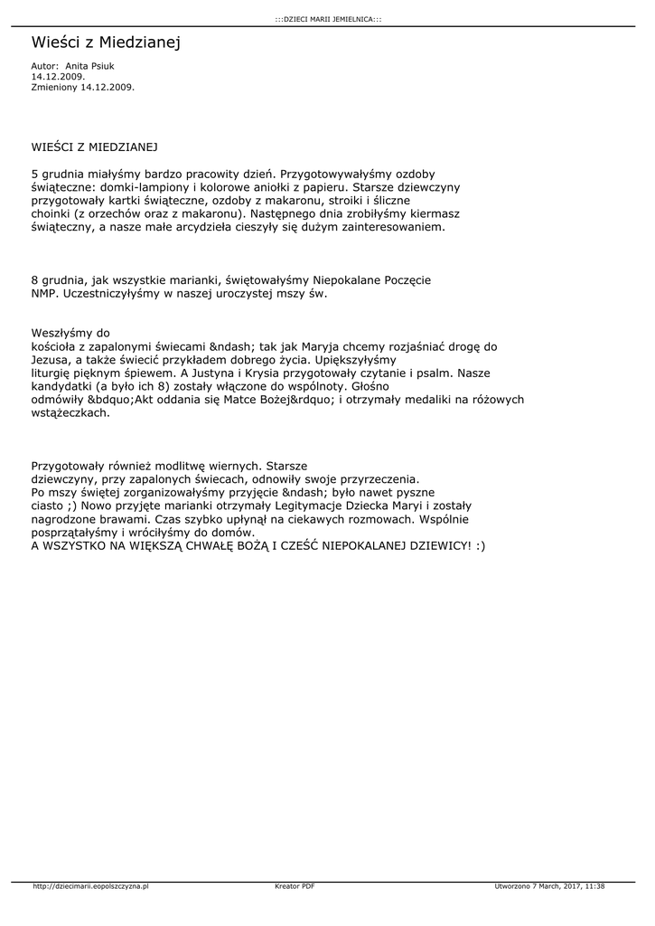 :::DZIECI MARII JEMIELNICA::: Wieści z Miedzianej Autor: Anita Psiuk 14.12.2009. Zmieniony 14.12.2009. WIEŚCI Z MIEDZIANEJ 5 grudnia miałyśmy bardzo pracowity dzień. Przygotowywałyśmy ozdoby świąteczne: domki-lampiony i kolorowe aniołki z papieru. Starsze dziewczyny przygotowały kartki świąteczne, ozdoby z makaronu, stroiki i śliczne choinki (z orzechów oraz z makaronu). Następnego dnia zrobiłyśmy kiermasz świąteczny, a nasze małe arcydzieła cieszyły się dużym zainteresowaniem. 8 grudnia, jak wszystkie marianki, świętowałyśmy Niepokalane Poczęcie NMP. Uczestniczyłyśmy w naszej uroczystej mszy św. Weszłyśmy do kościoła z zapalonymi świecami – tak jak Maryja chcemy rozjaśniać drogę do Jezusa, a także świecić przykładem dobrego życia. Upiększyłyśmy liturgię pięknym śpiewem. A Justyna i Krysia przygotowały czytanie i psalm. Nasze kandydatki (a było ich 8) zostały włączone do wspólnoty. Głośno odmówiły „Akt oddania się Matce Bożej” i otrzymały medaliki na różowych wstążeczkach. Przygotowały również modlitwę wiernych. Starsze dziewczyny, przy zapalonych świecach, odnowiły swoje przyrzeczenia. Po mszy świętej zorganizowałyśmy przyjęcie – było nawet pyszne ciasto ;) Nowo przyjęte marianki otrzymały Legitymacje Dziecka Maryi i zostały nagrodzone brawami. Czas szybko upłynął na ciekawych rozmowach. Wspólnie posprzątałyśmy i wróciłyśmy do domów. A WSZYSTKO NA WIĘKSZĄ CHWAŁĘ BOŻĄ I CZEŚĆ NIEPOKALANEJ DZIEWICY! :) http://dziecimarii.eopolszczyzna.pl Kreator PDF Utworzono 7 March, 2017, 11:38