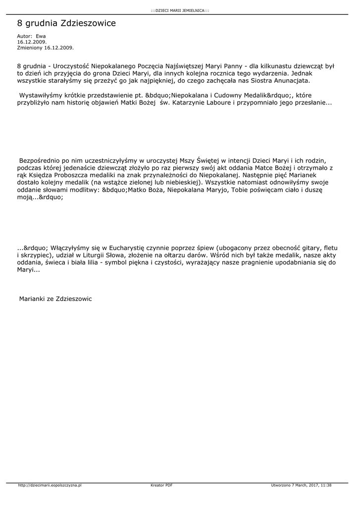 :::DZIECI MARII JEMIELNICA::: 8 grudnia Zdzieszowice Autor: Ewa 16.12.2009. Zmieniony 16.12.2009. 8 grudnia - Uroczystość Niepokalanego Poczęcia Najświętszej Maryi Panny - dla kilkunastu dziewcząt był to dzień ich przyjęcia do grona Dzieci Maryi, dla innych kolejna rocznica tego wydarzenia. Jednak wszystkie starałyśmy się przeżyć go jak najpiękniej, do czego zachęcała nas Siostra Anunacjata. Wystawiłyśmy krótkie przedstawienie pt. „Niepokalana i Cudowny Medalik”, które przybliżyło nam historię objawień Matki Bożej św. Katarzynie Laboure i przypomniało jego przesłanie... Bezpośrednio po nim uczestniczyłyśmy w uroczystej Mszy Świętej w intencji Dzieci Maryi i ich rodzin, podczas której jedenaście dziewcząt złożyło po raz pierwszy swój akt oddania Matce Bożej i otrzymało z rąk Księdza Proboszcza medaliki na znak przynależności do Niepokalanej. Następnie pięć Marianek dostało kolejny medalik (na wstążce zielonej lub niebieskiej). Wszystkie natomiast odnowiłyśmy swoje oddanie słowami modlitwy: „Matko Boża, Niepokalana Maryjo, Tobie poświęcam ciało i duszę moją...” ...” Włączyłyśmy się w Eucharystię czynnie poprzez śpiew (ubogacony przez obecność gitary, fletu i skrzypiec), udział w Liturgii Słowa, złożenie na ołtarzu darów. Wśród nich był także medalik, nasze akty oddania, świeca i biała lilia - symbol piękna i czystości, wyrażający nasze pragnienie upodabniania się do Maryi... Marianki ze Zdzieszowic http://dziecimarii.eopolszczyzna.pl Kreator PDF Utworzono 7 March, 2017, 11:38