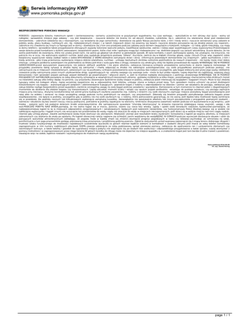 Serwis informacyjny KWP www.pomorska.policja.gov.pl BEZPIECZEŃSTWO PODCZAS WAKACJI RODZICE:- zapewnijcie dziecku maksimum opieki i zainteresowania;- samemu uczestniczcie w pozytywnym wypełnieniu mu czas wolnego; - wykształćcie w nim zdrowy styl życia - wolny od nałogów;- sprawdźcie miejsce jego zabawy - czy jest bezpieczne; - nauczcie dziecko nie brania nic od obcych (lizaków, cukierków, itp.);- zabrońcie mu otwierania drzwi pod nieobecność domowników; - zabrońcie oddalania się z nieznajomym, czy wsiadania do jego samochodu;- dowiedzcie się gdzie Wasza pociecha idzie, z kim i kiedy wróci;- nauczcie ostrożności przy zabawie w pobliżu wody, placu budowy, ruchliwych ulic, itp. niebezpiecznych miejsc; ( w takich miejscach dzieci nie powinny się bawić)- nauczcie dziecko poruszania się po drodze pieszo czy rowerem;zabrońcie mu chwalenia się innym co fajnego jest w domu;- dowiedzcie się z kim ono przebywa podczas zabawy poza domem (wypytajcie o koleżanki, kolegów - co robią, gdzie mieszkają, czy mają w domu telefon);- sprawdźcie także przygotowanie oferujących wyjazdy kolonijne (warunki pobytu, kwalifikacje opiekunów, zakres i rodzaj zajęć wypełniających czasu wypoczynku).Przestrzegajcie swoje dziecko przed kontaktami z dzikimi zwierzętami, bezpańskimi psami, które choć miłe i spokojne mogą być niebezpieczne i np. dotkliwie pogryść czy zarazić wścieklizną. Uczcie dziecko, że nie wolno podchodzić do zwierzęcia, które nie ucieka przed nami, nie wolno go głaskać lub drażnić w jakikolwiek sposób. W razie kontaktu z psem zachowajcie spokój, nie uciekajcie, nie krzyczcie, nie patrzcie mu w oczy, nie wykonujcie szybkich ruchów. Jeżeli pies zaatakuje przyjmijcie postawę "żółwia". Kucnijcie, zwińcie się w kłębek chroniąc głowę, szyję i brzuch.Chcąc więc zapewnić sobie bezpieczny wypoczynek należy zadbać także o siebie.WYCHODZĄC Z DOMU-dokładnie zamykajcie drzwi i okna; -informujcie pozostałych domowników czy znajomych - gdzie wychodzicie, z kim i kiedy wrócicie; -jako trasę przemarszu wybierajcie miejsca dobrze oświetlone, ruchliwe - unikając bezludnych skrótów;-ostrożnie podchodźcie do nowych znajomości - nie każdy może mieć dobre intencje; -unikajcie jeżdżenia autostopem-nie podchodźcie za blisko jeżli ktoś z auta pyta Was o drogę;-rozważcie czy atrakcyjny strój nie będzie prowokował do napadu.WYBIERAJĄC SIĘ W PODRÓŻ SAMOCHODEM-przed wyruszeniem wypocznijcie, nie jedzcie obfitych posiłków i nie pijcie alkoholu, zwłaszcza kierowca;-unikajcie prowadzenia samochodu w stanie napięcia nerwowego. W przypadku powstania takiej sytuacji w drodze lepiej się zatrzymać i chwilę odpocząć;-w drodze nie zabierajcie autostopowiczów, czy osób przypadkowo poznanych podczas postoju; -nie zatrzymujcie się w miejscach nieoświetlonych, zalesionych czy na pustkowiu;-unikajcie pozostawiania auta na postoju bez nadzoru szczególnie, gdy bagaż widoczny jest przez jego szyby;-dokładnie rozważcie próby zatrzymania przez innych użytkowników drogi, sygnalizujących np. usterkę swojego czy waszego auta - może to być próba napadu. Lepiej dojechać do najbliższej, większej stacji benzynowej i tam sprawdzić pojazd.-parkując pojazd dokładnie go pozamykajcie i włączcie alarm, a. jeżli to możliwe najlepiej skorzystajcie z parkingu strzeżonego.WYBIERAJĄC SIĘ W PODRÓŻ POCĄGIEM CZY AUTOBUSEM-posiadane ze sobą dokumenty schowajcie w wewnętrznych kieszeniach ubrania; -gotówkę rozdzielcie w kilka miejsc, pozostawiając równocześnie kilka drobnych monet na niewielkie zakupy albo bilety;-będąc na peronie, czy przystanku obserwujcie dyskretnie osoby stojące w pobliżu, zwłaszcza jeżeli interesują się wyglądem i bagażem innych. Może to być złodziej typujący sobie lub kolegom ofiarę; -lepiej wcześniej zaopatrzcie się w odpowiednią ilość biletów, unikając stania w kolejce przed kasą. Tym sposobem można uchronić się przed złodziejami kieszonkowymi czy bagażu - wykorzystującymi pośpiech i zdenerwowanie kupujących; -poproście kogoś z rodziny o odprowadzenie na dworzec i pomoc we wsiadaniu do pociągu, zwłaszcza gdy zakup biletów nastąpi bezpośrednio przed wyjazdem;-zwróćcie szczególną uwagę na swój bagaż podczas wsiadania i wysiadania. Zamieszanie w tym momencie to również jeden z dogodniejszych momentów do działania dla złodziei bagażu czy kieszonkowych. Lepiej odczekać moment ścisku i wsiąść czy opuścić pojazd swobodnie; -wsiadając do pustego autobusu, czy pociągu zajmujcie miejsca przy kierowcy, drużynie konduktorskiej lub wśród grona budzących zaufanie pasażerów (np. rodziny z dziećmi czy osób starszych);-zajmując miejsce posiadany bagaż pozostawiajcie pod ręką albo na widoku i zwracać na niego szczególną uwagę podczas ruchu podróżnych na stacjach, czy przystankach. Zdarzały się bowiem przypadki pomyłkowego zabrania bagażu przez współpasażerów; -nie śpijcie w podróży, szczególnie gdy w pobliżu nie ma osób zaufanych np. z rodziny, które jednocześnie gwarantują, że nie zasną. Jeśli będzie taka możliwość lepiej zamknijcie się w przedziale. Do podróży nocnych lub kilkudniowych wybierajcie zamykaną kuszetkę; -bezwzględnie nie spożywajcie alkoholu lub innych poczęstunków z przygodnie poznanymi osobami zaśniecie i obudzicie się bez swoich rzeczy;-rzeczy podręczne, potrzebne w podróży zapakujcie na wierzchu. Unikniecie okazywania zawartości walizki podczas ich wyszukiwania w jej wnętrzu; -jeśli trzeba - zażyjcie sami lub podajcie dzieciom środki przeciwwymiotne. Złe samopoczucie wywołane "chorobą lokomocyjną" to straszna męczarnia osłabiająca naszą czujność, uwagę i siłę woli.PODCZAS POBYTU NAD WODĄ-pamiętaj, że nie wolno kąpać się w morzu, jeziorze, stawie czy rzece bez wiedzy, zgody i opieki osób dorosłych( rodziców /opiekunów)-pamiętajcie, że najbezpieczniejs
