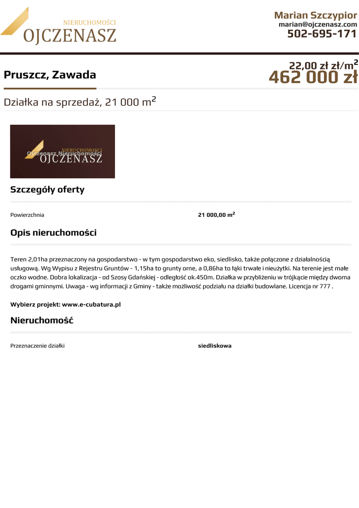 Marian Szczypior [email protected] 502-695-171 22,00 zł zł/m2 462 000 zł Pruszcz, Zawada Działka na sprzedaż, 21 000 m2 Szczegóły oferty Powierzchnia 21 000,00 m2 Opis nieruchomości Teren 2,01ha przeznaczony na gospodarstwo - w tym gospodarstwo eko, siedlisko, także połączone z działalnością usługową. Wg Wypisu z Rejestru Gruntów - 1,15ha to grunty orne, a 0,86ha to łąki trwałe i nieużytki. Na terenie jest małe oczko wodne. Dobra lokalizacja - od Szosy Gdańskiej - odległość ok.450m. Działka w przybliżeniu w trójkącie między dwoma drogami gminnymi. Uwaga - wg informacji z Gminy - także możliwość podziału na działki budowlane. Licencja nr 777 . Wybierz projekt: www.e-cubatura.pl Nieruchomość Przeznaczenie działki siedliskowa