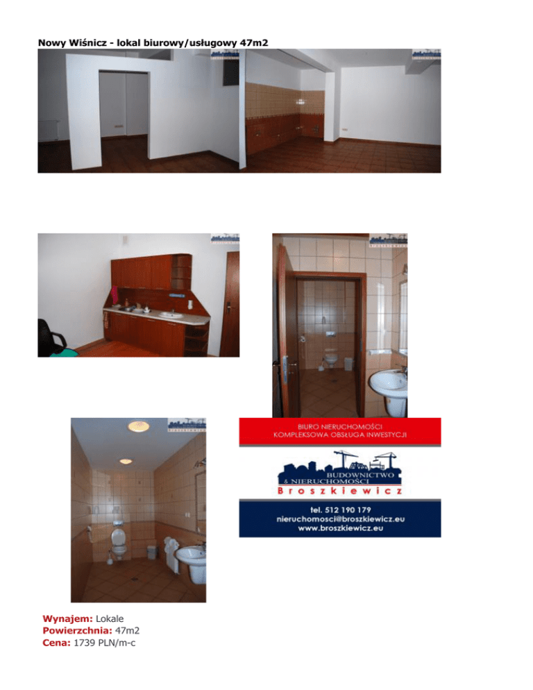 Nowy Wiśnicz - lokal biurowy/usługowy 47m2 Wynajem: Lokale Powierzchnia: 47m2 Cena: 1739 PLN/m-c Dostępność: Typ: Lokal Nr oferty: 174 Nowy Wiśnicz - lokal użytkowy na parterze do wynajęcia. Oferta dotyczy powierzchni użytkowej w nowoczesnym budynku handlowo-usługowym, położonym w centrum miasta. Powierzchnia lokalu wynosi 47m2 (składa się z dwóch pomieszczeń, dodatkowo uzbrojonych we własną instalację wod-kan). Lokal z przeznaczeniem na cele handlowe, usługowe lub biurowe, posiada dostęp do części wspólnej, w której mieszczą się dwie toalety, korytarz oraz pomieszczenie socjalne. Poziom parteru przystosowany dla osób niepełnosprawnych. Pomieszczenia są zadbane i czyste. Budynek posiada monitoring wewnętrzny i zewnętrzny oraz kilkanaście miejsc parkingowych przy budynku. Polecamy w szczególności pod salon fryzjerski, kosmetyczny, fitness, gabinet lekarski. Odstępne w wysokości 1739zł brutto + opłaty za media. Podana cena podlega negocjacji. Możliwość wynajęcia innych lokali. Zapraszamy. Adres tego pliku: http://broszkiewicz.eu/pdf/offer/182 Adres oferty na stronie: http://broszkiewicz.eu/site/offers/show/182/nowy-wisnicz-lokal-biurowy/uslugowy-47m2.html