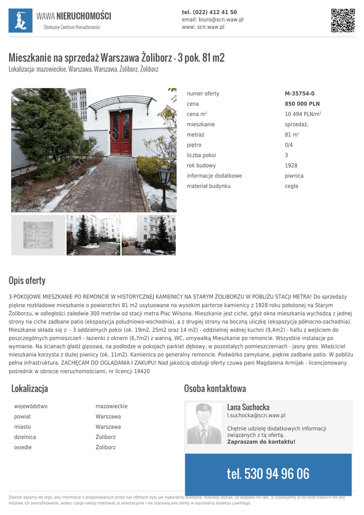 tel. (022) 412 41 50 email: [email protected] www: scn.waw.pl Mieszkanie na sprzedaż Warszawa Żoliborz - 3 pok. 81 m2 Lokalizacja: mazowieckie, Warszawa, Warszawa, Żoliborz, Żoliborz numer oferty M-35754-0 cena 850 000 PLN cena m 10 494 PLN/m2 mieszkanie sprzedaż, metraż 81 m2 piętro 0/4 liczba pokoi 3 rok budowy 1928 informacje dodatkowe piwnica materiał budynku cegła 2 Opis oferty 3-POKOJOWE MIESZKANIE PO REMONCIE W HISTORYCZNEJ KAMIENICY NA STARYM ŻOLIBORZU W POBLIŻU STACJI METRA! Do sprzedaży piękne rozkładowe mieszkanie o powierzchni 81 m2 usytuowane na wysokim parterze kamienicy z 1928 roku położonej na Starym Żoliborzu, w odległości zaledwie 300 metrów od stacji metra Plac Wilsona. Mieszkanie jest ciche, gdyż okna mieszkania wychodzą z jednej strony na ciche zadbane patio (ekspozycja południowo-wschodnia), a z drugiej strony na boczną uliczkę (ekspozycja północno-zachodnia). Mieszkanie składa się z: - 3 oddzielnych pokoi (ok. 19m2, 25m2 oraz 14 m2) - oddzielnej widnej kuchni (9,4m2) - hallu z wejściem do poszczególnych pomieszczeń - łazienki z oknem (6,7m2) z wanną, WC, umywalką Mieszkanie po remoncie. Wszystkie instalacje po wymianie. Na ścianach gładź gipsowa, na podłodze w pokojach parkiet dębowy, w pozostałych pomieszczeniach - jasny gres. Właściciel mieszkania korzysta z dużej piwnicy (ok. 11m2). Kamienica po generalny remoncie. Podwórko zamykane, piękne zadbane patio. W pobliżu pełna infrastruktura. ZACHĘCAM DO OGLĄDANIA I ZAKUPU! Nad jakością obsługi oferty czuwa pani Magdalena Armijak - licencjonowany pośrednik w obrocie nieruchomościami, nr licencji 19420 Lokalizacja Osoba kontaktowa Lana Suchocka województwo mazowieckie powiat Warszawa [email protected] miasto Warszawa dzielnica Żoliborz osiedle Żoliborz Chętnie udzielę dodatkowych informacji związanych z tą ofertą. Zapraszam do kontaktu! tel. 530 94 96 06 Zawsze dążymy do tego, aby informacje o proponowanych przez nas ofertach były jak najbardziej dokładne. Niekiedy jednak, ze względu na fakt, iż uzyskujemy je od osób trzecich nie jest możliwe ich zweryfikowanie, wobec czego należy traktować je orientacyjnie i nie stanowią one oferty w rozumieniu kodeksu cywilnego.