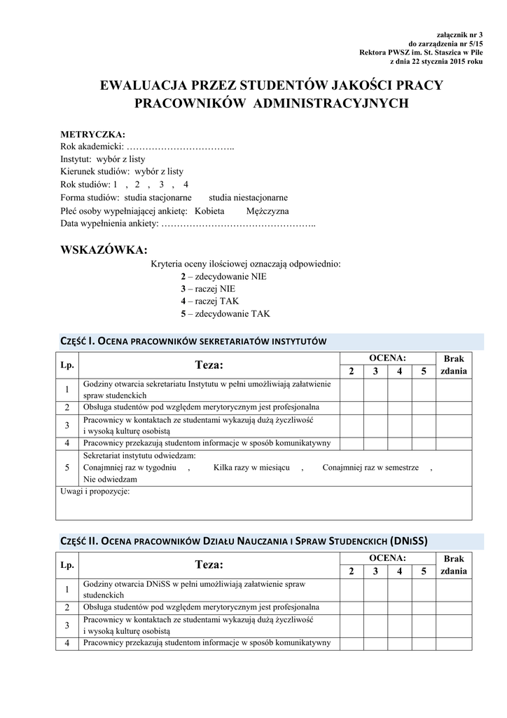 załącznik nr 3 do zarządzenia nr 5/15 Rektora PWSZ im. St. Staszica w Pile z dnia 22 stycznia 2015 roku EWALUACJA PRZEZ STUDENTÓW JAKOŚCI PRACY PRACOWNIKÓW ADMINISTRACYJNYCH METRYCZKA: Rok akademicki: …………………………….. Instytut: wybór z listy Kierunek studiów: wybór z listy Rok studiów: 1 , 2 , 3 , 4 Forma studiów: studia stacjonarne studia niestacjonarne Płeć osoby wypełniającej ankietę: Kobieta Mężczyzna Data wypełnienia ankiety: ………………………………………….. WSKAZÓWKA: Kryteria oceny ilościowej oznaczają odpowiednio: 2 – zdecydowanie NIE 3 – raczej NIE 4 – raczej TAK 5 – zdecydowanie TAK CZĘŚĆ I. OCENA PRACOWNIKÓW SEKRETARIATÓW INSTYTUTÓW Lp. 1 2 3 4 OCENA: Teza: 2 3 4 Brak zdania 5 Godziny otwarcia sekretariatu Instytutu w pełni umożliwiają załatwienie spraw studenckich Obsługa studentów pod względem merytorycznym jest profesjonalna Pracownicy w kontaktach ze studentami wykazują dużą życzliwość i wysoką kulturę osobistą Pracownicy przekazują studentom informacje w sposób komunikatywny Sekretariat instytutu odwiedzam: 5 Conajmniej raz w tygodniu , Nie odwiedzam Uwagi i propozycje: Kilka razy w miesiącu , Conajmniej raz w semestrze , CZĘŚĆ II. OCENA PRACOWNIKÓW DZIAŁU NAUCZANIA I SPRAW STUDENCKICH (DNISS) Lp. 1 2 3 4 Teza: Godziny otwarcia DNiSS w pełni umożliwiają załatwienie spraw studenckich Obsługa studentów pod względem merytorycznym jest profesjonalna Pracownicy w kontaktach ze studentami wykazują dużą życzliwość i wysoką kulturę osobistą Pracownicy przekazują studentom informacje w sposób komunikatywny OCENA: 2 3 4 5 Brak zdania DNiSS odwiedzam: Co najmniej raz w tygodniu Nie odwiedzam Uwagi i propozycje: 5 , Kilka razy w miesiącu , Co najmniej raz w semestrze , CZĘŚĆ III. OCENA PRACOWNIKÓW KWESTURY 1 2 3 4 OCENA: Teza: Lp. 2 3 4 Brak zdania 5 Godziny otwarcia Kwestury w pełni umożliwiają załatwienie spraw studenckich Obsługa studentów pod względem merytorycznym jest profesjonalna Pracownicy w kontaktach ze studentami wykazują dużą życzliwość i wysoką kulturę osobistą Pracownicy przekazują studentom informacje w sposób komunikatywny Kwesturę odwiedzam: 5 Co najmniej raz w tygodniu Nie odwiedzam Uwagi i propozycje: , Kilka razy w miesiącu , Co najmniej raz w semestrze , CZĘŚĆ IV. OCENA PRACOWNIKÓW DZIAŁU PRAKTYK STUDENCKICH I KARIER (DPSIK) 1 2 3 4 OCENA: Teza: Lp. 2 3 4 Brak zdania 5 Godziny otwarcia DPSiK w pełni umożliwiają załatwienie spraw studenckich Obsługa studentów pod względem merytorycznym jest profesjonalna Pracownicy w kontaktach ze studentami wykazują dużą życzliwość i wysoką kulturę osobistą Pracownicy przekazują studentom informacje w sposób komunikatywny DPSiK odwiedzam: 5 Co najmniej raz w tygodniu Nie odwiedzam Uwagi i propozycje: , Kilka razy w miesiącu , Co najmniej raz w semestrze , CZĘŚĆ V. OCENA INSTYTUTOWYCH KOORDYNATORÓW PROGRAMU ERASMUS Lp. 1 2 3 Teza: Dostępność koordynatora jest wystarczająca do załatwienia spraw związanych z uczestnictwem w Programie Obsługa studenta pod względem merytorycznym jest profesjonalna Koordynator w kontaktach ze studentami wykazuje dużą życzliwość i wysoką kulturę osobistą OCENA: 2 3 4 5 Brak zdania 4 5 6 Koordynator przekazuje studentom informacje w sposób komunikatywny Materiały informacyjne o Programie Erasmus udostępniane przez koordynatora są wystarczające Procedury stosowane koordynatora są jasne i w pełni zrozumiałe Koordynatora odwiedzam: Co najmniej raz w tygodniu Nie odwiedzam Uwagi i propozycje: 7 , Kilka razy w miesiącu , Co najmniej raz w semestrze , CZĘŚĆ VI. OCENA JAKOŚCI PRACY PRACOWNIKÓW BIBLIOTEKI GŁÓWNEJ Lp. Teza: OCENA: 2 3 4 Godziny otwarcia Biblioteki Głównej w pełni umożliwiają korzystanie z Wypożyczalni Godziny otwarcia Biblioteki Głównej w pełni umożliwiają korzystanie 2 z Czytelni Godziny otwarcia Biblioteki Głównej w pełni umożliwiają korzystanie 3 z Mediateki Udostępnianie zbiorów bibliotecznych dla studentów pod względem 4 merytorycznym jest profesjonalne Pracownicy Biblioteki Głównej wykazują dużą życzliwość 5 i wysoką kulturę osobistą w kontaktach ze studentami Pracownicy Biblioteki Głównej przekazują studentom informacje 6 w sposób komunikatywny Pracownicy Biblioteki Głównej wspierają studentów w wyszukiwaniu 7 potrzebnych publikacji Bibliotekę Główną odwiedzam: Kilka razy w miesiącu , Conajmniej raz w semestrze 8 Conajmniej raz w tygodniu , Nie odwiedzam Uwagi i propozycje: Brak zdania 5 1 , Dziękujemy bardzo za uczestnictwo w badaniu.