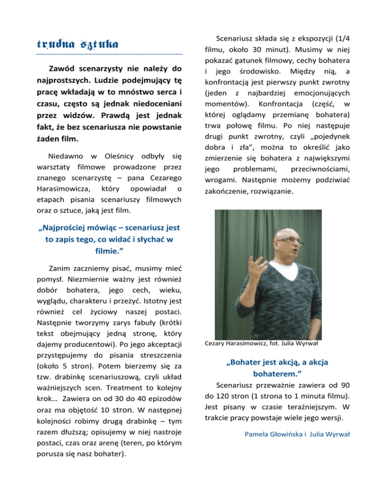 Trudna sztuka… Zawód scenarzysty nie należy do najprostszych. Ludzie podejmujący tę pracę wkładają w to mnóstwo serca i czasu, często są jednak niedoceniani przez widzów. Prawdą jest jednak fakt, że bez scenariusza nie powstanie żaden film. Niedawno w Oleśnicy odbyły się warsztaty filmowe prowadzone przez znanego scenarzystę – pana Cezarego Harasimowicza, który opowiadał o etapach pisania scenariuszy filmowych oraz o sztuce, jaką jest film. Scenariusz składa się z ekspozycji (1/4 filmu, około 30 minut). Musimy w niej pokazać gatunek filmowy, cechy bohatera i jego środowisko. Między nią, a konfrontacją jest pierwszy punkt zwrotny (jeden z najbardziej emocjonujących momentów). Konfrontacja (część, w której oglądamy przemianę bohatera) trwa połowę filmu. Po niej następuje drugi punkt zwrotny, czyli „pojedynek dobra i zła”, można to określić jako zmierzenie się bohatera z największymi jego problemami, przeciwnościami, wrogami. Następnie możemy podziwiać zakończenie, rozwiązanie. „Najprościej mówiąc – scenariusz jest to zapis tego, co widać i słychać w filmie.” Zanim zaczniemy pisać, musimy mieć pomysł. Niezmiernie ważny jest również dobór bohatera, jego cech, wieku, wyglądu, charakteru i przeżyć. Istotny jest również cel życiowy naszej postaci. Następnie tworzymy zarys fabuły (krótki tekst obejmujący jedną stronę, który dajemy producentowi). Po jego akceptacji przystępujemy do pisania streszczenia (około 5 stron). Potem bierzemy się za tzw. drabinkę scenariuszową, czyli układ ważniejszych scen. Treatment to kolejny krok… Zawiera on od 30 do 40 epizodów oraz ma objętość 10 stron. W następnej kolejności robimy drugą drabinkę – tym razem dłuższą; opisujemy w niej nastroje postaci, czas oraz arenę (teren, po którym porusza się nasz bohater). Cezary Harasimowicz, fot. Julia Wyrwał „Bohater jest akcją, a akcja bohaterem.” Scenariusz przeważnie zawiera od 90 do 120 stron (1 strona to 1 minuta filmu). Jest pisany w czasie teraźniejszym. W trakcie pracy powstaje wiele jego wersji. Pamela Głowińska i Julia Wyrwał