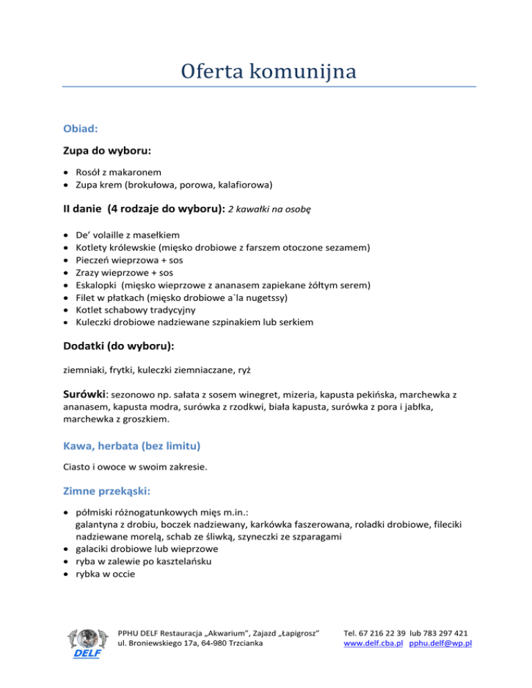 Oferta komunijna Obiad: Zupa do wyboru: Rosół z makaronem Zupa krem (brokułowa, porowa, kalafiorowa) II danie (4 rodzaje do wyboru): 2 kawałki na osobę De’ volaille z masełkiem Kotlety królewskie (mięsko drobiowe z farszem otoczone sezamem) Pieczeo wieprzowa + sos Zrazy wieprzowe + sos Eskalopki (mięsko wieprzowe z ananasem zapiekane żółtym serem) Filet w płatkach (mięsko drobiowe a`la nugetssy) Kotlet schabowy tradycyjny Kuleczki drobiowe nadziewane szpinakiem lub serkiem Dodatki (do wyboru): ziemniaki, frytki, kuleczki ziemniaczane, ryż Surówki: sezonowo np. sałata z sosem winegret, mizeria, kapusta pekioska, marchewka z ananasem, kapusta modra, surówka z rzodkwi, biała kapusta, surówka z pora i jabłka, marchewka z groszkiem. Kawa, herbata (bez limitu) Ciasto i owoce w swoim zakresie. Zimne przekąski: półmiski różnogatunkowych mięs m.in.: galantyna z drobiu, boczek nadziewany, karkówka faszerowana, roladki drobiowe, fileciki nadziewane morelą, schab ze śliwką, szyneczki ze szparagami galaciki drobiowe lub wieprzowe ryba w zalewie po kasztelaosku rybka w occie PPHU DELF Restauracja „Akwarium”, Zajazd „Łapigrosz” ul. Broniewskiego 17a, 64-980 Trzcianka Tel. 67 216 22 39 lub 783 297 421 www.delf.cba.pl [email protected] Sałatki (3 rodzaje do wyboru): jarzynowa, selerowa, gyros, meksykaoska, sezonowo ze świeżych brokułów, grecka z oliwkami, śledziowa Kolacja: Barszczyk czerwony z pasztecikiem Bigos po cygaosku z pulpecikami Szaszłyk Udko pieczone lub Udko faszerowane Deser lodowo-owocowy koszt na osobę - 4,00 zł Dekoracje stołów: Świeczki, serwetki - kolorystyka do ustalenia. Cena nie zawiera kosztów: napojów, owoców, ciasta Żywe kwiaty nie wliczone w cenę. PPHU DELF Restauracja „Akwarium”, Zajazd „Łapigrosz” ul. Broniewskiego 17a, 64-980 Trzcianka Tel. 67 216 22 39 lub 783 297 421 www.delf.cba.pl [email protected]