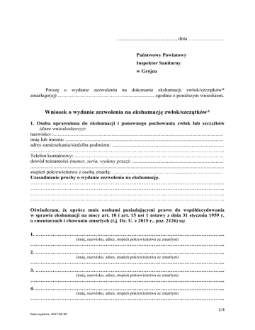 .............................................., dnia ………………… Państwowy Powiatowy Inspektor Sanitarny w Grójcu Proszę o wydanie zezwolenia na dokonanie ekshumacji zwłok/szczątków* zmarłego(ej) …………………………………....................... zgodnie z poniższym wnioskiem. Wniosek o wydanie zezwolenia na ekshumację zwłok/szczątków* 1. Osoba uprawniona do ekshumacji i ponownego pochowania zwłok lub szczątków (dane wnioskodawcy): nazwisko: ..................................................................................................................................... imię lub imiona: ........................................................................................................................... adres zamieszkania/siedziba podmiotu: ....................................................................................... …………………………………………………………………………………………………... Telefon kontaktowy:……………………………………………………………………………. dowód tożsamości (numer, seria, wydany przez): ....................................................................... ....................................................................................................................................................... stopień pokrewieństwa z osobą zmarłą: ……….……………………….............……………… Uzasadnienie prośby o wydanie zezwolenia na ekshumację. ………………………………………………………………………………………………....... …………………………………………………………………………………………………... …………………………………………………………………………………………………... …………………………………………………………………………………………………... Oświadczam, że oprócz mnie osobami posiadającymi prawo do współdecydowania w sprawie ekshumacji na mocy art. 10 i art. 15 ust 1 ustawy z dnia 31 stycznia 1959 r. o cmentarzach i chowaniu zmarłych (t.j. Dz. U. z 2015 r., poz. 2126) są: 1. ………………………………………………………………………………………………... (imię, nazwisko, adres, stopień pokrewieństwa ze zmarłym) …………………………………………………………………………………………………... 2. ………………………………………………………………………………………………... (imię, nazwisko, adres, stopień pokrewieństwa ze zmarłym) …………………………………………………………………………………………………... 3. ………………………………………………………………………………………………... (imię, nazwisko, adres, stopień pokrewieństwa ze zmarłym) …………………………………………………………………………………………………... 4. ………………………………………………………………………………………………... (imię, nazwisko, adres, stopień pokrewieństwa ze zmarłym) …………………………………………………………………………………………………... 1/4 Data wydania: 2017-02-09 Wszystkie powyższe osoby nie sprzeciwiają się dokonaniu ekshumacji (imię i nazwisko ekshumowanej osoby) ………………………………………………………………………….. Oświadczam, że nie jest mi wiadomo, aby w tej sprawie toczył się jakikolwiek spór sądowy. W przypadku, gdy pełnomocnikiem wnioskodawcy jest zakład pogrzebowy, do wniosku należy załączyć pełnomocnictwo osoby uprawnionej z poświadczeniem wiarygodności podpisu. 2. Dane osoby zmarłej: nazwisko:...................................................................................................................................... imię lub imiona:………………………………………………………………………………… nazwisko rodowe:………………………………………………………………………………. data i miejsce urodzenia:…………………………………………………………...…………… data i miejsce zgonu:……………………………………………………………………………. Oświadczam, że zgon nastąpił/nie nastąpił* z powodu choroby zakaźnej** wymienionej w rozporządzeniu Ministra Zdrowia z dnia 6 grudnia 2001 r. w sprawie wykazu chorób zakaźnych, w przypadku których stwierdzenie zgonu wymaga szczególnego postępowania ze zwłokami osób zmarłych na te choroby (Dz. U. z 2001 r. Nr 152, poz. 1742). 3. Miejsce, w którym odbędzie się ekshumacja zwłok lub szczątków (nazwa i adres cmentarza oraz zarządcy cmentarza):……………………………………………………….. ……………………………………………………………………………………………….. rodzaj grobu: ziemny / murowany / inny* (jeżeli inny, to podać jaki): …………………….. 4. Miejsce ponownego pochówku po przeniesieniu zwłok (nazwa i adres cmentarza oraz zarządcy cmentarza):………………………………………………………............................ ……………………………………………………………………………………………….. 5. Środek transportu, którym zostaną przewiezione zwłoki lub szczątki (nie dotyczy przewozu urny ze spopielonymi zwłokami):………………………………………………..... ……………………………………………………………………………………………….. 6. Data ekshumacji:……………………………………………………………………………. 2/4 Data wyda
