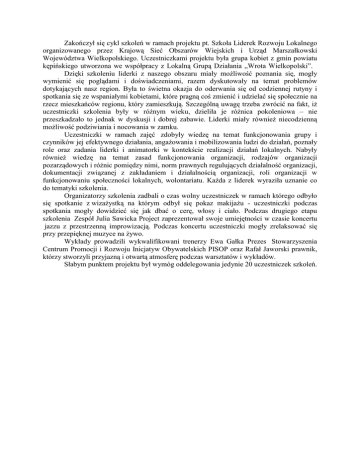 Zakończył się cykl szkoleń w ramach projektu pt. Szkoła Liderek Rozwoju Lokalnego organizowanego przez Krajową Sieć Obszarów Wiejskich i Urząd Marszałkowski Województwa Wielkopolskiego. Uczestniczkami projektu była grupa kobiet z gmin powiatu kępińskiego utworzona we współpracy z Lokalną Grupą Działania „Wrota Wielkopolski”. Dzięki szkoleniu liderki z naszego obszaru miały moŜliwość poznania się, mogły wymienić się poglądami i doświadczeniami, razem dyskutowały na temat problemów dotykających nasz region. Była to świetna okazja do oderwania się od codziennej rutyny i spotkania się ze wspaniałymi kobietami, które pragną coś zmienić i udzielać się społecznie na rzecz mieszkańców regionu, który zamieszkują. Szczególną uwagę trzeba zwrócić na fakt, iŜ uczestniczki szkolenia były w róŜnym wieku, dzieliła je róŜnica pokoleniowa – nie przeszkadzało to jednak w dyskusji i dobrej zabawie. Liderki miały równieŜ niecodzienną moŜliwość podziwiania i nocowania w zamku. Uczestniczki w ramach zajęć zdobyły wiedzę na temat funkcjonowania grupy i czynników jej efektywnego działania, angaŜowania i mobilizowania ludzi do działań, poznały role oraz zadania liderki i animatorki w kontekście realizacji działań lokalnych. Nabyły równieŜ wiedzę na temat zasad funkcjonowania organizacji, rodzajów organizacji pozarządowych i róŜnic pomiędzy nimi, norm prawnych regulujących działalność organizacji, dokumentacji związanej z zakładaniem i działalnością organizacji, roli organizacji w funkcjonowaniu społeczności lokalnych, wolontariatu. KaŜda z liderek wyraziła uznanie co do tematyki szkolenia. Organizatorzy szkolenia zadbali o czas wolny uczestniczek w ramach którego odbyło się spotkanie z wizaŜystką na którym odbył się pokaz makijaŜu - uczestniczki podczas spotkania mogły dowidzieć się jak dbać o cerę, włosy i ciało. Podczas drugiego etapu szkolenia Zespół Julia Sawicka Project zaprezentował swoje umiejętności w czasie koncertu jazzu z przestrzenną improwizacją. Podczas koncertu uczestniczki mogły zrelaksować się przy przepięknej muzyce na Ŝywo. Wykłady prowadzili wykwalifikowani trenerzy Ewa Gałka Prezes Stowarzyszenia Centrum Promocji i Rozwoju Inicjatyw Obywatelskich PISOP oraz Rafał Jaworski prawnik, którzy stworzyli przyjazną i otwartą atmosferę podczas warsztatów i wykładów. Słabym punktem projektu był wymóg oddelegowania jedynie 20 uczestniczek szkoleń.