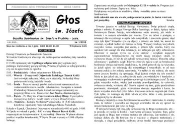 PRUDNICKI ROK PRYMASOWSKI 2014 / 2015 Głos św. Józefa Gazetka Sanktuarium św. Józefa w Prudniku – Lesie. Nr 1/2015 4.01.2015 r. Msze św. niedzielne u nas o godz.: 8.00 10.00 11.30 W Dębowcu: 8.45 OGŁOSZENIA Dzisiaj 2 Niedziela po Narodzeniu Pańskim. W Gościu Niedzielnym: dlaczego nie można poznać dokładnej daty narodzin Jezusa. O 15.00 zapraszamy do wspólnego kolędowania przy ognisku przy parkingu. Zapewniamy gorącą herbatę. Prosimy przynieść ze sobą śpiewniki, czy coś do upieczenia na ognisku. 5.01. - Poniedziałek – Msza imieninowa o. Edwarda. 6.01. - Wtorek – Uroczystość Objawienia Pańskiego (Trzech Króli) Jest to święto nakazane. Msze jak w niedzielę. Na każdej Mszy poświęcenie kredy, kadzidła i wody. 7.01. - Środa – Msza w intencji próśb i podziękowań zanoszonych za wstawiennictwem św. Józefa i nabożeństwo. Następnie w ramach Prudnickiej Filmoteki Życia Konsekrowanego zapraszamy na projekcję filmu o św. Franciszku: Brat Słońce, Siostra księżyc. 9.01. - Piątek – Po Mszy św. Franciszkańska Szkoły Wiary: U początków Europejskiej kultury i nauki, czyli z wizytą u Benedyktynów. 11.01.- Niedziela – Kolejna Niedziela Prymasowska. O 15.00 nabożeństwo kolędowe i spotkanie Franciszkańskiego Zakonu Świeckich. Kolęda w Lipach, Chocimiu i Dębowcu w poniedziałek 6.01 od godz. 14.00. W Opolu we wtorek o godz. 14.00 wyruszy Orszak Trzech Króli; rozpoczęcie na skrzyżowaniu ul. Krakowskiej i Damrota. W planie uliczne jasełka i wspólne kolędowanie. W Nysie Orszak wyruszy o 15.00 z Rynku Solnego. Zapraszamy na pielgrzymkę do Medugorje 12-20 września br. Program jest wyłożony pod chórem. Zapisy u o. Wita. Dziękujemy wszystkim za modlitwę, ofiary i wszelkie prace na rzecz Sanktuarium. Jeśli człowiek sam nie wie do jakiego zmierza portu, to żaden wiatr nie jest pomyślny. Seneka ROZWAŻANIE NA NIEDZIELĘ Trwamy jeszcze w radości Bożego Narodzenia, Świąt pełnych ciepła, pokoju i miłości. U progu Nowego Roku Pańskiego, w dzień, będący także Światowym Dniem Pokoju, uświadamiamy sobie niestety, jak wiele w świecie i w samym człowieku jest strachu. Tyle się mówi o postępie, o tolerancji dla wszystkiego w ogóle i dla wszystkich, o znoszeniu granic; skąd więc tyle lęku? Wszędzie tyle się słyszy o miłości, do ludzi, ba, nawet do zwierząt, a jednak ludzie tak bardzo się boją. Wszyscy kochają wszystkich, wszystko wolno, wszystko jest dobre, a jednak tyle strachu, który ma uspokoić lub usunąć nie idea tolerancji, ale uzbrojeni po zęby ochroniarze. Obecność w naszym życiu tak wielu struktur i urządzeń mających zagwarantować bezpieczeństwo czy może raczej mniejszy strach, to wymowna lekcja, że nie da się ogłosić powszechnej miłości. Potrzeba usług ochroniarzy i gadżetów dzięki którym człowiek będzie czuł się bezpiecznie bezlitośnie obnaża naiwność przekonania, że jeżeli pozwoli się na wszystko, że jeżeli ogłosi się tolerancję dla wszystkiego i wszystkich, to od razu nastanie pokój a zło zniknie samoistnie. Nie tylko że nie zniknie, ale może nawet jeszcze bardziej się spotęguje. Skąd jednak wzięło się tyle strachu? Może to jest jakoś tak, że pobłażliwość rodzi zwyrodnialców i bandytów, a wymagające wychowanie to podstawa prawego i szlachetnego życia? Że tam, gdzie wszystko wolno, wielce jest niestety prawdopodobne, że człowiek, zwłaszcza młody, wybierze zło? Strach pojawił się tam, gdzie przekreślono powinność, obowiązek, gdzie wzbroniono dostępu nagrodzie i karze, bo skoro wszystko może być tylko dobre, traci sens zarówno nagroda jak i kara. Tyle tylko, że wzmaga się ilość takich czynów, które z całą pewnością zasługiwałyby na ukaranie. Rosnący niepokój o swoje bezpieczeństwo osobiste i materialne, to smutny znak, że miłości i szacunku do drugiego człowieka nie da się oprzeć na innym fundamencie, jak tylko na Bogu. W dziejach Europy był czas, gdy odwołanie się do Boga wystarczało, aby – to prawda, że raczej na krótko – wstrzymać działania wojenne. Tam, gdzie jest zgoda na Boga, tam wzrasta zaufanie do człowieka, tam trudniej o zło, rodzące dalsze zło. Ile bowiem zła w rodzinie: z ulegania narkomanii, z nierządu, z chęci posiadania, budzonej przez środki masowego przekazu? Rzecz to wiadoma – tam gdzie nie ma Boga, tam jest strach, tam panuje nieufność, podejrzliwość tam człowiek boi się drugiego człowieka. Nawet jeżeli nie ma rzeczywistego zagrożenia, człowiek taki będzie odczuwał niepokój. Skąd jednak ten niepokój? Czy to aby nie jest tak, że człowiek, którzy odrzuca Boa, przerzuca na innych to, co jest w jego sercu, że ocenia innych według swego własnego serca, w którym jest czasami tyle zła, nienawiści i gniewu. I bywa tak, że boi się człowiek, że inni zrobią mu to, o czym on sam myśli. Dlatego mury, kraty w oknach, opancerzone limuzyny i ochroniarze, chodzący krok w krok za biednym, zalęknionym człowiekiem, który od tego lęku uciec nie potrafi, bo tak naprawdę niesie go we własnym sercu. Odrzucenie Boga sprawia, że powstaje atmosfera niepokoju. Gdyby niejednego człowieka, korzystającego z usług agencji ochrony, wznoszącego solidny mur czy kupującego opancerzoną limuzynę zapytać, czego lub kogo się obawia, prawdopodobnie nie potrafiłby udzielić odpowiedzi. Mówiłby, że się zwyczajnie boi, albo, gdyby był bardziej szczery to powiedziałby, że boi się wszystkiego. Bo to jest właśnie tak, że tu, na ziemi, nie ma i nie będzie bezpieczeństwa absolutnego. W ludzkie istnienie wpisane są różnorodne zagrożenia. Gdy jednak człowiek w swoim życiu nie odwoła się do Boga, tak jak to czynimy w pierwszy dzień Nowego Roku, to wtedy lęk stanie się smutną dominantą jego życia. Wbrew temu, co głoszą środki masowego przekazu, życie człowieka nie jest radosne, syte, zdrowe ani bezstresowe. Pomocy, pewności jutra s