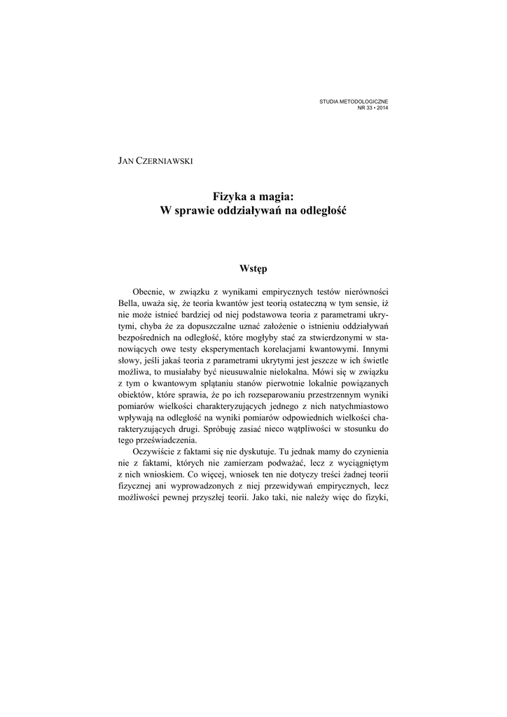 STUDIA METODOLOGICZNE NR 33 • 2014 JAN CZERNIAWSKI Fizyka a magia: W sprawie oddziaływań na odległość Wstęp Obecnie, w związku z wynikami empirycznych testów nierówności Bella, uważa się, że teoria kwantów jest teorią ostateczną w tym sensie, iż nie może istnieć bardziej od niej podstawowa teoria z parametrami ukrytymi, chyba że za dopuszczalne uznać założenie o istnieniu oddziaływań bezpośrednich na odległość, które mogłyby stać za stwierdzonymi w stanowiących owe testy eksperymentach korelacjami kwantowymi. Innymi słowy, jeśli jakaś teoria z parametrami ukrytymi jest jeszcze w ich świetle możliwa, to musiałaby być nieusuwalnie nielokalna. Mówi się w związku z tym o kwantowym splątaniu stanów pierwotnie lokalnie powiązanych obiektów, które sprawia, że po ich rozseparowaniu przestrzennym wyniki pomiarów wielkości charakteryzujących jednego z nich natychmiastowo wpływają na odległość na wyniki pomiarów odpowiednich wielkości charakteryzujących drugi. Spróbuję zasiać nieco wątpliwości w stosunku do tego przeświadczenia. Oczywiście z faktami się nie dyskutuje. Tu jednak mamy do czynienia nie z faktami, których nie zamierzam podważać, lecz z wyciągniętym z nich wnioskiem. Co więcej, wniosek ten nie dotyczy treści żadnej teorii fizycznej ani wyprowadzonych z niej przewidywań empirycznych, lecz możliwości pewnej przyszłej teorii. Jako taki, nie należy więc do fizyki, 98 JAN CZERNIAWSKI lecz do filozofii fizyki – niezależnie od profesji tego, kto by go wyciągał. Zajmując się zaś od lat filozofią nauki, zauważyłem dość osobliwe zjawisko: otóż w dziedzinie, która powinna przecież być domeną krytycznego racjonalizmu, funkcjonują powszechnie uznane tezy o charakterze bezpodstawnych dogmatów. Wprawdzie czasem próbuje się na ich rzecz argumentować, jednak argumentacja bywa w luźnym związku z tezą, którą miała uzasadniać. Co gorsza, zdarza się, że na ich rzecz przytacza się argumenty, które świadczą… na rzecz tezy przeciwnej! Oznaczałoby to, że „uzasadniana” w ten sposób teza nie tylko jest bezzasadnym przesądem, ale wręcz jest zabobonem w rozumieniu Bocheńskiego, tj. jest to „wierzenie, które jest (1) oczywiście w wysokim stopniu fałszywe, a mimo to (2) uważane za na pewno prawdziwe” [Bocheński, 1994, s. 10]. Przygody tego rodzaju zdarzały mi się w obu dziedzinach filozofii nauki, zarówno w metodologii nauk, jak i w refleksji nad metafizycznymi implikacjami teorii naukowych. Spróbuję to stwierdzenie zilustrować kolejno przykładami z każdej z nich, by następnie zastanowić się, czy podobnego statusu nie ma wspomniany wyżej pogląd. W końcu przedstawię argumentację sugerującą, że taki status mieć może. Zanim przejdę do przykładów, zwrócę uwagę na jeszcze jedno zjawisko w filozofii nauki, związane ze wspomnianym wyżej w tym sensie, że do pewnego stopnia tłumaczy występowanie tamtego. Otóż każdy przyszły filozof nauki przechodzi proces mniej lub bardziej formalnej edukacji. Jego nauczyciele zaś, aby szybciej osiągnąć odpowiednie efekty kształcenia, stosują różne uproszczenia dydaktyczne. Teoretycznie obowiązuje przy tym niepisana zasada, by w ich ramach mówić wprawdzie nie CAŁĄ prawdę, ale jednak TYLKO prawdę. Niestety, nie każdy tej zasady się trzyma i razem z prawdą przemycane są stwierdzenia fałszywe, których intencją jest zasugerowanie adeptom rzekomej nieuchronności różnych niewystarczająco uzasadnionych rozstrzygnięć preferowanych przez ich mistrza. Wielu z nich potem trudno się przed sobą przyznać, że dali się zmanipulować, więc całą swoją inteligencję wysilają na dorabianie do tych rozstrzygnięć pseudouzasadnień, zamiast nabrać dystansu do wpojonych im przeświadczeń i poszukiwać rzetelnych rozstrzygnięć odpowiednich kwestii oraz rzetelnych uzasadnień dla nich. Sprzyja to petryfikacji w filo- Fizyka a magia: W sprawie oddziaływań na odległość 99 zofii nauki różnych przesądów, czy wręcz rozumianych jak wyżej zabobonów. Nieco uwagi poświęcę więc również omówieniu przykładów takich „uproszczeń dydaktycznych”. Zabobony w metodologii nauk Drastycznym przykładem przesądu, czy wręcz zabobonu, w metodologii nauk jest teza Duhema-Quine’a, zgodnie z którą każdą hipotezę można obronić przed falsyfikacją przez odpowiednią modyfikację hipotez pomocniczych, w których „towarzystwie”, w świetle tezy sformułowanej przez Pierre’a Duhema, występuje ona do testu empirycznego. Jak już dawno wykazano, w odróżnieniu od tezy Duhema, jej wzmocniona wersja autorstwa Willarda Van Orman Quine’a nie ma żadnej podstawy logicznej [Grünbaum, 1960; Czerniawski, 1998] ani nawet empirycznego oparcia w historii nauki [Andersson, 1988, r. 7, 4, 3]. Ewidentnym zabobonem jest natomiast pogląd, który można nazwać „konwencjonalizmem bazowym”. W jego ramach uważa się, że składające się na empiryczną bazę nauki zdania obserwacyjne są w pewnym sensie konwencjami [Popper, 1977, §30]. Doznania percepcyjne eksperymentatora nie uzasadniają bowiem takiego zdania „w większym stopniu niż przez walenie pięścią w stół”. Jest ono hipotezą, którą zawsze można dalej sprawdzać, konfrontując ją z innymi zdaniami bazowymi, które jednak również są hipotezami, więc też mogą być sprawdzane tylko w ten sposób. „Procedura ta nie ma naturalnego końca”, zatem można ją przerwać tylko arbitralną decyzją, by pewnych zdań bazowych dalej nie sprawdzać. Hipotetyczny charakter zdań bazowych niewątpliwie wynika z ich uteoretyzowania, wyrażającego się w uzależnieniu ich uznania od przyjętych hipotez ogólnych. Naturalne zaś wydaje się przyjąć, iż uzależnienie to jest stopniowalne, w związku z czym budzące kontrowersje pomiędzy zwolennikami różnych teorii zdania bazowe powinno się sprawdzać przez ich konfrontację ze