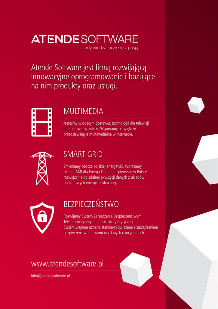 ...gdy wiedza łączy się z pasją Atende Software jest firmą rozwijającą innowacyjne oprogramowanie i bazujące na nim produkty oraz usługi. MULTIMEDIA Jesteśmy wiodącym dostawcą technologii dla telewizji internetowej w Polsce. Wspieramy największe przedsięwzięcia multimedialne w Internecie. SMART GRID Zmieniamy oblicze polskiej energetyki. Wdrażamy system AMI dla Energa Operator - pierwsze w Polsce rozwiązanie do zdalnej akwizycji danych z układów pomiarowych energii elektrycznej. BEZPIECZEŃSTWO Rozwijamy System Zarządzania Bezpieczeństwem Teleinformatycznym Infrastruktury Krytycznej. System wspiera uznane standardy związane z zarządzaniem bezpieczeństwem i wymianą danych o incydentach. www.atendesoftware.pl [email protected] MULTIMEDIA Jesteśmy wiodącym dostawcą technologii dla telewizji internetowej i partnerem technologicznym najważniejszych przedsięwzięć multimedialnych w Polsce m. in. Player. pl (TVN S.A.) i ipla.tv (Cyfrowy Polsat S.A.). Rozwijamy i utrzymujemy największy system dystrybucji treści w kraju – redCDN. Na bazie autorskiej technologii Atende Software oferujemy usługi i produkty wspierające cały proces związany z przekazem multimedialnym w Internecie, począwszy od wprowadzenia kodowania, opisywania i archiwizacji treści, aż po jej sprzedaż, dystrybucję i prezentację oraz analizę oglądalności. Tworzymy także portale multimedialne i aplikacje dla urządzeń mobilnych oraz telewizorów Smart TV. BEZPIECZEŃSTWO SMART GRID Od marca 2011 Atende Software rozwija system MDM (Meter Data Management) dla sieci Smart Grid służący do zdalnej akwizycji, przechowywania i udostępniania danych pomiarowych. W ramach tej działalności Spółka realizuje wdrożenie systemu AMI dla Energa Operator S.A. – największe wdrożenie Smart Grid w Polsce. System AMI służy do zdalnej akwizycji, przetwarzania i udostępniania danych pomiarowych, pozyskiwanych z nowoczesnych liczników energii elektrycznej. Założeniem projektu jest objęcie zdalnym odczytem klientów komunalnych i wykorzystania technologii PLC jako podstawy do komunikacji z układami pomiarowymi. W obecnej fazie projektu zdalnym odczytrm ma zostać objętych 800 tys. układów pomiarowych, docelowo system ma obsługiwać wszystkich klientów Energa Operator S.A. Spółka rozwija System Bezpieczeństwa Teleinformatycznego Infrastruktury Krytycznej (SBTI IK) przeznaczony dla administracji publicznej i ochrony infrastruktury krytycznej. System ten umożliwia zarządzanie pełnym cyklem życia infrastruktury krytycznej: od projektowania, przez certyfikację, eksploatację, aż po wycofywanie. Ponadto, wspierane są procesy związane z ewidencjonowaniem infrastruktury, zarządzaniem podatnościami i politykami bezpieczeństwa oraz obsługą incydentów. System wykorzystuje standardy z rodziny SCAP (Security Content Automation Protocol) rozwijane przez NIST (USA) do sformalizowanego, jednolitego opisu różnych aspektów bezpieczeństwa systemów – polityki bezpieczeństwa, konfiguracji, podatności, zagrożeń, incydentów oraz reguł automatycznych testów. Spółka prowadzi również działalność w zakresie audytów bezpieczeństwa oraz szkoleń przeznaczonych dla członków zespołów CERT/CSIRT. Tworząc Grupę Kapitałową planujemy uruchomienie kolejnych obszarów działalności związanych z rozwojem i wdrażaniem innowacyjnego oprogramowania.