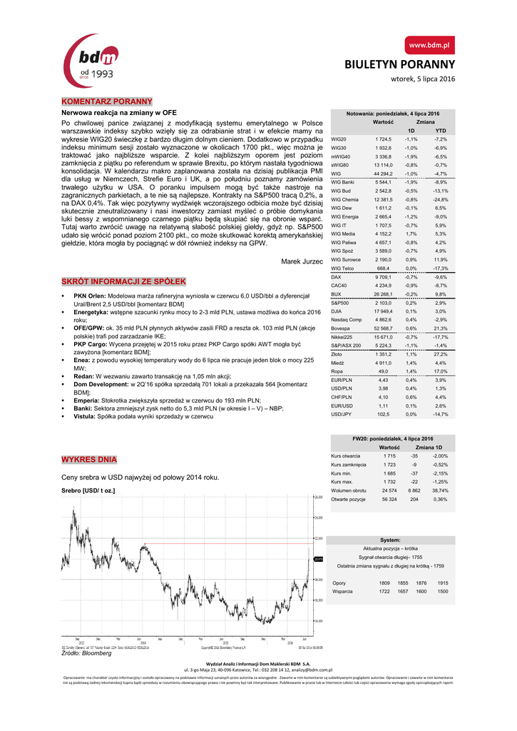 BIULETYN PORANNY wtorek, 5 lipca 2016 KOMENTARZ PORANNY Nerwowa reakcja na zmiany w OFE Notowania: poniedziałek, 4 lipca 2016 Po chwilowej panice związanej z modyfikacją systemu emerytalnego w Polsce warszawskie indeksy szybko wzięły się za odrabianie strat i w efekcie mamy na wykresie WIG20 świeczkę z bardzo długim dolnym cieniem. Dodatkowo w przypadku indeksu minimum sesji zostało wyznaczone w okolicach 1700 pkt., więc można je traktować jako najbliższe wsparcie. Z kolei najbliższym oporem jest poziom zamknięcia z piątku po referendum w sprawie Brexitu, po którym nastała tygodniowa konsolidacja. W kalendarzu makro zaplanowana została na dzisiaj publikacja PMI dla usług w Niemczech, Strefie Euro i UK, a po południu poznamy zamówienia trwałego użytku w USA. O poranku impulsem mogą być także nastroje na zagranicznych parkietach, a te nie są najlepsze. Kontrakty na S&P500 tracą 0,2%, a na DAX 0,4%. Tak więc pozytywny wydźwięk wczorajszego odbicia może być dzisiaj skutecznie zneutralizowany i nasi inwestorzy zamiast myśleć o próbie domykania luki bessy z wspomnianego czarnego piątku będą skupiać się na obronie wsparć. Tutaj warto zwrócić uwagę na relatywną słabość polskiej giełdy, gdyż np. S&P500 udało się wrócić ponad poziom 2100 pkt., co może skutkować korektą amerykańskiej giełdzie, która mogła by pociągnąć w dół również indeksy na GPW. Marek Jurzec Wartość PKN Orlen: Modelowa marża rafineryjna wyniosła w czerwcu 6,0 USD/bbl a dyferencjał Ural/Brent 2,5 USD/bbl [komentarz BDM] Energetyka: wstępne szacunki rynku mocy to 2-3 mld PLN, ustawa możliwa do końca 2016 roku; OFE/GPW: ok. 35 mld PLN płynnych aktywów zasili FRD a reszta ok. 103 mld PLN (akcje polskie) trafi pod zarzadzanie IKE; PKP Cargo: Wycena przejętej w 2015 roku przez PKP Cargo spółki AWT mogła być zawyżona [komentarz BDM]; Enea: z powodu wysokiej temperatury wody do 6 lipca nie pracuje jeden blok o mocy 225 MW; Redan: W wezwaniu zawarto transakcję na 1,05 mln akcji; Dom Development: w 2Q’16 spółka sprzedałą 701 lokali a przekazała 564 [komentarz BDM]; Emperia: Stokrotka zwiększyła sprzedaż w czerwcu do 193 mln PLN; Banki: Sektora zmniejszył zysk netto do 5,3 mld PLN (w okresie I – V) – NBP; Vistula: Spółka podała wyniki sprzedaży w czerwcu YTD WIG20 1 724,5 -1,1% -7,2% WIG30 1 932,6 -1,0% -6,9% mWIG40 3 336,8 -1,9% -6,5% sWIG80 13 114,0 -0,8% -0,7% WIG 44 294,2 -1,0% -4,7% WIG Banki 5 544,1 -1,9% -8,9% WIG Bud 2 542,8 -0,5% -13,1% WIG Chemia 12 381,5 -0,8% -24,8% WIG Dew 1 611,2 -0,1% 6,5% WIG Energia 2 665,4 -1,2% -9,0% WIG IT 1 707,5 -0,7% 5,9% WIG Media 4 152,2 1,7% 5,3% WIG Paliwa 4 657,1 -0,8% 4,2% WIG Spoż 3 589,0 -0,7% 4,9% WIG Surowce 2 190,0 0,9% 11,9% WIG Telco SKRÓT INFORMACJI ZE SPÓŁEK Zmiana 1D 668,4 0,0% -17,3% DAX 9 709,1 -0,7% -9,6% CAC40 4 234,9 -0,9% -8,7% BUX 26 268,1 -0,2% 9,8% S&P500 2 103,0 0,2% 2,9% DJIA 17 949,4 0,1% 3,0% Nasdaq Comp 4 862,6 0,4% -2,9% Bovespa 52 568,7 0,6% 21,3% Nikkei225 15 671,0 -0,7% -17,7% S&P/ASX 200 5 224,3 -1,1% -1,4% Złoto 1 351,2 1,1% 27,2% Miedź 4 911,0 1,4% 4,4% Ropa 49,0 1,4% 17,0% EUR/PLN 4,43 0,4% 3,9% USD/PLN 3,98 0,4% 1,3% CHF/PLN 4,10 0,6% 4,4% EUR/USD 1,11 0,1% 2,6% USD/JPY 102,5 0,0% -14,7% FW20: poniedziałek, 4 lipca 2016 Wartość Zmiana 1D Kurs otwarcia 1 715 -35 -2,00% Kurs zamknięcia 1 723 -9 -0,52% Ceny srebra w USD najwyżej od połowy 2014 roku. Kurs min. 1 685 -37 -2,15% Kurs max. 1 732 -22 -1,25% Srebro [USD/ t oz.] Wolumen obrotu 24 574 6 862 38,74% Otwarte pozycje 56 324 204 0,36% WYKRES DNIA System: Aktualna pozycja – krótka Sygnał otwarcia długiej– 1755 Ostatnia zmiana sygnału z długiej na krótką - 1759 Opory 1809 1855 1876 1915 Wsparcia 1722 1657 1600 1500 Źródło: Bloomberg Wydział Analiz i Informacji Dom Maklerski BDM S.A. ul. 3-go Maja 23, 40-096 Katowice, Tel.: 032 208 14 12, [email protected] Opracowanie ma charakter czysto informacyjny i zostało opracowany na podstawie informacji uznanych przez autorów za wiarygodne . Zawarte w nim komentarze są subiektywnymi poglądami autorów. Opracowanie i zawarte w nim komentarze nie są podstawą żadnej rekomendacji kupna bądź sprzedaży w rozumieniu obowiązującego prawa i nie powinny być tak interpretowane. Publikowanie w prasie lub w Internecie całości lub części opracowania wymaga zgody sporządzających raport. BIULETYN PORANNY wtorek, 5 lipca 2016 GPW PODSUMOWANIE FW20 (1,715.00, 1,732.00, 1,685.00, 1,723.00, -9.00000) Indeksy GPW 2000 1950 1900 1850 1800 1750 1700 1650 21 4 11 2016 18 25 1 8 15 February 22 29 7 March 14 21 29 4 11 April 18 25 2 9 May 16 23 30 6 June 13 20 27 4 July 11 18 WIG20 (1,728.89, 1,735.41, 1,697.33, 1,724.50, -20.0601) 2000 1950 1900 1850 1800 1750 1700 1650 21 4 11 2016 18 25 1 8 15 February 22 29 7 March 14 21 29 4 11 April 18 25 2 9 May 16 23 30 6 June 13 20 27 4 July 11 18 KOMENTARZ POPOŁUDNIOWY Koniec OFE W zeszłym tygodniu inwestorzy dowiedzieli się, że wkrótce poznają nowe plany rządowe w zakresie oszczędności kapitałowych, w tym być może zmiany w OFE. W sobotę na konwencji PiS pojawiły się w tej sprawie niejasne slogany i na szczęście Ministerstwo Rozwoju postanowiło dzisiaj jeszcze przed otwarciem sesji zakomunikować plany m.in. dotyczące losów OFE. Rynek zareagował negatywnie, indeks WIG20 kolejny raz był słabszy od otoczenia i większość spółek na GPW traciła dziś na wartości. Ostateczny rezultat sesji to 1,1% przecena blue chips, lecz mimo dominującego koloru czerwonego można moim zdaniem wyciągnąć z tej sesji kilka pozytywów. Pierwszy raz od długiego czasu politycy przypomnieli sobie o GPW, o czym świadczy godzina i miejsce dzisiejszej konferencji. Ponadto w samej prezentacji podkreślano, że celem zmian nie jest zwiększanie podaży akcji na rynku. Mimo tego, że „diabeł tkwi w szczegółach”, które będą opracowywane jeszcze przez wiele miesięcy, ta dbałość (w pewnym sens