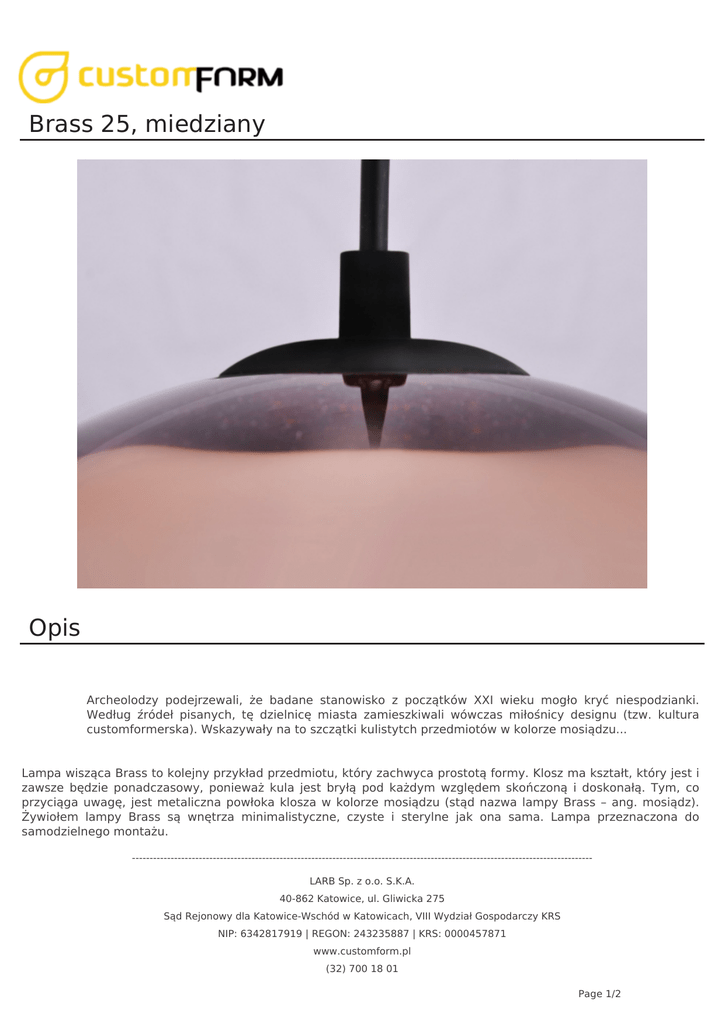 Brass 25, miedziany Opis Archeolodzy podejrzewali, że badane stanowisko z początków XXI wieku mogło kryć niespodzianki. Według źródeł pisanych, tę dzielnicę miasta zamieszkiwali wówczas miłośnicy designu (tzw. kultura customformerska). Wskazywały na to szczątki kulistytch przedmiotów w kolorze mosiądzu... Lampa wisząca Brass to kolejny przykład przedmiotu, który zachwyca prostotą formy. Klosz ma kształt, który jest i zawsze będzie ponadczasowy, ponieważ kula jest bryłą pod każdym względem skończoną i doskonałą. Tym, co przyciąga uwagę, jest metaliczna powłoka klosza w kolorze mosiądzu (stąd nazwa lampy Brass – ang. mosiądz). Żywiołem lampy Brass są wnętrza minimalistyczne, czyste i sterylne jak ona sama. Lampa przeznaczona do samodzielnego montażu. ----------------------------------------------------------------------------------------------------------------------------------LARB Sp. z o.o. S.K.A. 40-862 Katowice, ul. Gliwicka 275 Sąd Rejonowy dla Katowice-Wschód w Katowicach, VIII Wydział Gospodarczy KRS NIP: 6342817919 | REGON: 243235887 | KRS: 0000457871 www.customform.pl (32) 700 18 01 Page 1/2 Lampa Brass. Ponadczasowe piękno Specyfikacja Wysokość z kablem max150 cm Gwint żarówki E27 Moc żarówki max 60W Ilość żarówek 1 Żarówka w komplecie nie Klosz szkło Średnica klosza 25 cm Dodatkowe zdjęcia ----------------------------------------------------------------------------------------------------------------------------------LARB Sp. z o.o. S.K.A. 40-862 Katowice, ul. Gliwicka 275 Sąd Rejonowy dla Katowice-Wschód w Katowicach, VIII Wydział Gospodarczy KRS NIP: 6342817919 | REGON: 243235887 | KRS: 0000457871 www.customform.pl (32) 700 18 01 Page 2/2 Powered by TCPDF (www.tcpdf.org)