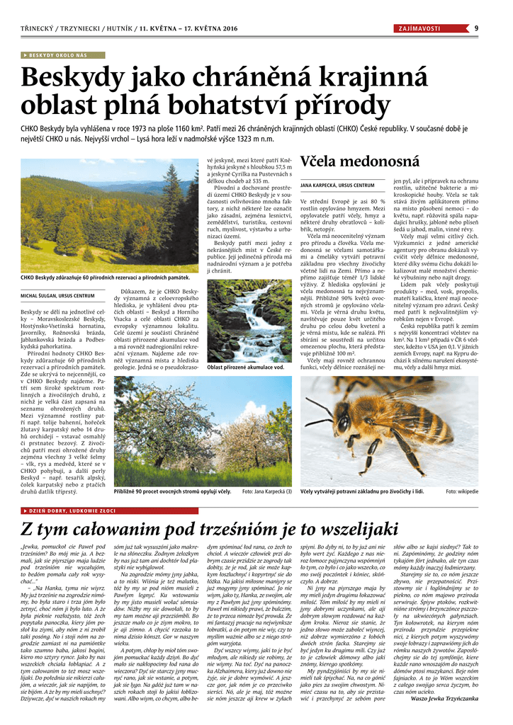 TŘINECK Ý / TR Z YNIECKI / HUTNÍK / 11. k větna – 17. k větna 2016 9 Z aj í mavosti B ESK Y DY O KO LO N Á S Beskydy jako chráněná krajinná oblast plná bohatství přírody CHKO Beskydy byla vyhlášena v roce 1973 na ploše 1160 km². Patří mezi 26 chráněných krajinných oblastí (CHKO) České republiky. V současné době je největší CHKO u nás. Nejvyšší vrchol – Lysá hora leží v nadmořské výšce 1323 m n.m. CHKO Beskydy zdůrazňuje 60 přírodních rezervací a přírodních památek. MICHAL ŠULGAN, URSUS CENTRUM Beskydy se dělí na jednotlivé celky – Moravskoslezské Beskydy, Hostýnsko-Vsetínská hornatina, Javorníky, Rožnovská brázda, Jablunkovská brázda a Podbeskydská pahorkatina. Přírodní hodnoty CHKO Beskydy zdůrazňuje 60 přírodních rezervací a přírodních památek. Zde se ukrývá to nejcennější, co v CHKO Beskydy najdeme. Patří sem široké spektrum rostlinných a živočišných druhů, z nichž je velká část zapsaná na seznamu ohrožených druhů. Mezi významné rostliny patří např. tolije bahenní, hořeček žlutavý karpatský nebo 14 druhů orchidejí – vstavač osmahlý či prstnatec bezový. Z živočichů patří mezi ohrožené druhy zejména všechny 3 velké šelmy – vlk, rys a medvěd, které se v CHKO pohybují, a další perly Beskyd – např. tesařík alpský, čolek karpatský nebo z ptačích druhů datlík tříprstý. Důkazem, že je CHKO Beskydy významná z celoevropského hlediska, je vyhlášení dvou ptačích oblastí – Beskyd a Horního Vsacka a celé oblasti CHKO za evropsky významnou lokalitu. Celé území je součástí Chráněné oblasti přirozené akumulace vod a má rovněž nadregionální rekreační význam. Najdeme zde rovněž významná místa z hlediska geologie. Jedná se o pseudokraso- vé jeskyně, mezi které patří Kněhyňská jeskyně s hloubkou 57,5 m a jeskyně Cyrilka na Pustevnách s délkou chodeb až 535 m. Původní a dochované prostředí území CHKO Beskydy je v současnosti ovlivňováno mnoha faktory, z nichž některé lze označit jako zásadní, zejména lesnictví, zemědělství, turistiku, cestovní ruch, myslivost, výstavbu a urbanizaci území. Beskydy patří mezi jedny z nekrásnějších míst v České republice. Její jedinečná příroda má nadnárodní význam a je potřeba ji chránit. Oblast přirozené akumulace vod. Přibližně 90 procet ovocných stromů opylují včely. Foto: Jana Karpecká (3) Včela medonosná JANA KARPECKÁ, URSUS CENTRUM Ve střední Evropě je asi 80 % rostlin opylováno hmyzem. Mezi opylovatele patří včely, hmyz a některé druhy obratlovců – kolibřík, netopýr. Včela má neocenitelný význam pro přírodu a člověka. Včela medonosná se včelami samotářkami a čmeláky vytváří potravní základnu pro všechny živočichy včetně lidí na Zemi. Přímo a nepřímo zajišťuje téměř 1/3 lidské výživy. Z hlediska opylování je včela medonosná ta nejvýznamnější. Přibližně 90% květů ovocných stromů je opylováno včelami. Včela je věrná druhu květu, navštěvuje pouze květ určitého druhu po celou dobu kvetení a je věrná místu, kde se nalézá. Při sbírání se soustředí na určitou omezenou plochu, která představuje přibližně 100 m². Včely mají rovněž ochrannou funkci, včely dělnice roznášejí ne- jen pyl, ale i přípravek na ochranu rostlin, užitečné bakterie a mikroskopické houby. Včela se tak stává živým aplikátorem přímo na místo působení nemoci – do květu, např. růžovitá spála napadající hrušky, jabloně nebo plíseň šedá u jahod, malin, vinné révy. Včely mají velmi citlivý čich. Výzkumníci z jedné americké agentury pro obranu dokázali vycvičit včely dělnice medonosné, které díky svému čichu dokáží lokalizovat malé množství chemické výbušniny nebo najít drogy. Lidem pak včely poskytují produkty – med, vosk, propolis, mateří kašičku, které mají neocenitelný význam pro zdraví. Český med patří k nejkvalitnějším výrobkům nejen v Evropě. Česká republika patří k zemím s nejvyšší koncentrací včelstev na km². Na 1 km² připadá v ČR 6 včelstev, kdežto v USA jen 0,1. V jižních zemích Evropy, např. na Kypru dochází k silnému narušení ekosystému, včely a další hmyz mizí. Včely vytvářejí potravní základnu pro živočichy i lidi. Foto: wikipedie D Z I E Ń D O B R Y, L U D K O W I E Z Ł O C I Z tym całowanim pod trześnióm je to wszelijaki „Jewka, pomuckoł cie Paweł pod trześnióm? Bo mój mie ja. A bezmali, jak sie piyrszigo maja ludzie pod trześnióm nie wycałujóm, to bedóm pomału cały rok wysychać...” – „Na Hanka, tymu nie wiyrz. My już trześnie na zogrodzie nimómy, bo była staro i trza jóm było zetnyć, choć nóm ji było luto. A że była pieknie rozłożysto, tóż żech popytała panoczka, kiery jóm posłoł ku ziymi, aby nóm z ni zrobił taki posóng. No i stoji nóm na zogrodzie zamiast ni na pamióntke tako szumno baba, jakosi bogini, kiero mo sztyry rynce. Jako by nas wszeckich chciała łobłapiać. A z tym całowanim to też mosz wszelijaki. Do połednia sie nikierzi całujóm, a wieczór, jak sie napijóm, to sie bijóm. A że by my mieli uschnyć? Dziywcze, dyć w naszich rokach my sóm już tak wysuszóni jako makrele na słóneczku. Żodnym żelozkym by nas już tam ani dochtór łod plastyki nie wybiglowoł. Na zogrodzie mómy jyny jabka, a to niski. Wiśnia je też malutko, tóż by my se pod nióm musieli z Pawłym legnyć. Ku wstowaniu by my jisto musieli wołać sómsiadów. Niżby my sie dowołali, to by my tam możne aji przeziómbli. Bo jeszcze mało co je ziym mokro, to je aji zimno. A chycić rzezoka to nima dzisio kónszt. Gor w naszym wieku. A potym, chłop by mioł tóm swojóm pomuckać każdy dziyń. Bo dyć mało sie nakłopocimy łod rana do wieczora? Dy