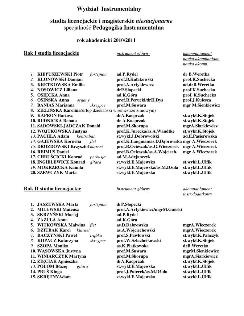 Wydział Instrumentalny studia licencjackie i magisterskie niestacjonarne specjalność Pedagogika Instrumentalna rok akademicki 2010/2011 Rok I studia licencjackie instrument główny akompaniament nauka akompaniam. nauka akomp. 1. KIEPUSZEWSKI Piotr fortepian ad.P.Rydel dr B.Weretka 2. KLONOWSKI Damian prof.B.Kułakowski prof.K.Suchecka 3. KRĘTKOWSKA Emilia prof.A.Artykiewicz ad.drB.Weretka 4. NOSOWICZ Liliana drP.Słopecki prof.K.Suchecka 5. OSIECKA Anna ad.K.Góra prof. K.Suchecka 6. OSIŃSKA Anna organy prof.R.Perucki/drH.Dys prof.J.Kulesza 7. BANIAS Marianna skrzypce prof.M.Suwara mgr M.Sienkiewicz 8. ZIELIŃSKA Karolina(urlop dziekański w semestrze zimowym) 9. KAPROŃ Bartosz drA.Kacprzak st.wykł.K.Stojek 10. RUDNICKA Renata dr A.Kacprzak st.wykł.K.Stojek 11. SADOWSKI-JADCZAK Donald prof.M.Skorupa mgrA.Siarkiewicz 12. WOJTKOWSKA Justyna prof.K.Jurecka/as.A.Wandtke st.wykł.K.Stojek 13. PACHLA Adam kontrabas st.wykł.J.Dobrowolski ad.E.Pasierowska 14. GAJEWSKA Kornelia flet prof.K.Langman/as.D.Dąbrowska mgr A.Wieczorek 15. DROZDOWSKI Krzysztof klarnet prof.B.Ocieszak/as.G.Wieczorek mgr A.Wieczorek 16. REIMUS Daniel prof.B.Ocieszak/as.A.Wojciech. mgr A.Wieczorek 17. CHRUŚCICKI Konrad perkusja ad.M.Adrjanczyk 18. INGIELEWICZ Konrad gitara st.wykł.E.Majewska st.wykł.L.Ulfik 19. MOKRZECKA Kamila st.wykł.E.Majewska/as.M.Dżuła st.wykł.L.Ulfik 20. SZEWCZYK Marta st.wykł.E.Majewska st.wykł.L.Ulfik Rok II studia licencjackie 1. JASZEWSKA Marta fortepian 2. MILEWSKI Mateusz 3. SKRZYŃSKI Maciej 4. ZAZULA Anna 5. WITKOWSKA Malwina flet 6. DZIUBAK Karol klarnet 7. RACZYŃSKI Paweł trąbka 8. KOPACZ Katarzyna skrzypce 9. SZOPA Monika 10. WĄSOWSKA Justyna 11. WINIARCZYK Martyna 12. ZIĘCIAK Agnieszka 13. POŁOM Błażej gitara 14. PRUŚ Kinga 15. SKRĘTNYAdam instrument główny akompaniament instr.dodatkowy drP.Słopecki prof.A.Artykiewicz/mgrM.Gański ad.P.Rydel ad.K.Góra as.D.Dąbrowska mgrA.Wieczorek as.A.Wojciechowski mgrA.Wieczorek prof.S.Pawłowski st.wykł.K.Pańczyk prof.W.Szlachcikowski st.wykł.K.Stojek as.K.Piątkowska drB.Weretka prof.M.Suwara mgrM.Sienkiewicz prof.M.Skorupa mgrA.Siarkiewicz drA.Kacprzak st.wykł.K.Stojek st.wykł.E.Majewska st.wykł.L.Ulfik prof.J.Paterek/as.M.Dżuła st.wykł.L.Ulfik st.wykł.E.Majewska st.wykł.L.Ulfik Rok III studia licencjackie 1. NOWAK Joanna 2. PĘKALA Joanna 3. ZIELIŃSKA Edyta 4. WRÓBEL Agnieszka 5. GĄSOWSKA Barbara 6. MALINOWSKA Alicja 7. POTYŃSKA Katarzyna 8. SZCZĘSNY Krzysztof 9. FEDORUK Kamil 10. WIŚNIEWSKI Wojciech 11. WOJTYŁA Michał 12. LINKO Piotr instrument główny fortepian akordeon skrzypce flet klarnet trąbka puzon perkusja R o k I studia magisterskie II st. akompaniament ad.K.Góra prof.W.Wiesztordt ad.P.Rydel urlop dziekański na rok 2010/2011 prof.W.Szlachcikowski st.wykł.K.Stojek prof.M.Skorupa mgr A.Siarkiewicz prof.K.Langman/as.D.Dąbrowska mgrA.Wieczorek as.G.Wieczorek mgr A.Wieczorek prof.S.Pawłowski st.wykł.K.Pańczyk prof.R.Gryń mgrM.Ochlik prof.M.Zawadzka st.wykł.B.Szull urlop dziekański na rok 2010/2011 instrument główny akompaniament nauka akompaniament 1. KALINOWSKA Adrianna fortepian 2. RAKOTOSON Nathalia 3. KOTELCZUK Mirosław akordeon 4. ZIELIŃSKI Szczepan 5. MAJEWSKA Joanna flet 6. PACZUSKI Paweł klarnet 7. JÓZEFCZUK Katarzyna skrzypce 8. KUŹNIAK Agnieszka 9. SZUKSZTUL Maciej 10. KIJEK Joanna wiolonczela 11. BAGIŃSKI Arkadiusz gitara Rok II studia magisterskie 1. 2. 3. 4. 5. 6. 7. 8. 9. KOWALSKA Żaneta fortepian PIĘDZIA Sławomir akordeon JUDZIŃSKA Hanna flet OSTROWSKI Krzysztof trąbka CHOJNACKI Roman skrzypce KOŁOSOWSKI Tomasz TRESZCZOTKA Weronika TARNAWSKI Jakub gitara WILGOS Witold ad.P.Rydel prof.B.Czapiewski prof.E.Rosińska prof.E.Rosińska/as.P.Zagańczyk st.wykł. E.Czapor as.G.Wieczorek prof.M.Suwara prof.M.Skorupa prof. M.Skorupa prof.J.Wujtewicz prof.J.Paterek/as.M.Dżuła prof.K.Suchecka przedmiot zaliczony instrument główny akompaniament prof.A.Artykiewicz prof.E.Rosińska prof.K.Langman prof..S.Pawłowski prof.M.Suwara prof.M.Sobczak st.wykł.E.Raatz prof.J.Paterek prof.J.Paterek mgr K.Markiewicz mgrA.Wieczorek drB.Weretka-Bajdor mgrA.Siarkiewicz mgrA.Siarkiewicz wykł.M.Darska st.wykł.L.Ulfik mgr A.Siarkiewicz mgr A.Wieczorek st.wykł.K.Pańczyk mgrK.Markiewicz st.wykł.K.Pańczyk st.wykł.K.Pańczyk st.wykł.L.Ulfik st.wykł.L.Ulfik