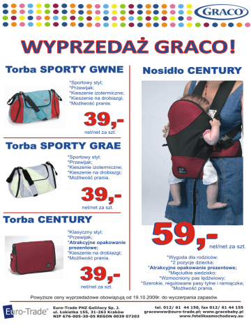 WYPRZEDAŻ GRACO! Torba SPORTY GWNE Nosidło CENTURY *Sportowy styl; *Przewijak; *Kieszenie izotermiczne; *Kieszenie na drobiazgi; *Możliwość prania. 39,net/net za szt. Torba SPORTY GRAE *Sportowy styl; *Przewijak; *Kieszenie izotermiczne; *Kieszenie na drobiazgi; *Możliwość prania. 39,net/net za szt. Torba CENTURY *Klasyczny styl; *Przewijak; *Atrakcyjne opakowanie prezentowe; *Kieszenie na drobiazgi; *Możliwość prania. 39,net/net za szt. 59,- net/net za szt. *Wygoda dla rodziców; *2 pozycje dziecka; *Atrakcyjne opakowanie prezentowe; *Mięciutkie siedzisko; *Wzmocniony pas lędźwiowy; *Szerokie, regulowane pasy tylne i ramiączka; *Możliwość prania. Powyższe ceny wyprzedażowe obowiązują od 19.10.2009r. do wyczerpania zapasów. Euro-Trade PHZ Golińscy Sp. J. ul. Łokietka 155, 31-263 Kraków NIP 676-005-30-05 REGON 0039 07203 tel. 012/ 61 44 150, fax 012/ 61 44 155 [email protected]; www.gracobaby.pl www.foteliksamochodowy.eu