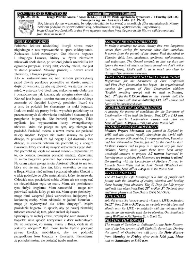 XXVI NIEDZIELA ZWYKŁA Czytania liturgiczne / Readings Sept. 25, 2016 Księga Proroka Amosa / Amos (6:1,4-7) 1 List św. Pawła Apostoła do Tymoteusza / 1 Timothy (6:11-16) Ewangelia wg św. Łukasza / Luke (16:19-31) Bóg kieruje do nas wezwanie, by odpowiedzialnie korzystać z wszelkich dóbr materialnych. Mamy bowiem podążać za sprawiedliwością, pobożnością, wiarą, wytrwałością i łagodnością. In the Gospel our Lord tells us that if we separate ourselves from the poor in this life, we will be separated from them in the next. POSIADAĆ MĄDRZE Pobieżna lektura niedzielnej liturgii słowa może niejednego z nas wprowadzić w spore zakłopotanie. Zwłaszcza ludzi zamożnych. Oto historia bogacza i ubogiego Łazarza, którzy w życiu ziemskim mieszkali obok siebie, po śmierci jednak rozdzieliła ich ogromna przepaść, której nikt, choćby chciał, nie jest w stanie pokonać. Mówiąc prościej - Łazarz został zbawiony, a bogacz potępiony. Kto w zastanawianiu się nad sensem przeczytanej przed chwilą perykopy poszedłby na skróty, mógłby dojść do wniosku, że aby się zbawić, wystarczy nic nie mieć, wystarczy być biednym, niekoniecznie obdartym i owrzodzonym jak Łazarz, ale ubogim człowiekiem. Kto zaś jest bogaty i swoim stanem posiadania odbiega znacznie od średniej krajowej, powinien liczyć się z tym, że podzieli los skazanego na męki bogacza. I tak oto rodzi się prosty świat, wyraźnie podzielony na przeznaczonych do zbawienia biedaków i skazanych na potępienie bogatych. Nic bardziej błędnego. Takie myślenie jest wypaczeniem istoty ewangelicznego ubóstwa, które nie polega na tym, aby niczego nie posiadać. Posiadać można, a nawet trzeba, ale posiadać należy mądrze. Bogacz nie został skazany na piekło dlatego, że posiadał, że był bogaty i żył dostatnio, lecz dlatego, że swoimi dobrami nie podzielił się z ubogim Łazarzem, który chciał się nasycić odpadkami z jego stołu. Nie podzielił się, czyli nie okazał miłości – zapomniał, że to, co posiada, powinien posiadać mądrze. Zapomniał, że mimo bogactwa powinien być człowiekiem ubogim. Na czym zatem polega istota ubóstwa? Ubogi to nie ten, który nic nie ma, lecz ten, który wszystko, co ma, ma u Boga. Można mieć miliony i pozostać ubogim. Chodzi tu o takie podejście do dóbr materialnych, które nie zniewala. Człowiek musi powiedzieć sobie: „Mam, ale nie mogę stać się niewolnikiem tego, co mam. Mam, ale powinienem tym służyć drugiemu. Mam samochód – mogę nim podwieźć sąsiada, który go nie ma. Mam sporo pieniędzy – mogę nimi wesprzeć jakąś wartościową inicjatywę lub konkretną osobę. Mam zdolności w jakimś kierunku – mogę je wykorzystać dla dobra drugiego”. Mądre posiadanie bogactw, to sposób, aby po naszej ziemskiej tułaczce znaleźć się tam, gdzie znalazł się Łazarz. Spróbujmy w wolnej chwili przemyśleć nasz stosunek do bogactw, nasz sposób korzystania z dóbr materialnych. Na ile wszystko, co mamy, mamy u Boga, czyli na ile jesteśmy ubogimi? Być może trzeba będzie poczynić pewne korekty, modyfikacje, aby nie podzielić przypadkiem losu bogacza z Ewangelii. Pamiętajmy, że posiadać można, ale posiadać trzeba mądrze. LOOKING BEYOND OURSELVES In today’s readings we learn clearly that true happiness comes from caring for someone other than ourselves. It comes from the pursuit of the virtues Paul described to Timothy: faith, love, gentleness, godliness, righteousness, and endurance. The Gospel reminds us that we dare not ignore the needs of others, acting as though we don’t notice their suffering. God’s call to us is much too clear to disregard for even one more day. FIRST CONFESSION AND FIRST COMMUNION Registration for the Sacrament of First Confession and First Holy Communion has begun. An organizational meeting for parents of First Communion children (English speaking group) will be held on Sunday, Oct. 2nd after the 9:15a.m. Mass in the Parish hall. The religion classes will start on Saturday, Oct. 22nd - place and hour will be announced soon. SACRAMENT OF CONFIRMATION A meeting for parents of candidates for the Sacrament of Confirmation will be held this Sunday, Sept. 25th, at 1:15 p.m. at the church. Confirmation classes will start on Sept. 26th from 6:30 p.m. - 7:45 p.m. at the Parish hall. MOTHERS PRAYERS MOVEMENT Mothers Prayers Movement was formed in England in 1995 and has spread rapidly throughout the world with contacts in over 100 countries. Two grandmothers, Veronica and her sister-in-law Sandra, felt led by the Lord to start Mothers Prayers and to pray in a special way for their children. During these years there have been many wonderful answers to prayers. All women interested in learning more or joining the Movement are invited to attend the meeting with the Coordinator of Mothers Prayers in Canada Dawn Wylie and Sr. Anna Sierak (Windsor) on Wednesday, Sept. 28th at 7:45 p.m. in the Parish hall. 40 DAYS FOR LIFE The 40 Days for Life Campaign is a time of prayer and fasting with the intention of ending abortion and healing those hurting from abortion. The 40 Days for Life prayer vigil will take place from Sept. 28th to Nov. 5th. To book your vigil time, please call Stan Duk at (519) 661-0014. LIFE CHAIN Join this cross city (cross country) witness to LIFE on Sunday, Oct.2nd from 2:30 to 3:30 p.m. as we hold pro-life signs and silently pray for LIFE - in solidarity with the voiceless little ones in our city who die each day by abortion. Our location is along Wellington Rd.(Horton St. to South St). PRAYING THE ROSARY The month of October is dedicated to the Holy Rosary, one of the best known of all Catholic devotions. During the month of October we will pray the Holy Rosary from Monday to Friday after each 7:00 p.m. Mass and on Saturdays at 8:30 a.m.