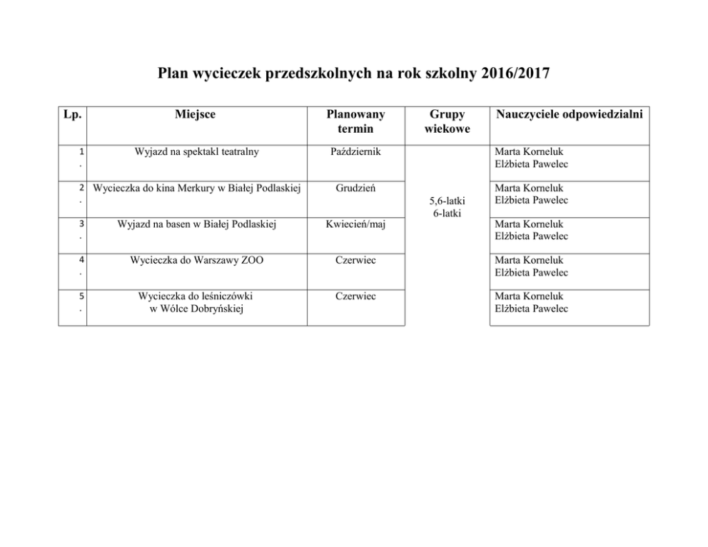 Plan wycieczek przedszkolnych na rok szkolny 2016/2017 Lp. 1 . Miejsce Planowany termin Wyjazd na spektakl teatralny Październik Marta Korneluk Elżbieta Pawelec Grudzień Marta Korneluk Elżbieta Pawelec 2 Wycieczka do kina Merkury w Białej Podlaskiej . Grupy wiekowe 5,6-latki 6-latki Nauczyciele odpowiedzialni 3 . Wyjazd na basen w Białej Podlaskiej Kwiecień/maj 4 . Wycieczka do Warszawy ZOO Czerwiec Marta Korneluk Elżbieta Pawelec 5 . Wycieczka do leśniczówki w Wólce Dobryńskiej Czerwiec Marta Korneluk Elżbieta Pawelec Marta Korneluk Elżbieta Pawelec