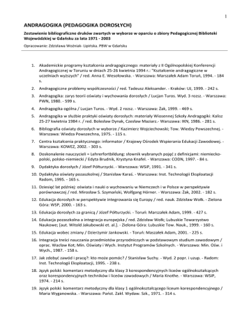 1 ANDRAGOGIKA (PEDAGOGIKA DOROSŁYCH) Zestawienie bibliograficzne druków zwartych w wyborze w oparciu o zbiory Pedagogicznej Biblioteki Wojewódzkiej w Gdańsku za lata 1971 - 2003 Opracowanie: Zdzisława Woźniak- Lipińska. PBW w Gdańsku 1. Akademickie programy kształcenia andragogicznego: materiały z II Ogólnopolskiej Konferencji Andragogicznej w Toruniu w dniach 25-26 kwietnia 1994 r.: "Kształcenie andragogiczne w uczelniach wyższych" / red. Anna E. Wesołowska. - Warszawa: Marszałek Adam Toruń, 1994. - 184 s. 2. Andragogiczne problemy współczesności / red. Tadeusz Aleksander. - Kraków: UJ, 1999. - 242 s. 3. Andragogika: zarys teorii oświaty i wychowania dorosłych / Lucjan Turos. Wyd. 3 rozsz. - Warszawa: PWN, 1980. - 599 s. 4. Andragogika ogólna / Lucjan Turos. - Wyd. 2 rozsz. - Warszawa: Żak, 1999. - 469 s. 5. Andragogika w służbie praktyki oświaty dorosłych: materiały Wiosennej Szkoły Andragogiki: Kalisz 25-27 kwietnia 1984 r. / red. Bolesław Dynak, Czesław Maziarz.- Warszawa: IKN, 1986. - 281 s. 6. Bibliografia oświaty dorosłych w wyborze / Kazimierz Wojciechowski; Tow. Wiedzy Powszechnej. Warszawa: Wiedza Powszechna, 1975. - 115 s. 7. Centra kształcenia praktycznego: informator / Krajowy Ośrodek Wspierania Edukacji Zawodowej. Warszawa: KOWEZ, 2002. - 303 s. 8. Doskonalenie nauczycieli D Lehrerfortbildung: słownik wybranych pojng z definicjami: niemieckopolski, polsko-niemiecki / Edyta Brudnik, Krystyna Knafel. - Warszawa: CODN, 1997. - 84 s. 9. Dydaktyka dorosłych / Józef Półturzycki. - Warszawa: WSiP, 1991. - 341 s. 10. Dydaktyka oświaty pozaszkolnej / Stanisław Karaś. - Warszawa: Inst. Technologii Eksploatacji Radom, 1995. - 165 s. 11. Dziesing lat później: oświata i nauki o wychowaniu w Niemczech i w Polsce w perspektywie porównawczej / red. Mirosław S. Szymański, Wolfgang Hörner. - Warszawa: Żak, 2002. - 182 s. 12. Edukacja dorosłych w perspektywie integrowania sin Europy / red. nauk. Zdzisław Wołk. - Zielona Góra: WSP, 2000. - 163 s. 13. Edukacja dorosłych za granicą / Józef Półturzycki. - Toruń: Marszałek Adam, 1999. - 427 s. 14. Edukacja pozaszkolna a integracja europejska / red. Zdzisław Wołk; Lubuskie Towarzystwo Naukowe; [aut. Witold Jakubowski et. al.]. - Zielona Góra: Lubuskie Tow. Nauk., 1999. - 160 s. 15. Edukacja wobec zmiany / Dzierżymir Jankowski. - Toruń: Maszałek Adam, 2001. - 225 s. 16. Integracja treści nauczania przedmiotów przyrodniczych w podstawowym studium zawodowym / oprac. Wacław Kot; Min. Oświaty i Wych. Instytut Programów Szkolnych. - Warszawa: Min. Ośw. i Wych., 1987. - 158 s. 17. Jak zdobyg zawód i pracn?: kto może pomóc? / Stanisław Suchy. - Wyd. 2 popr. i uzup. - Radom: Inst. Technologii Eksploatacji, 1995. - 238 s. 18. Jnzyk polski: komentarz metodyczny dla klasy 3 korespondencyjnych liceów ogólnokształcących oraz korespondencyjnych techników i liceów zawodowych / Maria Knothe. - Warszawa: WSiP, 1974. - 214 s. 19. Jnzyk polski: komentarz metodyczny dla klasy 1 ogólnokształcącego liceum korespondencyjnego / Maria Wyganowska. - Warszawa: Państ. Zakł. Wydaw. Szk., 1971. - 314 s. 2 20. Jnzyk polski: program liceum ogólnokształcącego oraz technikum i liceum zawodowego dla pracujących na podbudowie szkoły podstawowej / Min. Oświaty i Wych. Instytut Programów Szkolnych. - Warszawa: WSiP, 1986. - 47 s. 21. Jnzyk rosyjski: program liceum ogólnokształcącego dla pracujących na podbudowie szkoły podstawowej / Min. Oświaty i Wych. Instytut Programów Szkolnych. - Warszawa: WSiP, 1987. - 23 s. 22. Jnzyk rosyjski: program trzyletniego technikum dla pracujących na podbudowie zasadniczej szkoły zawodowej / Min. Ośw. i Wych. Instytut Programów Szkolnych. - Warszawa: WSiP, 1987. - 16 s. 23. Katalog opisów do metody przypadków / Karolina Literska. - Poznań: Centr. Ośr. Ośw. i Postnpu w Rol. w Brwinowie, 1985. - 143 s. 24. Komputery i hipermedia w procesie edukacji dorosłych / Bronisław Siemieniecki. - Wyd. 6. - Toruń: Marszałek Adam, 1999. - 165 s. 25. Kształcenie dorosłych: zestaw materiałów / red. Tim Benton, Alison Unswort; tł. Zbigniew Adaszyński. - Radom: Ośr. Kształcenia i Doskonalenia Kadr, cop. 1997. - Teka 26. Kształcenie ekologiczne dorosłych: opracowanie zbiorowe / red. Danuta Cichy. - Warszawa: Inst. Badań Edukacyjnych, 1998. - 235 s. 27. Kształcenie i doskonalenie pracowników: zarys andragogiki pracy / Tadeusz W. Nowacki. Warszawa: PWN, 1983. - 542 s. 28. Kształtowanie procesu odbioru utworów literackich w liceach dla pracujących / Maria Kaniewska. Warszawa: WSiP, 1985. - 157 s. 29. Matematyka: matura: zbiór zadań / Alicja Cewe, Halina Nahorska. - Gdańsk: Podkowa, 1999. - 2 cz. 30. Matematyka: program 4 i 5 letnich szkół średnich dla pracujących / Min. Ośw. i Wych. Instytut Programów Szkolnych. - Warszawa: WSiP, 1986. - 24 s. 31. Matematyka w szkole średniej: zbiór zadań maturalnych: praca zbiorowa / red. Zdzisław Kierstein. Kalisz: WOM, 1994. - 100 s. 32. Metodyka nauczania jnzyków obcych na studiach technicznych dla pracujących: Ogólnopolska Konferencja, Zakopane 13-15 listopada 1970 / red. Edward Deszberg; Ośrodek Metodyczny Wyższych Studiów Technicznych dla Pracujących. Zespół Jnzyków Obcych. - Gliwice: Ośr. Metod. Wyższych Studiów Tech. dla Pracujących, 1972. - 124 s. 33. Monografie z Dziejów Oświaty / red. Łukasz Kurdybacha; Pracownia Dziejów Oświaty Polskiej Akademii Nauk. - Wrocław T. 27: Miejsce kształcenia dorosłych w systemie oświatowym II Rzeczypospolitej / Jadwiga Sutyła. - 1982. - 190 s. 34. Nauczanie jnzyków obcych na kursach dla dorosłych: (wybór materiałów): II łląskie Sympozjum Neofilologiczne / Tow. Wiedzy Powszechnej. Zarząd Wojewódzki w Katowicach. Polskie Tow. Neofilologiczne; aut. Aleksander Szulc. - Katowice: Pol. Tow. Neofilologiczne, 1986. - 55 s. 35. Nauczyciel andragog u progu XXI wieku / red. Wojciech Horynia, Jan Maciejewski. - Wrocław: Uniw. Wrocł., 2