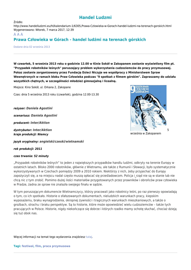 Handel Ludzmi Źródło: http://www.handelludzmi.eu/hl/kalendarium-1/6305,Prawa-Czlowieka-w-Gorach-handel-ludzmi-na-terenach-gorskich.html Wygenerowano: Wtorek, 7 marca 2017, 12:39 AAA Prawa Człowieka w Górach - handel ludźmi na terenach górskich Dodane dnia 02 września 2013 W czwartek, 5 września 2013 roku o godzinie 12.00 w Kinie Sokół w Zakopanem zostanie wyświetlony film pt. "Przypadek robotników leśnych" poruszający problem wykorzystania cudzoziemców do pracy przymusowej. Pokaz zostanie zorganizowany przez Fundację Dzieci Niczyje we współpracy z Ministerstwem Spraw Wewnętrznych w ramach bloku Praw Człowieka podczas "9 spotkań z filmem górskim". Zapraszamy do udziału wszystkich chętnych, w szczególności młodzież gimnazjalną i licealną. Miejsce: Kino Sokół, ul. Orkana 2, Zakopane Czas: dnia 5 września 2013 roku (czwartek), godzina 12.00-13.30 reżyser: Daniela Agostini scenariusz: Daniela Agostini producent: Inter/Aktion dystrybutor: Inter/Aktion kraje produkcji: Niemcy 5 września w Zakopanem język oryginalny: angielski/czeski/wietnamski rok produkcji: 2011 czas trwania: 52 minuty „Przypadek robotników leśnych” to jeden z największych przypadków handlu ludźmi, odkryty na terenie Europy w ostatnich latach. Blisko 2000 robotników, głównie z Wietnamu, ale także z Rumunii i Słowacji, było systematycznie wykorzystywanych w Czechach pomiędzy 2009 a 2010 rokiem. Niektórzy z nich, żeby przyjechać do Europy zapożyczyli się, a na miejscu nadal często muszą opłacać się prześladowcom. Policja i_rząd nie są w stanie lub nie chcą nic z tym zrobić. Pomimo dużej ilości materiałów przygotowanych przez prawników i obrońców praw człowieka w Pradze, żadna ze spraw nie znalazła swojego finału w sądzie. W tym poruszającym dokumencie Wietnamczycy, którzy pracowali jako robotnicy leśni, po raz pierwszy opowiadają o tym, co ich spotkało. Historie o sfałszowanych dokumentach, nieludzkich warunkach pracy, kiepskim wyposażeniu, braku wynagrodzenia, okropnej żywności i tragicznych warunkach mieszkaniowych, a także o groźbach, strachu i braku perspektyw. Są to historie, które może opowiedzieć wielu cudzoziemców – także tych pracujących w Polsce. Historie, nigdy niekończące się dobrze i których rzadko mamy ochotę słuchać, chociaż dzieją się tuż obok nas. Więcej informacji na temat tego wydarzenia znajdziesz tutaj. Tagi: festiwal, film, praca przymusowa podziel się treścią: wersja pdf drukuj
