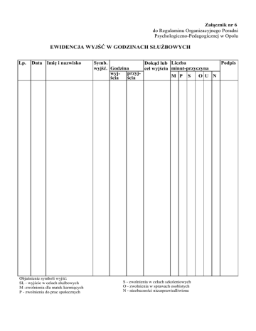 Załącznik nr 6 do Regulaminu Organizacyjnego Poradni Psychologiczno-Pedagogicznej w Opolu EWIDENCJA WYJŚĆ W GODZINACH SŁUŻBOWYCH Lp. Data Imię i nazwisko Objaśnienie symboli wyjść: SŁ - wyjście w celach służbowych M -zwolnienia dla matek karmiących P - zwolnienia do prac społecznych Symb. Podpis Dokąd lub Liczba wyjść. Godzina cel wyjścia minut-przyczyna wyj- przyjM P S O U N ścia ścia S - zwolnienia w celach szkoleniowych O - zwolnienia w sprawach osobistych N - nieobecności nieusprawiedliwione