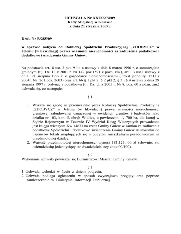 UCHWAŁA Nr XXIX/274/09 Rady Miejskiej w Gniewie z dnia 21 stycznia 2009r. Druk Nr B/285/09 w sprawie nabycia od Rolniczej Spółdzielni Produkcyjnej „ZDOBYCZ” w Jeleniu (w likwidacji) prawa własności nieruchomości za zadłuŜenia podatkowe i dodatkowe świadczenia Gminy Gniew. Na podstawie art.18 ust. 2 pkt. 9 lit. a ustawy z dnia 8 marca 1990 r. o samorządzie gminnym (t.j. Dz. U. z 2001 r. Nr 142 poz.1591 z późn. zm.), art. 13 ust.1 ustawy z dnia 21 sierpnia 1997 r. o gospodarce nieruchomościami ( tekst jednolity Dz.U z 2004r. Nr 261 poz. 2603) oraz art. 66 § 1 pkt 2. § 2 pkt 2, § 3 i § 4 ustawy z dnia 29 sierpnia 1997 r. ordynacja podatkowa (t.j. Dz. U. z 2005 r. Nr 8, poz. 60 z późn. zm.) uchwala się, co następuje: § 1. 1. WyraŜa się zgodę na przeniesienie przez Rolniczą Spółdzielnię Produkcyjną „ZDOBYCZ” w Jeleniu (w likwidacji) prawa własności nieruchomości gruntowej zabudowanej oznaczonej w ewidencji gruntów i budynków jako działka nr 103, k.m. 5, obręb Widlice, o powierzchni 1,1700 ha, dla której w Sądzie Rejonowym w Tczewie IV Wydział Ksiąg Wieczystych prowadzona jest księga wieczysta Kw 14673 na rzecz Gminy Gniew w zamian za zadłuŜenia podatkowe Spółdzielni i dodatkowe świadczenia Gminy Gniew w stosunku do najemców lokali znajdujących się w budynku mieszkalnym posadowionym na przedmiotowej działce. 2. Wartość przedmiotowej nieruchomości wynosi 181.123, 00 zł (słownie: sto osiemdziesiąt jeden tysięcy sto dwadzieścia trzy złote 00/100). § 2. Wykonanie uchwały powierza się Burmistrzowi Miasta i Gminy Gniew. § 3. 1. Uchwała wchodzi w Ŝycie z dniem podjęcia. 2. Uchwała podlega ogłoszeniu w sposób zwyczajowo przyjęty, oraz poprzez zamieszczenie w Biuletynie Informacji Publicznej. Uzasadnienie do Uchwały nr XXIX/274/09 Rady Miejskiej w Gniewie z dnia 21 stycznia 2009 r. Druk: Nr B/285/09 W związku z istniejącym zadłuŜeniem podatkowym Rolniczej Spółdzielni Produkcyjnej „ZDOBYCZ” w Jeleniu (w likwidacji) w stosunku do Gminy Gniew, oraz wdroŜonym procesem likwidacji Spółdzielni, Burmistrz Miasta i Gminy Gniew pismem z dnia 23.04.2008 r. zwrócił się do jej Likwidatora z propozycją przejęcia przez Gminę Gniew prawa własności nieruchomości gruntowej zabudowanej oznaczonej w ewidencji gruntów i budynków prowadzonej przez Starostwo Powiatowe w Tczewie jako działka nr 103, k.m. 5, obręb Widlice, o powierzchni 1,1700 ha, dla której w Sądzie Rejonowym w Tczewie IV Wydział Ksiąg Wieczystych prowadzona jest księga wieczysta Kw 14673. Likwidator Rolniczej Spółdzielni Produkcyjnej „ZDOBYCZ” w Jeleniu (w likwidacji) na Walnym Zgromadzeniu Spółdzielni w dniu 18 grudnia 2008 r. przedłoŜył członkom Spółdzielni przedmiotową propozycję. W wyniku przeprowadzonego głosowania Walne Zgromadzenie RSP „ZDOBYCZ” zdecydowało o wyraŜeniu zgody na przekazanie działki nr 103, k.m. 5, obręb Widlice Gminie Gniew na zaproponowanych przez Burmistrza warunkach. Wskazać naleŜy, Ŝe wartość nieruchomości mającej być przedmiotem przekazania na rzecz Gminy Gniew przewyŜsza zdecydowanie wysokość zobowiązań podatkowych Spółdzielni. Przejęcie prawa własności w/w nieruchomości wiąŜe się równieŜ obowiązek zapewnienia dotychczasowym najemcom lokali w budynku byłej szkoły wszelkich uprawnień wynikających z ustawy z dnia 21 czerwca 2001 r. o ochronie praw lokatorów, mieszkaniowym zasobie gminy i o zmianie Kodeksu cywilnego (t.j. Dz. U. z 2005 r. Nr 31, poz. 266 z późn. zm.) ZadłuŜenie podatkowe Spółdzielni wobec Gminy na dzień 14 stycznia 2009 r. wynosi 38.310,98 zł (słownie: trzydzieści osiem tysięcy trzysta dziesięć złotych 98/100) Opracował: Referat Gospodarki Nieruchomościami: Iwona Kriegel