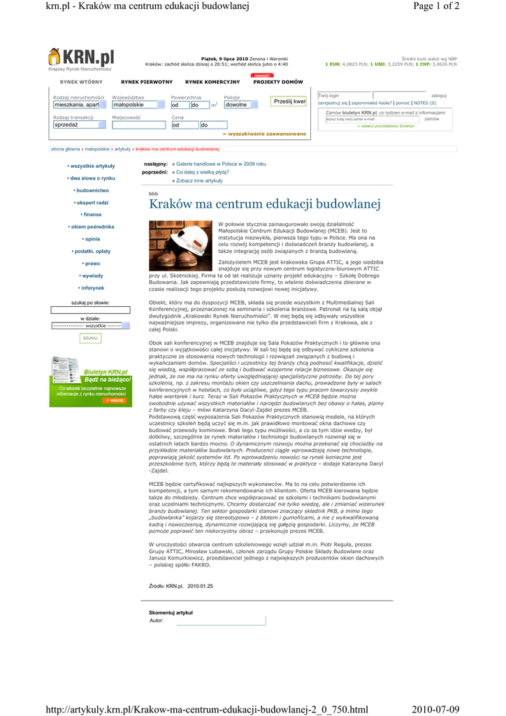 krn.pl - Kraków ma centrum edukacji budowlanej Page 1 of 2 Piątek, 9 lipca 2010 Zenona i Weroniki Kraków: zachód słońca dzisiaj o 20:51; wschód słońca jutro o 4:40 Średni kurs walut wg NBP 1 EUR: 4,0823 PLN; 1 USD: 3,2259 PLN; 1 CHF: 3,0626 PLN Krajowy Rynek Nieruchomości RYNEK WTÓRNY Rodzaj nieruchomości RYNEK PIERWOTNY Województwo Powierzchnia mieszkania, apartamenty małopolskie Rodzaj transakcji RYNEK KOMERCYJNY od Miejscowość PROJEKTY DOMÓW Pokoje do m 2 dowolne Twój login Prześlij kwere Zamów biuletyn KRN.pl, co tydzien e-mail z informacjami wpisz tutaj swój adres e-mail zamów Cena sprzedaŜ od zaloguj zarejestruj się | zapomniałeś hasła? | pomoc | NOTES (0) do » zobacz przykładowy biuletyn » wyszukiwanie zaawansowane strona główna » małopolskie » artykuły » kraków ma centrum edukacji budowlanej • wszystkie artykuły następny: » Galerie handlowe w Polsce w 2009 roku poprzedni: » Co dalej z wielką płytą? • dwa slowa o rynku • budownictwo • ekspert radzi » Zobacz inne artykuły bbb Kraków ma centrum edukacji budowlanej • finanse W połowie stycznia zainaugurowało swoją działalność Małopolskie Centrum Edukacji Budowlanej (MCEB). Jest to instytucja niezwykła, pierwsza tego typu w Polsce. Ma ona na celu rozwój kompetencji i doświadczeń branŜy budowlanej, a takŜe integrację osób związanych z branŜą budowlaną. • okiem pośrednika • opinie • podatki, opłaty • prawo • wywiady • inforynek szukaj po słowie: w dziale: ---------------- wszystkie -------------- ZałoŜycielem MCEB jest krakowska Grupa ATTIC, a jego siedziba znajduje się przy nowym centrum logistyczno-biurowym ATTIC przy ul. Skotnickiej. Firma ta od lat realizuje uznany projekt edukacyjny – Szkołę Dobrego Budowania. Jak zapewniają przedstawiciele firmy, to właśnie doświadczenia zbierane w czasie realizacji tego projektu posłuŜą rozwojowi nowej inicjatywy. Obiekt, który ma do dyspozycji MCEB, składa się przede wszystkim z Multimedialnej Sali Konferencyjnej, przeznaczonej na seminaria i szkolenia branŜowe. Patronat na tą salą objął dwutygodnik „Krakowski Rynek Nieruchomości”. W niej będą się odbywały wszystkie najwaŜniejsze imprezy, organizowane nie tylko dla przedstawicieli firm z Krakowa, ale z całej Polski. SZUKAJ Obok sali konferencyjnej w MCEB znajduje się Sala Pokazów Praktycznych i to głównie ona stanowi o wyjątkowości całej inicjatywy. W sali tej będę się odbywać cykliczne szkolenia praktyczne ze stosowania nowych technologii i rozwiązań związanych z budową i wykańczaniem domów. Specjaliści i uczestnicy tej branŜy chcą podnosić kwalifikacje, dzielić się wiedzą, współpracować ze sobą i budować wzajemne relacje biznesowe. Okazuje się jednak, Ŝe nie ma na rynku oferty uwzględniającej specjalistyczne potrzeby. Do tej pory szkolenia, np. z zakresu montaŜu okien czy uszczelniania dachu, prowadzone były w salach konferencyjnych w hotelach, co było uciąŜliwe, gdyŜ tego typu pracom towarzyszy zwykle hałas wiertarek i kurz. Teraz w Sali Pokazów Praktycznych w MCEB będzie moŜna swobodnie uŜywać wszystkich materiałów i narzędzi budowlanych bez obawy o hałas, plamy z farby czy kleju – mówi Katarzyna Dacyl-Zajdel prezes MCEB. Podstawową część wyposaŜenia Sali Pokazów Praktycznych stanowią modele, na których uczestnicy szkoleń będą uczyć się m.in. jak prawidłowo montować okna dachowe czy budować przewody kominowe. Brak tego typu moŜliwości, a co za tym idzie wiedzy, był dotkliwy, szczególnie Ŝe rynek materiałów i technologii budowlanych rozwinął się w ostatnich latach bardzo mocno. O dynamicznym rozwoju moŜna przekonać się chociaŜby na przykładzie materiałów budowlanych. Producenci ciągle wprowadzają nowe technologie, poprawiają jakość systemów itd. Po wprowadzeniu nowości na rynek konieczne jest przeszkolenie tych, którzy będą te materiały stosować w praktyce – dodaje Katarzyna Dacyl -Zajdel. MCEB będzie certyfikować najlepszych wykonawców. Ma to na celu potwierdzenie ich kompetencji, a tym samym rekomendowanie ich klientom. Oferta MCEB kierowana będzie takŜe do młodzieŜy. Centrum chce współpracować ze szkołami i technikami budowlanymi oraz uczelniami technicznymi. Chcemy dostarczać nie tylko wiedzę, ale i zmieniać wizerunek branŜy budowlanej. Ten sektor gospodarki stanowi znaczący składnik PKB, a mimo tego „budowlanka” kojarzy się stereotypowo – z błotem i gumofilcami, a nie z wykwalifikowaną kadrą i nowoczesnyą, dynamicznie rozwijającą się gałęzią gospodarki. Liczymy, Ŝe MCEB pomoŜe poprawić ten niekorzystny obraz – przekonuje prezes MCEB. W uroczystości otwarcia centrum szkoleniowego wzięli udział m.in. Piotr Reguła, prezes Grupy ATTIC, Mirosław Lubawski, członek zarządu Grupy Polskie Składy Budowlane oraz Janusz Komurkiewicz, przedstawiciel jednego z największych producentów okien dachowych – polskiej spółki FAKRO. Źródło: KRN.pl, 2010.01.25 Skomentuj artykuł Autor: http://artykuly.krn.pl/Krakow-ma-centrum-edukacji-budowlanej-2_0_750.html 2010-07-09 krn.pl - Kraków ma centrum edukacji budowlanej Page 2 of 2 Komentarz: Wyślij następny: » Galerie handlowe w Polsce w 2009 roku poprzedni: » Co dalej z wielką płytą? » Zobacz inne artykuły wersja do druku poleć znajomemu regulaminy | reklama | dla pośrednika | oferta | linki | polityka prywatności | serwisy partnerskie - polecamy | praca w KRN.pl | projekty domów mapa serwisu | mapa ofert | kontakt z KRN.pl Grupa KRN media © 2003-2010 krn.pl | KRN media Sp. z o.o. http://artykuly.krn.pl/Krakow-ma-centrum-edukacji-budowlanej-2_0_750.html 2010-07-09