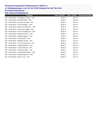 Hurtownia Kosmetyków Profesjonalnych "AURA"s.c. ul. Wołodyjowskiego 4, lok. U5, U6 15-287 Białystok tel. 085 746-01-86 [email protected] http://www.aura.bialystok.pl/ Produkty Cena (brutto) Cena (netto) OPI - Infinite Shine - The Beige of Reason - 15ml 69.00 zł 56.10 zł OPI - Infinite Shine - Non-Stop White - 15ml 69.00 zł 56.10 zł OPI - Infinite Shine - Eternaly Turquoise - 15ml 69.00 zł 56.10 zł OPI - Infinite Shine - Pearl Of Wisdom - 15ml 69.00 zł 56.10 zł OPI - Infinite Shine - Beyond The Pale Pink - 15ml 69.00 zł 56.10 zł OPI - Infinite Shine - Go to Grey Lengths - 15ml 69.00 zł 56.10 zł OPI - Infinite Shine - Enter The Golden Era - 15ml 69.00 zł 56.10 zł OPI - Infinite Shine - Bee Mine Forever - 15ml 69.00 zł 56.10 zł OPI - Infinite Shine - Sageless Beauty - 15ml 69.00 zł 56.10 zł OPI - Infinite Shine - Lavendurable - 15ml 69.00 zł 56.10 zł OPI - Infinite Shine - Wild Blue Yonder - 15ml 69.00 zł 56.10 zł OPI - Infinite Shine - The Sun Never Sets - 15ml 69.00 zł 56.10 zł OPI - Infinite Shine - Purpletual Motion - 15ml 69.00 zł 56.10 zł OPI - Infinite Shine - To Be Continued - 15ml 69.00 zł 56.10 zł OPI - Infinite Shine - Follow Your Bliss - 15ml 69.00 zł 56.10 zł OPI - Infinite Shine - Youre Blushing Again - 15ml 69.00 zł 56.10 zł OPI - Infinite Shine - Patience Pays Off - 15ml 69.00 zł 56.10 zł OPI - Infinite Shine - Silver On Ice - 15ml 69.00 zł 56.10 zł Cena promocyjna