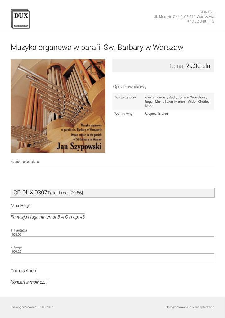 DUX S.J. Ul. Morskie Oko 2, 02-511 Warszawa +48 22 849 11 3 Muzyka organowa w parafii Św. Barbary w Warszaw Cena: 29,30 pln Opis słownikowy Kompozytorzy Aberg, Tomas ∎, Bach, Johann Sebastian ∎, Reger, Max ∎, Sawa, Marian ∎, Widor, Charles Marie ∎ Wykonawcy Szypowski, Jan ∎ Opis produktu CD DUX 0307Total time: [79:56] Max Reger Fantazja i fuga na temat B-A-C-H op. 46 1. Fantazja [08:09] 2. Fuga [09:22] Tomas Aberg Koncert a-moll: cz. I Plik wygenerowano: 07-03-2017 Oprogramowanie sklepu: AptusShop DUX S.J. Ul. Morskie Oko 2, 02-511 Warszawa +48 22 849 11 3 2. Fuga [09:22] Johann Sebastian Bach Koncert organowy C-dur BWV 594 (podstawa: Antonio Vivaldi - Concerto D-dur "Grosso Mogul" RV 208 3. cz. 1 bez oznaczenia tempa [07:50] 4. cz. 2 Recitativo. Adagio [03:28] 5. cz. 3 Allegro [09:16] Marian Sawa Hymnus in honorem Sancti Petri et Pauli per organo (1994) 6. Hymnus in honorem Sancti Apostoli Petri et Pauli [06:35] Charles Marie Widor V symfonia organowa f-moll op. 42 nr 1 7. Allegro vivace [11:10] 8. Allegro cantabile [07:07] 9. Andantino [06:48] 10. Adagio [04:37] Plik wygenerowano: 07-03-2017 Oprogramowanie sklepu: AptusShop DUX S.J. Ul. Morskie Oko 2, 02-511 Warszawa +48 22 849 11 3 11. Toccata. Allegro [06:33] Wykonawcy: Jan Szypowski /organy/ Plik wygenerowano: 07-03-2017 Powered by TCPDF (www.tcpdf.org) Oprogramowanie sklepu: AptusShop