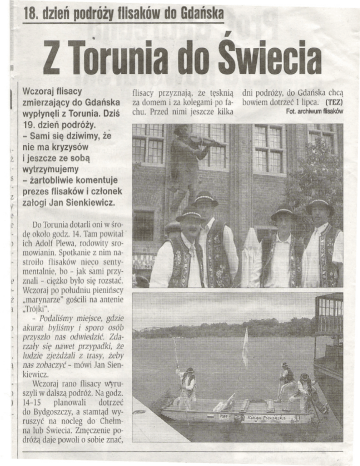 18. dzien-'podrózyflisakówdo Gdanska Im Z ToruniadoSwiecia I Wczoraj flisacy zmierzajacy do Gdanska wyplyneli z Torunia. Dzis 19. dzien podrózy. lZ - Sami sie dziwimy,ze nie ma kryzysów i jeszcze ze soba wytrzyfnujemy tS c- z y e ~ e Z l - zartobliwie flisacy przyznaja, ze tesknia dni podrózy, do Gdanska chca za domem i za kolegami-po fa- bowiem dotr,zec1 lipca. (TEZ) chu. Przed nimi jeszcze kilka Fot.archiwum flisaków komentuje prezes flisaków i czlonek zalogi Jan Sienkiewicz. ' Do Torunia dotarli oni w srode okolo godz. 14. Tam powital' ich Adolf Plewa, rodowity sromawianin. Spotkanie z nim nastroilo flisaków nieco sentymentalnie, bo - jak sami przyznali - ciezko bylo sie rozstac. Wczoraj po poludniu pieninscy "marynarze" goscili na antenie "Trójki" . - Podalismy miejsce, gdzie akurat bylismy i sporo osób przyszlo nas odwiedzic. Zdarzaly sie nawet przypadki, ze ludzie zjezdzali z trasy, zeby nas zobaczyc - mówi Jan Sienkiewicz. Wczoraj rano flisacy wyruszyli w dalsza podróz. Na godz. 14-15 planowali dotrzec do Bydgoszczy, a stamtad wyruszyc na nocleg do' Chelmna lub Swiecia. Zmeczenie podróza daje powoli o sobie znac,