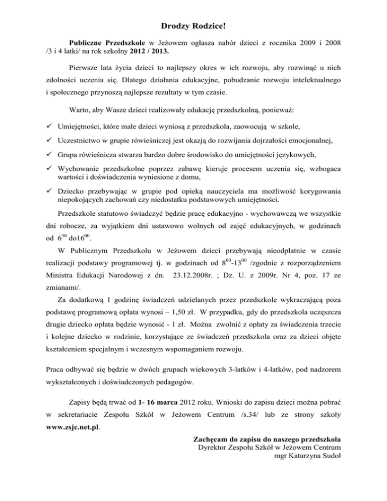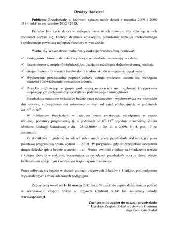 Drodzy Rodzice! Publiczne Przedszkole w Jeżowem ogłasza nabór dzieci z rocznika 2009 i 2008 /3 i 4 latki/ na rok szkolny 2012 / 2013. Pierwsze lata życia dzieci to najlepszy okres w ich rozwoju, aby rozwinąć u nich zdolności uczenia się. Dlatego działania edukacyjne, pobudzanie rozwoju intelektualnego i społecznego przynoszą najlepsze rezultaty w tym czasie. Warto, aby Wasze dzieci realizowały edukację przedszkolną, ponieważ: Umiejętności, które małe dzieci wyniosą z przedszkola, zaowocują w szkole, Uczestnictwo w grupie rówieśniczej jest okazją do rozwijania dojrzałości emocjonalnej, Grupa rówieśnicza stwarza bardzo dobre środowisko do umiejętności językowych, Wychowanie przedszkolne poprzez zabawę kieruje procesem uczenia się, wzbogaca wartości i doświadczenia wyniesione z domu, Dziecko przebywając w grupie pod opieką nauczyciela ma możliwość korygowania niepokojących zachowań czy niedostatku podstawowych umiejętności. Przedszkole statutowo świadczyć będzie pracę edukacyjno - wychowawczą we wszystkie dni robocze, za wyjątkiem dni ustawowo wolnych od zajęć edukacyjnych, w godzinach od 630 do1600. W Publicznym Przedszkolu w Jeżowem dzieci przebywają nieodpłatnie w czasie realizacji podstawy programowej tj. w godzinach od 800-1300 /zgodnie z rozporządzeniem Ministra Edukacji Narodowej z dn. 23.12.2008r. ; Dz. U. z 2009r. Nr 4, poz. 17 ze zmianami/. Za dodatkową 1 godzinę świadczeń udzielanych przez przedszkole wykraczającą poza podstawę programową opłata wynosi – 1,50 zł. W przypadku, gdy do przedszkola uczęszcza drugie dziecko opłata będzie wynosić - 1 zł. Można zwolnić z opłaty za świadczenia trzecie i kolejne dziecko w rodzinie, korzystające ze świadczeń przedszkola oraz za dzieci objęte kształceniem specjalnym i wczesnym wspomaganiem rozwoju. Praca odbywać się będzie w dwóch grupach wiekowych 3-latków i 4-latków, pod nadzorem wykształconych i doświadczonych pedagogów. Zapisy będą trwać od 1- 16 marca 2012 roku. Wnioski do zapisu dzieci można pobrać w sekretariacie Zespołu Szkół w Jeżowem Centrum /s.34/ lub ze strony szkoły www.zsjc.net.pl. Zachęcam do zapisu do naszego przedszkola Dyrektor Zespołu Szkół w Jeżowem Centrum mgr Katarzyna Sudoł
