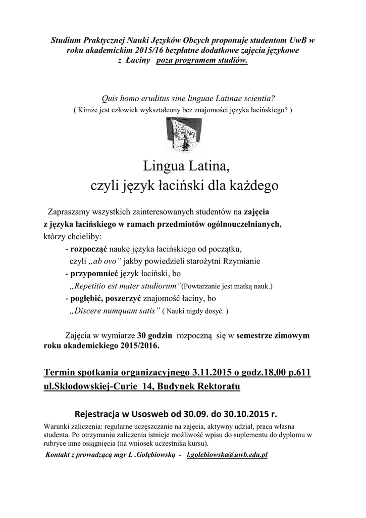 Studium Praktycznej Nauki Języków Obcych proponuje studentom UwB w roku akademickim 2015/16 bezpłatne dodatkowe zajęcia językowe z Łaciny poza programem studiów. Quis homo eruditus sine linguae Latinae scientia? ( Kimże jest człowiek wykształcony bez znajomości języka łacińskiego? ) Lingua Latina, czyli język łaciński dla każdego Zapraszamy wszystkich zainteresowanych studentów na zajęcia z języka łacińskiego w ramach przedmiotów ogólnouczelnianych, którzy chcieliby: - rozpocząć naukę języka łacińskiego od początku, czyli „ab ovo” jakby powiedzieli starożytni Rzymianie - przypomnieć język łaciński, bo „Repetitio est mater studiorum”(Powtarzanie jest matką nauk.) - pogłębić, poszerzyć znajomość łaciny, bo „Discere numquam satis” ( Nauki nigdy dosyć. ) Zajęcia w wymiarze 30 godzin rozpoczną się w semestrze zimowym roku akademickiego 2015/2016. Termin spotkania organizacyjnego 3.11.2015 o godz.18,00 p.611 ul.Skłodowskiej-Curie 14, Budynek Rektoratu Rejestracja w Usosweb od 30.09. do 30.10.2015 r. Warunki zaliczenia: regularne uczęszczanie na zajęcia, aktywny udział, praca własna studenta. Po otrzymaniu zaliczenia istnieje możliwość wpisu do suplementu do dyplomu w rubryce inne osiągnięcia (na wniosek uczestnika kursu). Kontakt z prowadzącą mgr L .Gołębiowską - [email protected]