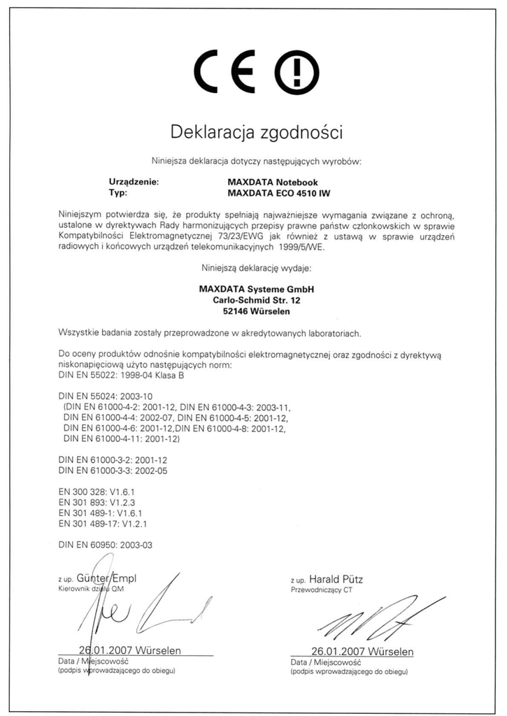 c (o Deklaracja zgodnosci Nrniejsza deklaracia dotyczynastepujQcych wyroböwi Urzqd26nie: Typi MAXDATANot6book MAXDATAECO4510IW potwierdza Niniejszym srq,ze produktyspelnialQ najwainieisze wymagania zwiEzane z ochronQ, ustalonew dyrektywachRadyharmonizulQcych przepisyprawnepaistw czlonkowskich w sprawie Kompatybilno6ci Elektromagnetycznej 73123/EWGJak r6wnte2z ustawQw sprawie urzQdzeri radiowychi ko6cowychurzQdzeitelekomunikacylnych 1999/5,/WE. NiniejszA deklaracjq wydaje: MAXDATASystomocmbH Carlo-SchmidStr. 12 52146Würselen przeprowadzone Wszystkie badania zostaly w akredytowanych laboratoriach. Do ocenyproduktdwodnosniekompatybilno6ci eLektromagnetycznej orazzgodnoacz dyrektywq niskonapieciowE u2ytonastQpulQcych norm: DINEN55022:1998-04 KlasaB DINEN55024:2003-10 (DlNEN61000-4-2: 2001-12. D N EN61000-4,3: 2003-11, DINEN61000-4-4:2002-07, DINEN61000-4-512001-12, DINEN61000-4-6:2001'12.DlN EN610004,8: 200112, DINEN61000-4-1 1: 2001-12) DINEN61000-3-2: 2001-1 2 DINEN61000-3-3: 2002-05 EN300328:Vl 6.1 E N3 0 18 9 3 V : 1.2.3 E N3 0 14 8 9 - 1 : V l . 6 . 1 E N3 0 14 8 9 - 1 7 : V 1 . 2 . 1 DINEN60950:2003-03 ',p Gü mpl ' up.HaraldPütz 4/z' 26.0'1.2007 Würselen Data/ Miejscowosö wprowädzaj4ce90 lpodp,s doob,esu)