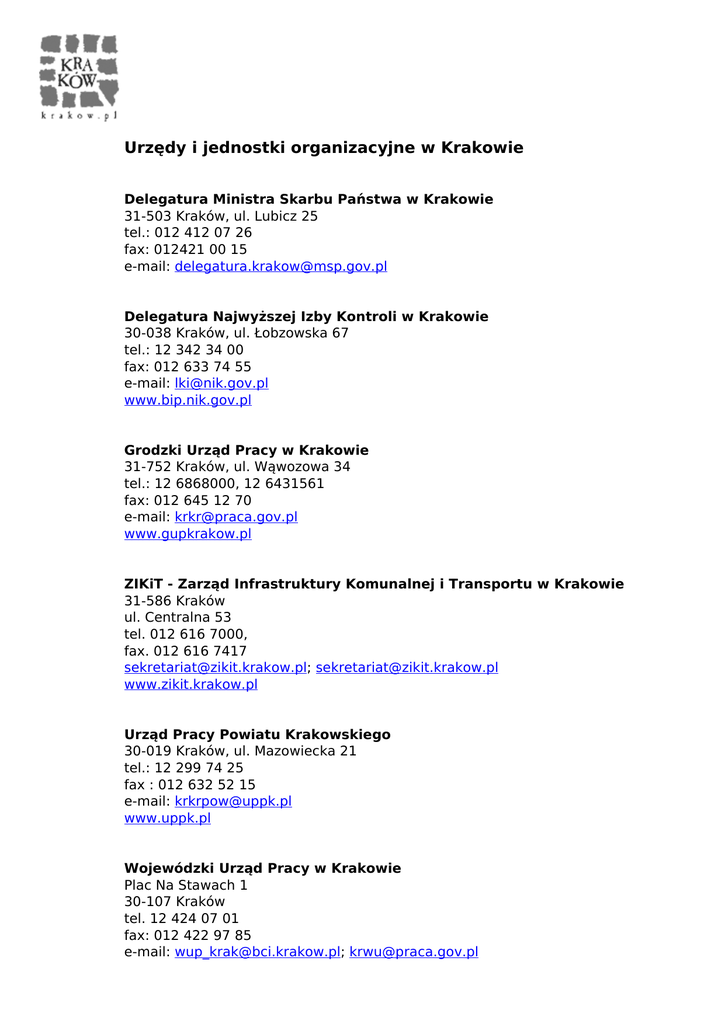 Urzędy i jednostki organizacyjne w Krakowie Delegatura Ministra Skarbu Państwa w Krakowie 31-503 Kraków, ul. Lubicz 25 tel.: 012 412 07 26 fax: 012421 00 15 e-mail: [email protected] Delegatura Najwyższej Izby Kontroli w Krakowie 30-038 Kraków, ul. Łobzowska 67 tel.: 12 342 34 00 fax: 012 633 74 55 e-mail: [email protected] www.bip.nik.gov.pl Grodzki Urząd Pracy w Krakowie 31-752 Kraków, ul. Wąwozowa 34 tel.: 12 6868000, 12 6431561 fax: 012 645 12 70 e-mail: [email protected] www.gupkrakow.pl ZIKiT - Zarząd Infrastruktury Komunalnej i Transportu w Krakowie 31-586 Kraków ul. Centralna 53 tel. 012 616 7000, fax. 012 616 7417 [email protected]; [email protected] www.zikit.krakow.pl Urząd Pracy Powiatu Krakowskiego 30-019 Kraków, ul. Mazowiecka 21 tel.: 12 299 74 25 fax : 012 632 52 15 e-mail: [email protected] www.uppk.pl Wojewódzki Urząd Pracy w Krakowie Plac Na Stawach 1 30-107 Kraków tel. 12 424 07 01 fax: 012 422 97 85 e-mail: [email protected]; [email protected] www.wup-krakow.pl Małopolski Urząd Wojewódzki w Krakowie 31-156 Kraków, ul. Basztowa 22 tel.: 012 392 12 00 fax: 012 422 72 08 e-mail: [email protected]; [email protected] www.malopolska.uw.gov.pl , www.krakow.uw.gov.pl Starostwo Powiatowe w Krakowie 30-037 Kraków, Al. Słowackiego 20 tel.: 012 634-42-66 lub 012 634-42-70 fax: 012 633 52 94 e-mail: [email protected] www.powiat.krakow.pl Urząd Marszałkowski Województwa Małopolskiego ul. Racławicka 56 30-017 Kraków tel.: 12 63-03-544, 63-03-169, 63-03-507, 63-03-514 fax: 012 630 31 26 e-mail: [email protected] www.malopolskie.pl Urząd Miasta Krakowa 31-004 Kraków, Pl. Wszystkich Świętych 3-4 tel.: 012 616 12 00 fax: 012 422 81 72 www.krakow.pl www.bip.krakow.pl Komenda Powiatowa Policji w Krakowie ul. Kolejowa 11 32-080 Zabierzów tel.: 12 61 57 00, 12 61 57 115 fax: 012 615 72 27 www.kpp-krakow.policja.gov.pl Komenda Miejska Policji w Krakowie 31-137 Kraków, ul. Siemiradzkiego 24 tel.: 012 615 26 00 fax: 012 615 26 07 e-mail: [email protected] www.krakow.policja.gov.pl Komenda Miejska Państwowej Straży Pożarnej w Krakowie 31-033 Kraków, ul. Westerplatte 19 tel.: 012 616-83-00 fax: 012 422 88 33 e-mail: [email protected] www.psp.krakow.pl Komenda Wojewódzka Państwowej Straży Pożarnej w Krakowie 30-134 Kraków, ul. Zarzecze 106 tel.: 12 63 99 100 fax: 012 639 92 05 e-mail: [email protected] www.straz.krakow.pl Małopolski Zarząd Melioracji i Urządzeń Wodnych 31-153 Kraków, ul. Szlak 73 tel.: 12 618 80 00, 12 618 80 11 fax: 012 618 80 10 e-mail: [email protected] www.mzmiuw.krakow.pl Izba Celna w Krakowie 31-111 Kraków, al. Krasińskiego 11b tel.: 801 055 055, 22 330 03 30 fax: 012 421 67 57 e-mail: [email protected] http://www.krakow.ic.gov.pl/ Izba Celna. Oddział Port Lotniczy Kraków 32-083 Kraków, ul. Kapitana Medweckiego 1 tel.: 12 639 32 36 fax: (12) 28 55 052 e-mail: [email protected] http://www.krakow.ic.gov.pl/ Izba Celna. Oddział Celny I w Krakowie 31-223 Kraków, ul. Pachońskiego 3 tel.: 12 681 41 01- Referat Dozoru, 12 681 41 02 Kierownik Referatu fax: 012 68 14 189 e-mail: [email protected] www.krakow.uc.gov.pl Izba Celna. Oddział Celny II w Krakowie 30-741 Kraków, ul. Nad Drwiną 16 tel.: 012 627 60 67 fax: 012 627 60 66 e-mail: [email protected] www.krakow.ic.gov.pl Urząd Celny w Krakowie 30-741 Kraków, ul. Nad Drwiną 16 tel.: 012 627 60 67 fax: 012 627 60 66 e-mail: [email protected] www.krakow.ic.gov.pl Izba Skarbowa w Krakowie 31-007 Kraków, ul. Wiślna 7 tel.: 012 25 57 300, 12-25-57-303 fax: 12-42-24-386 ul. Wadowicka 10, 31-415 Kraków tel.: 12-25-47-000, 12-25-47-707 fax: 12-25-47-757 e-mail: [email protected] www.iskrakow.krak.pl Małopolski Urząd Skarbowy 31-621 Kraków, os. Bohaterów Września 80 tel.: 012 681 70 00 fax: 012 647 70 56 e-mail: [email protected] www.mus.krakow.pl Pierwszy Urząd Skarbowy Kraków 30-363 Kraków, ul. Rzemieślnicza 20 tel.: 12 38 46 000, 12 38 46 317 fax: 12 3846300 e-mail: [email protected] http://bip.malopolska.pl/us1krakow/Article/get/id,395103.html Drugi Urząd Skarbowy Kraków 31-272 Kraków, ul. Krowoderskich Zuchów 2 tel.: 12 66-56-417 fax: 012 631 54 50 e-mail: [email protected] http://bip.malopolska.pl/us2krakow/Article/get/id,394623.html Urząd Skarbowy Kraków-Dębniki 30-403 Kraków, ul. Rzemieślnicza 5 tel.: 012 269 02 66 fax: 012 269 02 90 Urząd Skarbowy Kraków-Krowodrza 31-272 Kraków, ul. Krowoderskich Zuchów 2 tel.: 012 665 60 00 fax: 12 665 61 36 e-mail: [email protected] http://bip.malopolska.pl/uskrakowkrowodrza/Article/get/id,835780.html Urząd Skarbowy Kraków-Nowa Huta 31-621 Kraków, Os. Bohaterów Września 80 tel.: 012 681 70 00 fax: 012 647 92 22 e-mail: [email protected] http://bip.malopolska.pl/uskrakownowahuta/Article/get/id,397002.html Urząd Skarbowy Kraków-Podgórze 30-415 Kraków, ul. Wadowicka 10 tel.: 012 254 70 00, 12-254-71-31, 12-254-71-30 fax: 012 267 40 91 e-mail: [email protected] http://bip.malopolska.pl/uskrakowpodgorze/Article/get/id,397261.html Urząd Skarbowy Kraków-Prądnik 31-272 Kraków, ul. Krowoderskich Zuchów 2 tel.: 012 665 60 00, 12 665 67 27 fax: 12 665 67 51 e-mail: [email protected] http://bip.malopolska.pl/uskrakowpradnik/Article/get/id,397408.html Urząd Skarbowy Kraków-Śródmieście 31-272 Kraków, ul. Krowoderskich Zuchów 2 tel.: 012 634 36 76 fax: 012 634 34 24 e-mail: [email protected] http://bip.malopolska.pl/uskrakowsrodmiescie/Article/index/id,128967.html Urząd Skarbowy Kraków-Stare Miasto 31-001 Kraków, ul. Grodzka 65 tel.: 012 29 38 100, 012 29 38 200 fax: 012 293 82 66 http://www.usstaremiasto.krakow.pl/ Urząd Kontroli Skarbowej w Krakowie 30-016 Kraków, ul. W. Łokietka 20 tel.: 012 299 21 00, 299 22 04 fax: 012 299 22 00 e-mail: [email protected] www.uks.krakow.pl Oddział Zakładu Ubezpieczeń Społecznych w Krakowie 31-080 Kraków, ul. Pędzichów 27 tel.: (22) 560 16 00 fax: 012 634 57 19 e-mail: [email protected] www.zus.pl Inspektorat ZUS w Krakowie-Krowodrza 30-015 Kraków, ul. 