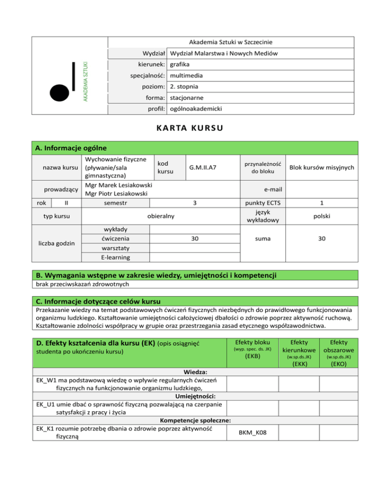 Akademia Sztuki w Szczecinie Wydział Wydział Malarstwa i Nowych Mediów kierunek: grafika specjalność: multimedia poziom: 2. stopnia forma: stacjonarne profil: ogólnoakademicki K A RTA KU R S U A. Informacje ogólne Wychowanie fizyczne kod nazwa kursu (pływanie/sala kursu gimnastyczna) Mgr Marek Lesiakowski prowadzący Mgr Piotr Lesiakowski rok II semestr typ kursu liczba godzin G.M.II.A7 Blok kursów misyjnych e-mail 3 obieralny wykłady ćwiczenia warsztaty E-learning przynależność do bloku 30 punkty ECTS język wykładowy 1 polski suma 30 B. Wymagania wstępne w zakresie wiedzy, umiejętności i kompetencji brak przeciwskazań zdrowotnych C. Informacje dotyczące celów kursu Przekazanie wiedzy na temat podstawowych ćwiczeń fizycznych niezbędnych do prawidłowego funkcjonowania organizmu ludzkiego. Kształtowanie umiejętności całożyciowej dbałości o zdrowie poprzez aktywność ruchową. Kształtowanie zdolności współpracy w grupie oraz przestrzegania zasad etycznego współzawodnictwa. D. Efekty kształcenia dla kursu (EK) (opis osiągnięć studenta po ukończeniu kursu) Wiedza: EK_W1 ma podstawową wiedzę o wpływie regularnych ćwiczeń fizycznych na funkcjonowanie organizmu ludzkiego, Umiejętności: EK_U1 umie dbać o sprawność fizyczną pozwalającą na czerpanie satysfakcji z pracy i życia Kompetencje społeczne: EK_K1 rozumie potrzebę dbania o zdrowie poprzez aktywność fizyczną Efekty bloku (wyp. spec. ds. JK) (EKB) BKM_K08 Efekty kierunkowe Efekty obszarowe (w.sp.ds.JK) (w.sp.ds.JK) (EKK) (EKO) E. Treści programowe typ wykład temat ilość godz. ćwiczenia temat typ Student ma do wyboru: pływalnię, fitness lub siłownię Ćw. 1 Nauka podstawowych elementów przeprowadzanych ćwiczeń, Ćw. 2 Podstawowe elementy fitness, aerobiku, teoria treningu fitness, doskonalenie sprawności ruchowej poprzez regularne ćwiczenia wzmacniające poszczególne partie ciała, ćwiczenia kształtujące wytrzymałość i siłę, ćwiczenia rozciągające, ćwiczenia relaksujące. Zajęcia przy muzyce. Ćw. 3 Siłownia - teoria treningu siłowego, doskonalenie siły i wytrzymałości ruchowej poprzez regularne ćwiczenia wzmacniające poszczególna partie mięśniowe z pomocą maszyn ćwiczebnych, nauka obsługi poszczególnych maszyn, zaznajomienie z zasadami BHP obowiązującymi na siłowni czy pływalni, nauka doboru ćwiczeń do własnych oczekiwań i możliwości, trening obwodowy i ogólnorozwojowy, trening nakierowany na poszczególne partie mięśniowe np. mięśnie ramion, mięśnie klatki piersiowej, mięśnie kończyn dolnych lub mięśnie brzucha. E-learning Ćwa Ćwa Ćwa warsztaty typ ilość godz. ilość godz. 30 ilość godz. typ Uwagi: F1. Literatura obowiązkowa F2. Literatura uzupełniająca G. Dopasowanie form kształcenia do efektów kształcenia/metody kształcenia wykład konwencjonalny wykład konwersatoryjny wykład monograficzny/problemowy ćwiczenia audytoryjne ćwiczenia klauzurowe ćwiczenia projektowe ćwiczenia laboratoryjne ćwiczenia studyjne ćwiczenia terenowe lektorat konwersatorium seminarium warsztaty E-learning Efekty kształcenia dla kursu EK_W01 Wk Wk Wd Wp Ćwa Ćwk Ćwp Ćwl Ćws Ćwt L K S Wa El Wd Wp Ćwa Ćwk Ćwp x Ćwl Ćws Ćwt L K S Wa El EK_U01 x EK_K01 x H. Dopasowanie metod oceniania do efektów kształcenia egzamin ustny standaryzowany egzamin ustny niestandaryzowany egzamin pisemny standaryzowany egzamin pisemny niestandaryzowany egzamin pisemny "z otwartą książką" egzamin pisemny test otwarty egzamin pisemny test zamknięty egzamin praktyczny kolokwium ustne kolokwium pisemne sprawdzian ustny sprawdzian pisemny klauzura konsultacje przegląd/przesłuchanie cząstkowe/robocze przegląd/przesłuchanie semestralne przegląd/przesłuchanie końcowo-roczne ocena ciągła ocena formatywna ocena sumatywna Eus Euns Eps Epns Epok Epto Eptz Epr Ku Kp Su Sp Kl Ko Pc Ps Pk Oc Of Os Efekty Oc Of Os kształcenia Eus Euns Eps Epns Epok Epto Eptz Epr Ku Kp Su Sp dla kursu EK_W01 x EK_U01 x EK_K01 x Ps Pk Kl Ko Pc I. Forma i warunki zaliczenia kursu Warunki zaliczenia Aktywne uczestnictwo w zajęciach Inne: ocena ocena ocena celująca bardzo dobry plus dobry (19-20) (25) (21-24) Warunki egzaminu ocena dobry (16-18) ocena dostateczny plus (14-15) ocena dostateczny (11-13) ocena niedostateczny (10) J. Nakład pracy studenta Forma aktywności godziny kontaktowe z nauczycielem przygotowanie do zajęć średnia liczba godzin 30 opracowanie materiału po zajęciach konsultacje/ egzamin/sprawdzian/przegląd/przesłuchanie przygotowanie do egzaminu/przeglądu/przesłuchania suma godzin 30 liczba punktów ECTS 1 .................................................................... ............................................................ Podpis Autora treści Kursu ........................................................... Podpis Osób odpowiedzialnych dydaktycznie ........................................................................ Podpis Przewodniczącego Rady Programowej .................................................... Data sporządzenia karty kursu