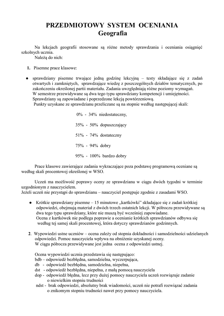 PRZEDMIOTOWY SYSTEM OCENIANIA Geografia Na lekcjach geografii stosowane są różne metody sprawdzania i oceniania osiągnięć szkolnych ucznia. Należą do nich: 1. Pisemne prace klasowe: sprawdziany pisemne trwające jedną godzinę lekcyjną – testy składające się z zadań otwartych i zamkniętych, sprawdzające wiedzę z poszczególnych działów tematycznych, po zakończeniu określonej partii materiału. Zadania uwzględniają różne poziomy wymagań. W semestrze przewidywane są dwa tego typu sprawdziany kompetencji i umiejętności. Sprawdziany są zapowiadane i poprzedzone lekcją powtórzeniową. Punkty uzyskane ze sprawdzianu przeliczane są na stopnie według następującej skali: 0% - 34% niedostateczny, 35% - 50% dopuszczający 51% - 74% dostateczny 75% - 94% dobry 95% - 100% bardzo dobry Prace klasowe zawierające zadania wykraczające poza podstawę programową oceniane są według skali procentowej określonej w WSO. Uczeń ma możliwość poprawy oceny ze sprawdzianu w ciągu dwóch tygodni w terminie uzgodnionym z nauczycielem. Jeżeli uczeń nie przystąpi do sprawdzianu – nauczyciel postępuje zgodnie z zasadami WSO. Krótkie sprawdziany pisemne – 15 minutowe „kartkówki” składające się z zadań krótkiej odpowiedzi, obejmują materiał z dwóch trzech ostatnich lekcji. W półroczu przewidywane są dwa tego typu sprawdziany, które nie muszą być wcześniej zapowiadane. Ocena z kartkówek nie podlega poprawie a ocenianie krótkich sprawdzianów odbywa się według tej samej skali procentowej, która dotyczy sprawdzianów godzinnych. 2. Wypowiedzi ustne uczniów – ocena zależy od stopnia dokładności i samodzielności udzielanych odpowiedzi. Pomoc nauczyciela wpływa na obniżenie uzyskanej oceny. W ciągu półrocza przewidywane jest jedna ocena z odpowiedzi ustnej. Ocena wypowiedzi ucznia przedstawia się następująco: bdb – odpowiedź bezbłędna, samodzielna, wyczerpująca, db - odpowiedź bezbłędna, samodzielna, niepełna, dst - odpowiedź bezbłędna, niepełna, z małą pomocą nauczyciela dop - odpowiedź błędna, lecz przy dużej pomocy nauczyciela uczeń rozwiązuje zadanie o niewielkim stopniu trudności ndst - brak odpowiedzi, absolutny brak wiadomości, uczeń nie potrafi rozwiązać zadania o znikomym stopniu trudności nawet przy pomocy nauczyciela. 3. Kontrola prac domowych – prawidłowość i estetyka wykonania zadań w zeszycie ćwiczeń ucznia. W ciągu jednego półrocza uczeń może raz – klasa 2, dwa razy klasa 3, usprawiedliwić brak pracy pisemnej i nieprzygotowanie do lekcji. 4. Obserwacja pracy ucznia na lekcji – aktywność, zaangażowanie, praca w zespole. W zależności od stopnia zaangażowania i trudności realizowanych zadań, uczeń może uzyskać ocenę w formie (+) lub (-), trzy plusy to ocena bardzo dobra a cztery minusy to ocena niedostateczna. Uczeń, który podpowiada gdy inna osoba jest pytana otrzymuje minus. Praca w grupach – na ocenę ma wpływ umiejętność współpracy, komunikacji, tempo pracy i wkład pracy. 5. Dodatkowa aktywność i zaangażowanie ucznia w ramach realizowanego przedmiotu. dodatkowe prace dla uczniów szczególnie zainteresowanych przedmiotem lub daną tematyką - różnego typu prace pisemne z wykorzystaniem zróżnicowanych źródeł informacji, osiągnięcia w grach dydaktycznych oraz w szkolnych i pozaszkolnych konkursach o tematyce geograficznej, albumy, plansze, plakaty, prace – projekty ocenianie samodzielności, kreatywności i umiejętności korzystania z różnych źródeł informacji, praktyczne zastosowanie zdobytych wiadomości i umiejętności Dla prawidłowego procesu oceniania sformułowane zostały kryteria oceniania czyli określone wymagania na poszczególne oceny według treści Podstawy programowej zawartych w programie nauczania geografii – orientacja na mapie – ściennej – konturowej, na mapie w atlasie oraz na globusie. Podczas wystawiania oceny końcowej śródrocznej i rocznej brane będzie pod uwagę zaangażowanie ucznia w przyswajanie wiedzy i nabywanie umiejętności, a także systematyczna praca i dodatkowo ocena za I półrocze przy ocenie rocznej. W ciągu jednego półrocza uczeń powinien mieć przynajmniej 3 oceny cząstkowe klasa i 4 oceny cząstkowe klasa 3..