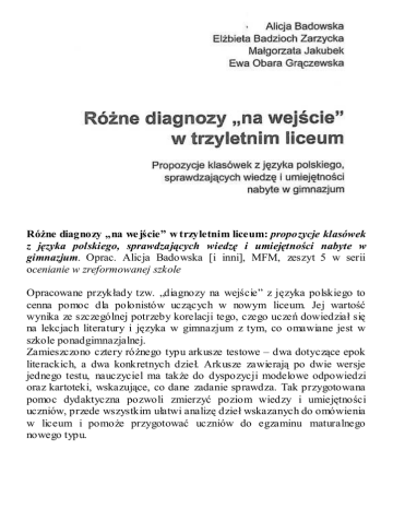 RóŜne diagnozy „na we jście” w trzyletnim liceum: propozycje klasówek z języka polskiego, sprawdzających wiedzę i umiejętności nabyte w gimnazjum. Oprac. Alicja Badowska [i inni], MFM, zeszyt 5 w serii ocenianie w zreformowanej szkole Opracowane przykłady tzw. „diagnozy na wejście” z języka polskiego to cenna pomoc dla polonistów uczących w nowym liceum. Jej wartość wynika ze szczególnej potrzeby korelacji tego, czego uczeń dowiedział się na lekcjach literatury i języka w gimnazjum z tym, co omawiane jest w szkole ponadgimnazjalnej. Zamieszczono cztery róŜnego typu arkusze testowe – dwa dotyczące epok literackich, a dwa konkretnych dzieł. Arkusze zawierają po dwie wersje jednego testu, nauczyciel ma takŜe do dyspozycji modelowe odpowiedzi oraz kartoteki, wskazujące, co dane zadanie sprawdza. Tak przygotowana pomoc dydaktyczna pozwoli zmierzyć poziom wiedzy i umiejętności uczniów, przede wszystkim ułatwi analizę dzieł wskazanych do omówienia w liceum i pomoŜe przygotować uczniów do egzaminu maturalnego nowego typu.