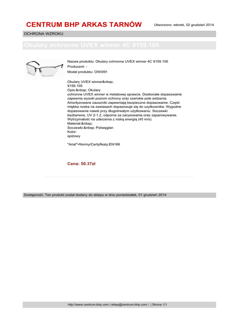 CENTRUM BHP ARKAS TARNÓW Utworzono: wtorek, 02 grudzień 2014 OCHRONA WZROKU Okulary ochronne UVEX winner 4C 9159.105 Nazwa produktu: Okulary ochronne UVEX winner 4C 9159.105 Producent: Model produktu: OW/091 Okulary UVEX winner 9159.105 Opis: Okulary ochronne UVEX winner w metalowej oprawce. Doskonałe dopasowanie zapewnia wysoki poziom ochrony oraz szerokie pole widzenia. Amortyzowane zauszniki zapewniają bezpieczne dopasowanie. Część miękka noska na zawiasach dopasowuje się do uzytkownika. Wygodne dopasowanie nawet przy długotrwałym użytkowaniu. Soczewki bezbarwne, UV 2-1.2, odporne za zarysowania oraz zaparowywanie. Wytrzymałość na uderzenia z niską energią (45 m/s). Materiał: Soczewki: Poliwęglan Kolor: spiżowy "Arial">Normy/Certyfikaty:EN166 Cena: 50.37zł Dostępność: Ten produkt został dodany do sklepu w dniu poniedziałek, 01 grudzień 2014 http://www.centrum-bhp.com | [email protected] | | Strona 1/1