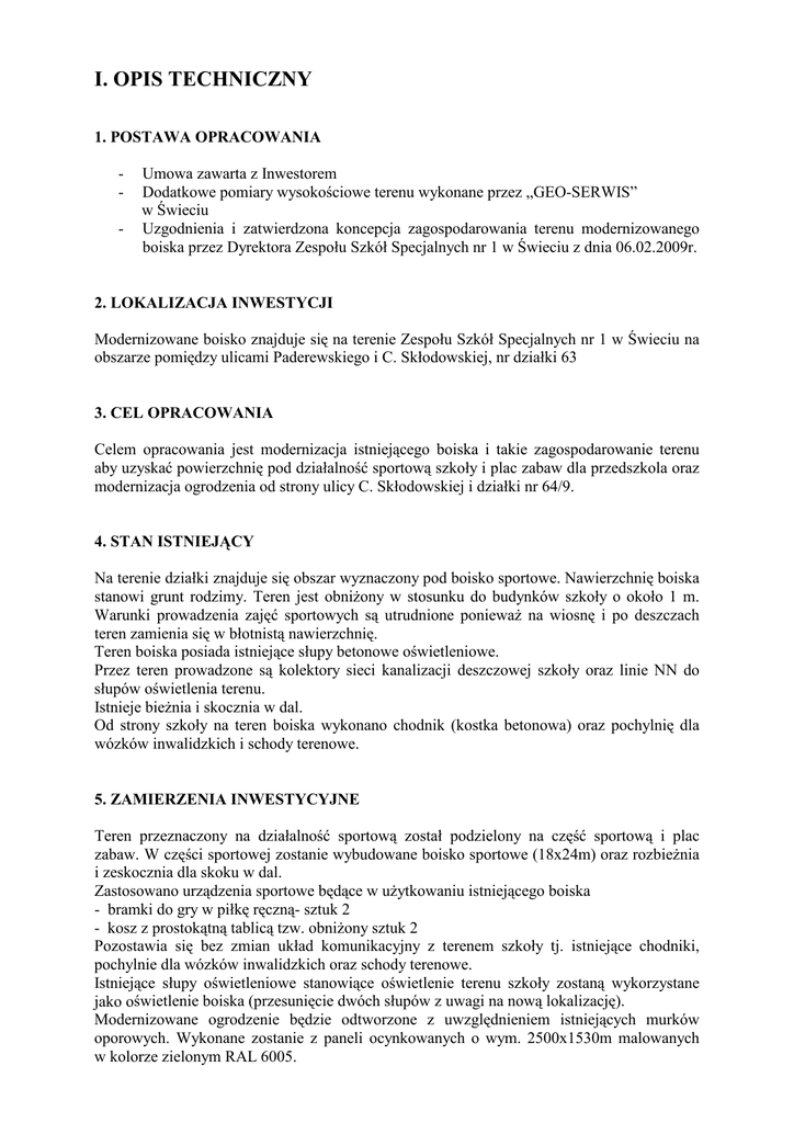 I. OPIS TECHNICZNY 1. POSTAWA OPRACOWANIA - Umowa zawarta z Inwestorem Dodatkowe pomiary wysokościowe terenu wykonane przez „GEO-SERWIS” w Świeciu Uzgodnienia i zatwierdzona koncepcja zagospodarowania terenu modernizowanego boiska przez Dyrektora Zespołu Szkół Specjalnych nr 1 w Świeciu z dnia 06.02.2009r. 2. LOKALIZACJA INWESTYCJI Modernizowane boisko znajduje się na terenie Zespołu Szkół Specjalnych nr 1 w Świeciu na obszarze pomiędzy ulicami Paderewskiego i C. Skłodowskiej, nr działki 63 3. CEL OPRACOWANIA Celem opracowania jest modernizacja istniejącego boiska i takie zagospodarowanie terenu aby uzyskać powierzchnię pod działalność sportową szkoły i plac zabaw dla przedszkola oraz modernizacja ogrodzenia od strony ulicy C. Skłodowskiej i działki nr 64/9. 4. STAN ISTNIEJĄCY Na terenie działki znajduje się obszar wyznaczony pod boisko sportowe. Nawierzchnię boiska stanowi grunt rodzimy. Teren jest obniŜony w stosunku do budynków szkoły o około 1 m. Warunki prowadzenia zajęć sportowych są utrudnione poniewaŜ na wiosnę i po deszczach teren zamienia się w błotnistą nawierzchnię. Teren boiska posiada istniejące słupy betonowe oświetleniowe. Przez teren prowadzone są kolektory sieci kanalizacji deszczowej szkoły oraz linie NN do słupów oświetlenia terenu. Istnieje bieŜnia i skocznia w dal. Od strony szkoły na teren boiska wykonano chodnik (kostka betonowa) oraz pochylnię dla wózków inwalidzkich i schody terenowe. 5. ZAMIERZENIA INWESTYCYJNE Teren przeznaczony na działalność sportową został podzielony na część sportową i plac zabaw. W części sportowej zostanie wybudowane boisko sportowe (18x24m) oraz rozbieŜnia i zeskocznia dla skoku w dal. Zastosowano urządzenia sportowe będące w uŜytkowaniu istniejącego boiska - bramki do gry w piłkę ręczną- sztuk 2 - kosz z prostokątną tablicą tzw. obniŜony sztuk 2 Pozostawia się bez zmian układ komunikacyjny z terenem szkoły tj. istniejące chodniki, pochylnie dla wózków inwalidzkich oraz schody terenowe. Istniejące słupy oświetleniowe stanowiące oświetlenie terenu szkoły zostaną wykorzystane jako oświetlenie boiska (przesunięcie dwóch słupów z uwagi na nową lokalizację). Modernizowane ogrodzenie będzie odtworzone z uwzględnieniem istniejących murków oporowych. Wykonane zostanie z paneli ocynkowanych o wym. 2500x1530m malowanych w kolorze zielonym RAL 6005. W ogrodzeniu będzie zamontowana furtka z zamkiem wykonana w takiej samej technologii jak ogrodzenie. 6. ZIELEŃ ISNIEJĄCA WzdłuŜ działki nr 64/9 rosną drzewa (gatunek lipa). Inwestor przeprowadzi przecinkę pielęgnacyjną polegającą na wycięciu dwunastu drzew oraz dokona nasadzeń 30 sztuk krzewów zimozielonych. 7. OPIS PROJEKTOWANYCH OBIEKTÓW 7.1. BOISKO WIELOFUNKCYJNE Istniejący teren oraz uzbrojenie podziemne umoŜliwia wybudowanie (tak jak to określono w zleceniu) boiska o wymiarach 18x24m. UmoŜliwia to grę w piłkę ręczną, koszykówkę i siatkówkę. Zaprojektowano trwałą i nowoczesną nawierzchnię z trawy syntetycznej zielonej ułoŜonej na asfalcie. Podbudowa wykonana z kruszyw lub gruzu betonowego. Odwodnienie boiska powierzchniowe poprzez system odwodnienia liniowego ACO do dwóch istniejących studni kanalizacji deszczowej zlokalizowanych bezpośrednio przy boisku. 7.2. PIŁKOCHWYTY Zaprojektowano dwa piłkochwyty za kaŜdą z bramek o wysokości 5m. Siatki wychwytujące piłki są wykonane z linki propylenowej o kolorze zielonym. Brzegi siatki mają być wzmocnione. Do zawieszenia i napręŜenia siatek przyjęto ocynkowane linki stalowe Ø3,5 mm zakończone pętlami i wyposaŜone w kauszę i śrubę rzymską. Do mocowania siatek do linki stalowej przyjęto karabińczyki 3 szt/mb. Słupy do mocowania piłkochwytów wykonać wg rysunków szczegółowych w kolorze zielonym RAL 6005. 7.3. SKOK W DAL RozbieŜnie wykonać na podobnej podbudowie jak boisko. Nawierzchnia na asfalcie zostanie wykonana z farb akrylowych w kolorze czerwonym (szer. 1,5m). Zeskocznię stanowi rama drewniana o wymiarach 8x30 cm zakonserwowana ciśnieniowo i wypełniona piaskiem. Spadek poprzeczny rozbieŜni umoŜliwia odwodnienie powierzchniowe na przyległy teren zielony. 7.4. POWIERZCHNIA UTWARDZONA Zaprojektowano powierzchnię utwardzoną w nawiązaniu do istniejących rzędnych schodów terenowych i pochylni. Pomiędzy boiskiem a rozbieŜnią wygospodarowano placyk apelowy. Nawierzchnię wykonać na podbudowie jak boisko z kostki betonowej prostokątnej 20x10x6cm, kolor szary. W części wejściowej rozebrać istniejącą nawierzchnię z kostki, ponownie ułoŜyć ze spadkiem jak w projekcie. Dla całości obiektu przewidziano spadki powierzchni ok. 1%. 7.5. ODWODNIENIE Zaprojektowano wzdłuŜ boiska system liniowy ACO z podłączeniem do istniejących studni KD. Pozostały teren odwodniony poprzez zatopione krawęŜniki na teren zielony. 7.6. MUR OPOROWY Aby powiększyć teren komunikacyjny przy boisku (wózki inwalidzkie) likwiduje się część skarpy przy schodach terenowych. Zabezpieczenie będzie stanowił mur oporowy. Mur wykonać wg rysunku szczegółowego. Na murze ustawić barierkę ochronną stanowiącą przedłuŜenie barierki istniejącej przy schodach. 7.7. WYPOSAśENIE BOISKA W posiadaniu szkoły znajdują dwa zestawy do minikoszykówki o wysokości 260cm oraz dwie bramki kratowe do piłki ręcznej o wym. 2x3 m. Celowe byłoby wymienienie zarówno bramek z typu kratowego na siatkę (hałas) oraz zastąpienie zestawów do koszykówki na wysokość do obręczy 305cm. Poza tym naleŜy kupić zestaw do gry w siatkówkę. 7.8. OGRODZENIE Zaprojektowano ogrodzenie zewnętrzne w systemie panelowym zalecanym do ogrodzenia budynków szkół , boisk i stadionów sportowych. Przyjęto system słupów o przekroju kwadratowym. Panele instalowane są do przedniej strony słupa przy pomocy złączek i śrub zabezpieczających. Panele wykonane są z ocynkowanych drutów malowanych proszkowo w