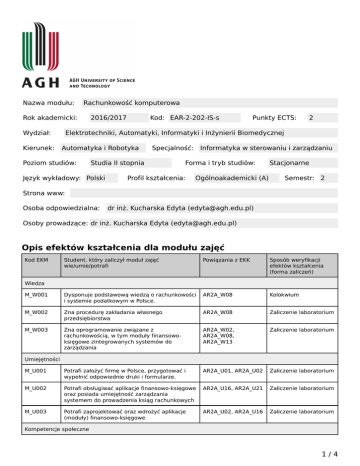 Nazwa modułu: Rachunkowość komputerowa Rok akademicki: Wydział: Kierunek: 2016/2017 Kod: EAR-2-202-IS-s Punkty ECTS: 2 Elektrotechniki, Automatyki, Informatyki i Inżynierii Biomedycznej Automatyka i Robotyka Poziom studiów: Specjalność: Studia II stopnia Język wykładowy: Polski Informatyka w sterowaniu i zarządzaniu Forma i tryb studiów: Profil kształcenia: Ogólnoakademicki (A) Stacjonarne Semestr: 2 Strona www: Osoba odpowiedzialna: dr inż. Kucharska Edyta ([email protected]) Osoby prowadzące: dr inż. Kucharska Edyta ([email protected]) Opis efektów kształcenia dla modułu zajęć Kod EKM Student, który zaliczył moduł zajęć wie/umie/potrafi Powiązania z EKK Sposób weryfikacji efektów kształcenia (forma zaliczeń) M_W001 Dysponuje podstawową wiedzą o rachunkowości i systemie podatkowym w Polsce. AR2A_W08 Kolokwium M_W002 Zna procedurę zakładania własnego przedsiębiorstwa AR2A_W08 Zaliczenie laboratorium M_W003 Zna oprogramowanie związane z rachunkowością, w tym moduły finansowoksięgowe zintegrowanych systemów do zarządzania AR2A_W02, AR2A_W08, AR2A_W13 Zaliczenie laboratorium M_U001 Potrafi założyć firmę w Polsce, przygotować i wypełnić odpowiednie druki i formularze. AR2A_U01, AR2A_U02 Zaliczenie laboratorium M_U002 Potrafi obsługiwać aplikacje finansowo-księgowe oraz posiada umiejętność zarządzania systemem do prowadzenia ksiąg rachunkowych AR2A_U16, AR2A_U21 Zaliczenie laboratorium M_U003 Potrafi zaprojektować oraz wdrożyć aplikacje (moduły) finansowo-księgowe AR2A_U02, AR2A_U16 Zaliczenie laboratorium Wiedza Umiejętności Kompetencje społeczne 1/4 Karta modułu - Rachunkowość komputerowa M_K001 Zna rolę rachunkowości w prowadzeniu własnej działalności gospodarczej w Polsce oraz w systemach wspomagających zarządzanie przedsiębiorstwami. AR2A_K01 Kolokwium, Zaliczenie laboratorium Matryca efektów kształcenia w odniesieniu do form zajęć Konwersatori um Zajęcia seminaryjne Zajęcia praktyczne Zajęcia terenowe Zajęcia warsztatowe Dysponuje podstawową wiedzą o rachunkowości i systemie podatkowym w Polsce. + - - - - - - - - - - M_W002 Zna procedurę zakładania własnego przedsiębiorstwa + - - - - - - - - - - M_W003 Zna oprogramowanie związane z rachunkowością, w tym moduły finansowoksięgowe zintegrowanych systemów do zarządzania + - + - - - - - - - - M_U001 Potrafi założyć firmę w Polsce, przygotować i wypełnić odpowiednie druki i formularze. - - + - - - - - - - - M_U002 Potrafi obsługiwać aplikacje finansowo-księgowe oraz posiada umiejętność zarządzania systemem do prowadzenia ksiąg rachunkowych - - + - - - - - - - - M_U003 Potrafi zaprojektować oraz wdrożyć aplikacje (moduły) finansowo-księgowe - - + - - - - - - - - + - - - - - - - - - - E-learning Ćwiczenia projektowe M_W001 Inne Ćwiczenia laboratoryjne Forma zajęć Ćwiczenia audytoryjne Student, który zaliczył moduł zajęć wie/umie/potrafi Wykład Kod EKM Wiedza Umiejętności Kompetencje społeczne M_K001 Zna rolę rachunkowości w prowadzeniu własnej działalności gospodarczej w Polsce oraz w systemach wspomagających zarządzanie przedsiębiorstwami. Treść modułu zajęć (program wykładów i pozostałych zajęć) 2/4 Karta modułu - Rachunkowość komputerowa Wykład System podatkowy w Polsce. Zakładanie własnego przedsiębiorstwa: formy własności przedsiębiorstw, proces rejestracyjny nowego podmiotu gospodarczego. Ewidencja podatkowa: karta podatkowa, ryczałt od przychodów ewidencjonowanych, księga przychodów i rozchodów. Ewidencje pomocnicze. Księgi rachunkowe: zasady prowadzenia ksiąg rachunkowych, ewidencja operacji gospodarczych (konto księgowe, zasada zapisu operacji na konta księgowe, plan kont), sprawozdania finansowe. Podatek VAT – charakterystyka, stawki, ewidencjonowanie. Prowadzenie księgowości za pomocą komputera: wymogi prawne, komputerowy zapis księgowy, wydruki i zestawienia komputerowe, cyfrowe księgi rachunkowe i nośniki dla nich, zabezpieczenie baz danych. Budowa modułów finansowo-księgowych w zintegrowanych systemach do zarządzania. Wdrażanie (konfigurowanie) modułów finansowo-księgowych. Obieg informacji i kompleksowe przetwarzanie danych rachunkowości obejmujące całość prac ewidencyjnych, rachunku kosztów i sprawozdawczości w zintegrowanych systemach do zarządzania. Ćwiczenia laboratoryjne W trakcie zajęć laboratoryjnych studenci wykonują zadania praktyczne ugruntowujące i rozszerzają wiedzę przekazywaną podczas wykładów. Dokonują przeglądu oraz analizy porównawczej dostępnego na rynku oprogramowania związanego z rachunkowością przedsiębiorstw. Zapoznają się ze strukturą oraz funkcjonowaniem modułu finansowo-księgowego oraz powiązanymi z nim modułami wybranego zintegrowanego systemu do zarządzania przedsiębiorstwem (np. CDN-XL, CDNOptima, IFS – Finanse). Sposób obliczania oceny końcowej 1. Warunkiem uzyskania zaliczenia jest obecność na ćwiczeniach laboratoryjnych oraz uzyskanie pozytywnej oceny z tych zajęć. Więcej niż jedna nieobecność nieusprawiedliwiona powoduje brak zaliczenia przedmiotu, przy czym nieobecności usprawiedliwić należy w terminie do 2 tygodni (licząc od końca okresu nieobecności). W przypadku dłuższych lub częstych nieobecności usprawiedliwionych (3 lub więcej) należy zgłosić się do prowadzącego w celu ustalenia sposobu nadrobienia i zaliczenia zaległości. 2. Ocena z ćwiczeń laboratoryjnych jest wyznaczana jako średnia ze wszystkich ocen i kolokwiów uzyskanych w trakcie zajęć. Jeżeli w trakcie procedury zaliczania prowadzący stwierdzi niesamodzielność pracy studenta lub korzystanie przez niego z niedozwolonych materiałów, student otrzymuje ocenę niedostateczną z tego zaliczenia. 3. Student ma prawo do jednego poprawkowego zaliczenia ćwiczeń laboratoryjnych w przypadku braku więcej niż jednej nieobecności nieusprawiedliwionej. 4. Zasadniczo ocena końcowa p