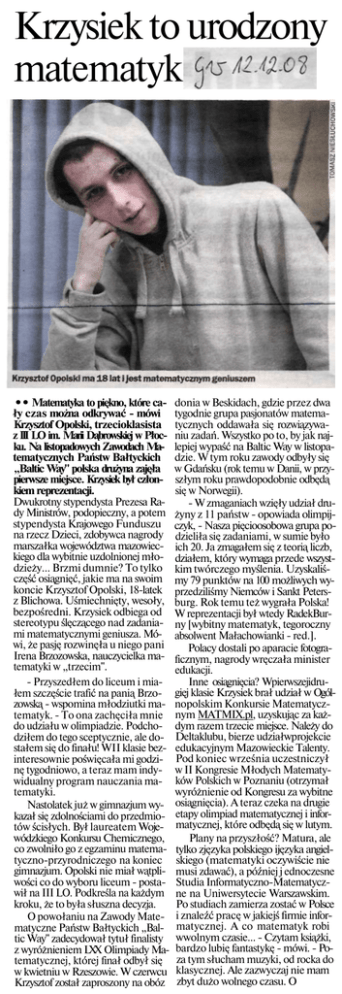 Krzysiek to urodzony matematyk •• Matematyka to piękno, które ca ły czas można odkrywać - mówi Krzysztof Opolski, trzecioklasista z III LO im. Marii Dąbrowskiej w Płoc ku. Na listopadowych Zawodach Ma tematycznych Państw Bałtyckich „Baltic Way" polska drużyna zajęła pierwsze miejsce. Krzysiek był człon kiem reprezentacji. Dwukrotny stypendysta Prezesa Ra dy Ministrów, podopieczny, a potem stypendysta Krajowego Funduszu na rzecz Dzieci, zdobywca nagrody marszałka województwa mazowiec kiego dla wybitnie uzdolnionej mło dzieży... Brzmi dumnie? To tylko część osiągnięć, jakie ma na swoim koncie Krzysztof Opolski, 18-latek z Blichowa. Uśmiechnięty, wesoły, bezpośredni. Krzysiek odbiega od stereotypu ślęczącego nad zadania mi matematycznymi geniusza. Mó wi, że pasję rozwinęła u niego pani Irena Brzozowska, nauczycielka ma tematyki w „trzecim". - Przyszedłem do liceum i mia łem szczęście trafić na panią Brzo zowską - wspomina młodziutki ma tematyk. - To ona zachęciła mnie do udziału w olimpiadzie. Podcho dziłem do tego sceptycznie, ale do stałem się do finału! WII klasie bez interesownie poświęcała mi godzi nę tygodniowo, a teraz mam indy widualny program nauczania ma tematyki. Nastolatek już w gimnazjum wy kazał się zdolnościami do przedmio tów ścisłych. Był laureatem Woje wódzkiego Konkursu Chemicznego, co zwolniło go z egzaminu matematyczno-przyrodniczego na koniec gimnazjum. Opolski nie miał wątpli wości co do wyboru liceum - posta wił na III LO. Podkreśla na każdym kroku, że to była słuszna decyzja. O powołaniu na Zawody Mate matyczne Państw Bałtyckich „Bal tic Way" zadecydował tytuł finalisty z wyróżnieniem LXX Olimpiady Ma tematycznej, której finał odbył się w kwietniu w Rzeszowie. W czerwcu Krzysztof został zaproszony na obóz donia w Beskidach, gdzie przez dwa tygodnie grupa pasjonatów matema tycznych oddawała się rozwiązywa niu zadań. Wszystko po to, by jak naj lepiej wypaść na Baltic Way w listopa dzie. W tym roku zawody odbyły się w Gdańsku (rok temu w Danii, w przy szłym roku prawdopodobnie odbędą się w Norwegii). - W zmaganiach wzięły udział dru żyny z 11 państw - opowiada olimpij czyk, - Nasza pięcioosobowa grupa po dzieliła się zadaniami, w sumie było ich 20. Ja zmagałem się z teorią liczb, działem, który wymaga przede wszyst kim twórczego myślenia. Uzyskaliś my 79 punktów na 100 możliwych wy przedziliśmy Niemców i Sankt Peters burg. Rok temu też wygrała Polska! W reprezentacji był wtedy RadekBurny [wybitny matematyk, tegoroczny absolwent Małachowianki - red.]. Polacy dostali po aparacie fotogra ficznym, nagrody wręczała minister edukacji. Inne osiągnięcia? Wpierwszejidrugięj klasie Krzysiek brał udział w Ogól nopolskim Konkursie Matematycz nym MATMIX.pl, uzyskując za każ dym razem trzecie miejsce. Należy do Deltaklubu, bierze udziałwprojekcie edukacyjnym Mazowieckie Talenty. Pod koniec września uczestniczył w II Kongresie Młodych Matematy ków Polskich w Poznaniu (otrzymał wyróżnienie od Kongresu za wybitne osiągnięcia). A teraz czeka na drugie etapy olimpiad matematycznej i infor matycznej, które odbędą się w lutym. Plany na przyszłość? Matura, ale tylko zjęzyka polskiego ijęzyka angiel skiego (matematyki oczywiście nie musi zdawać), a później j ednoczesne Studia Informatyczno-Matematyczne na Uniwersytecie Warszawskim. Po studiach zamierza zostać w Polsce i znaleźć pracę w jakiejś firmie infor matycznej. A co matematyk robi wwolnym czasie... - Czytam książki, bardzo lubię fantastykę - mówi. - Po za tym słucham muzyki, od rocka do klasycznej. Ale zazwyczaj nie mam zbyt dużo wolnego czasu. O