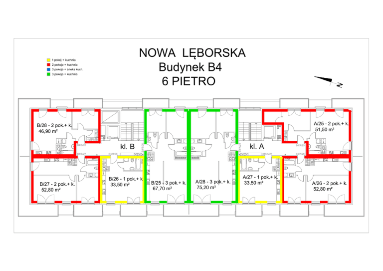 Budynek B4 6 PIETRO 2 pokoje + kuchnia 3 pokoje + aneks kuch. 3 pokoje + kuchnia A/25 - 2 pok.+ k. B4/B/27 B4/B/25 kl. B B4/B/28 B4/B/26 B/26 - 1 pok.+ k. B/27 - 2 pok.+ k. B4/A/28 B/28 - 2 pok.+ k. kl. A B4/A/27 B4/A/25 B4/A/26 A/27 - 1 pok.+ k. B/25 - 3 pok.+ k. A/28 - 3 pok.+ k. A/26 - 2 pok.+ k.